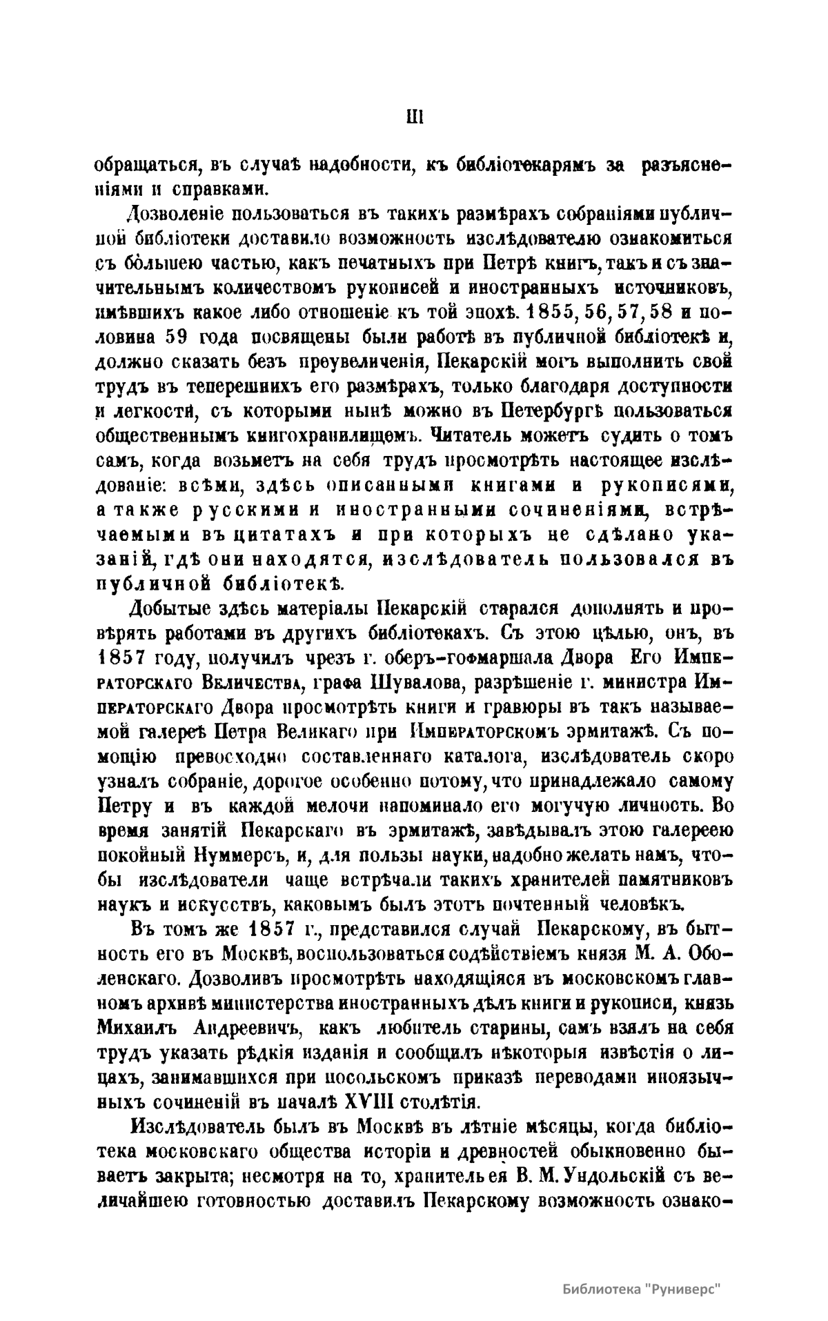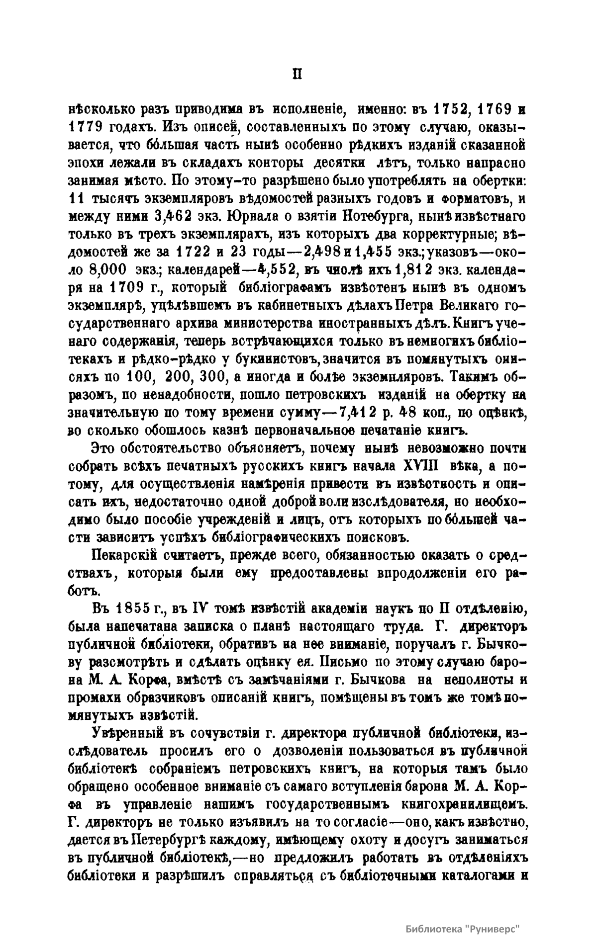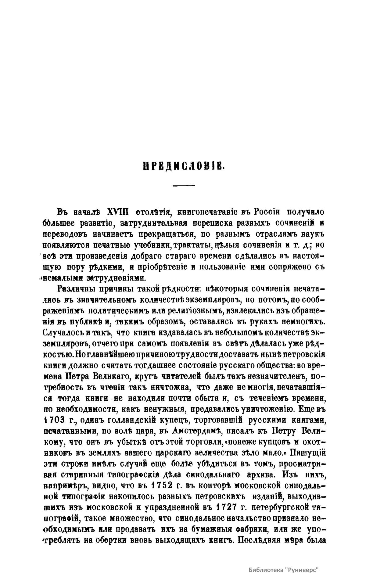 Сочинение, удостоенное от Академии наук полной демидовской премии. Первая часть настоящего исследования заключает в себе введение в историю русского просвещения начала XVIII столетия. Работая над этой частью, автор не ограничился только печатными памятниками эпохи, он собирал все доступные ему сведения о школах, о состоянии наук, о степени влияния европейского образования, противодействии при том старины и т.п. Вторая часть посвящена исследованию о тогдашних русских типографиях и описанию произведений, которые там печатались со времени первого путешествия Петра Великого по Европе до его кончины, то есть с 1698-го по 1725 год.