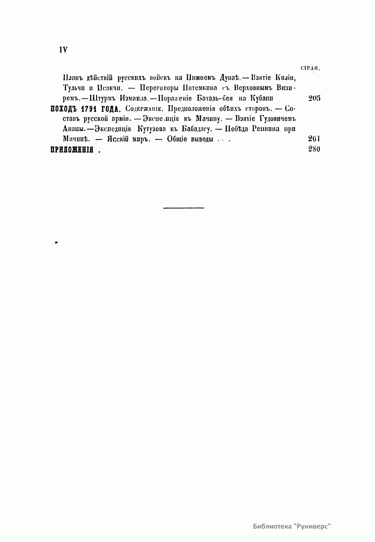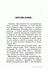 В настоящем сочинении подробно описаны две русско-турецкие войны в царствование императрицы Екатерины II (1769 – 1774; 1787 – 1791). К изданию прилагаются: карта пространства, служившего главным театром описанных войн; планы сражений при Кагуле и Рымнике; план Измаильского штурма. Потемкин Григорий Александрович (1739 – 1791) – русский государственный и военный деятель, генерал-фельдмаршал, организатор дворцового переворота 1762 г., фаворит и ближайший помощник Екатерины II. Способствовал освоению Северного Причерноморья, руководил строительством Черноморского флота. После присоединения Крыма получил титул светлейшего князя Таврического. Главнокомандующий русской армией в русско-турецкой войне 1787 – 1791 гг. Румянцев-Задунайский Петр Александрович (1725 – 1796) – граф (1744), русский полководец, генерал-фельдмаршал (1770). В Семилетней войне овладел крепостью Кольберг (Колобжег). С 1764 г. – президент Малороссийской коллегии. В русско-турецкой войне 1768 – 1774 гг. одержал победы при Рябой Могиле, Ларге и Кагуле (1770). Впервые применил сочетание каре, колонн и легких батальонов, положив начало зарождению новой тактики колонн и рассыпного строя. Имеет военно-теоретические работы. Суворов Александр Васильевич (1729 или 1730 – 1800), граф Рымникский (1789), князь Италийский (1799), русский полководец, генералиссимус (1799). Начал службу капралом в 1748 г. Участник семилетней войны. Во время русско-турецких войн (1749 – 1774, 1787 – 1791) одержал победы при Козлудже (1774), Кинбурне (1787), Фокшанах (1789), Рымнике (1789) и штурмом овладел крепостью Измаил (1790). При императоре Павле I в опале. В 1799 г. блестяще провел Итальянский и Швейцарские походы, разбив французские войска на рр. Адда и Требия и при Нови, а затем перешел швейцарские Альпы и вышел из окружения. Автор военно-теоретических работ. Создал оригинальную и прогрессивную систему взглядов на способы ведения войны и боя, воспитания и обучения войск, во многом опередив свое время. Стратегия Суворова носила наступательный характер, ставила главной задачей полный разгром противника в полевом сражении. Развил тактику колонн и рассыпного строя. Не проиграл ни одного сражения.
