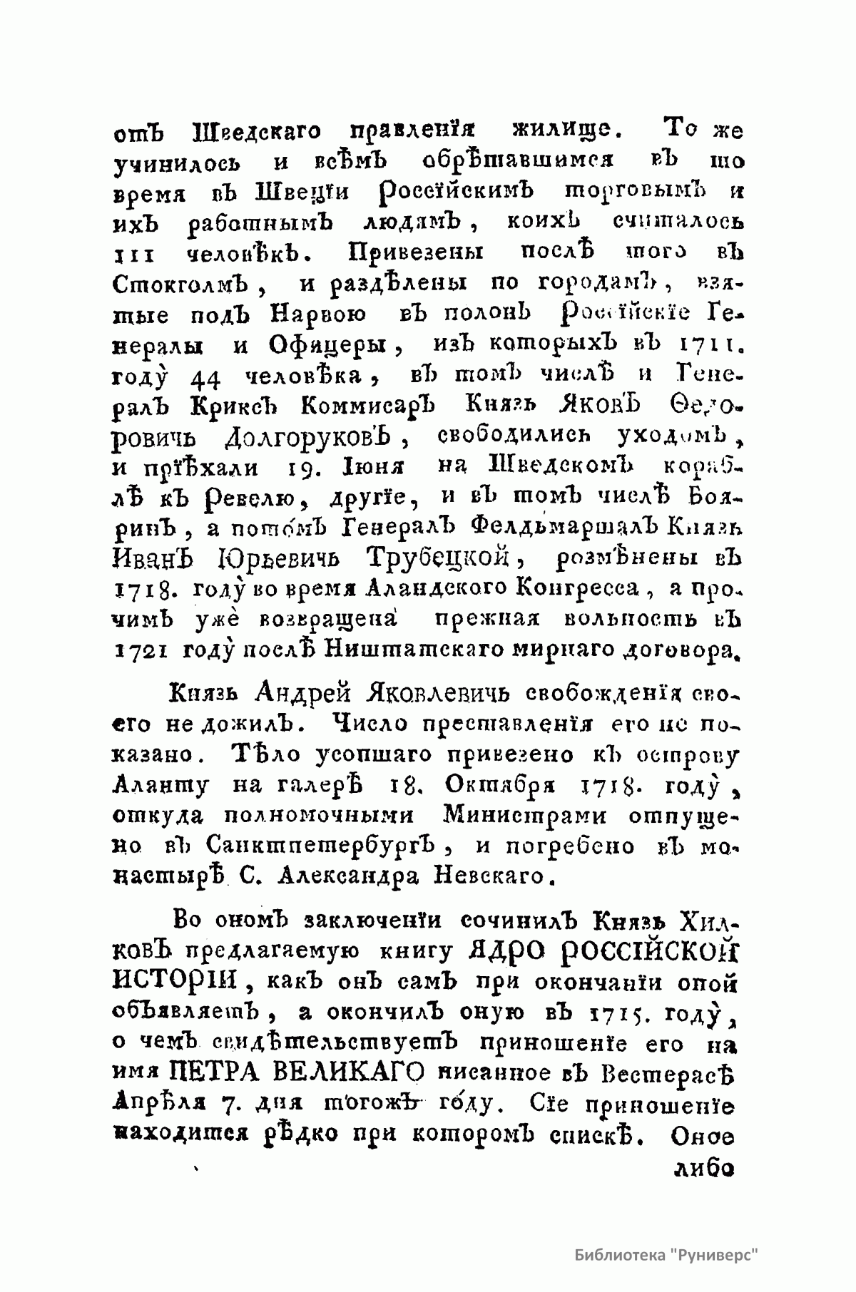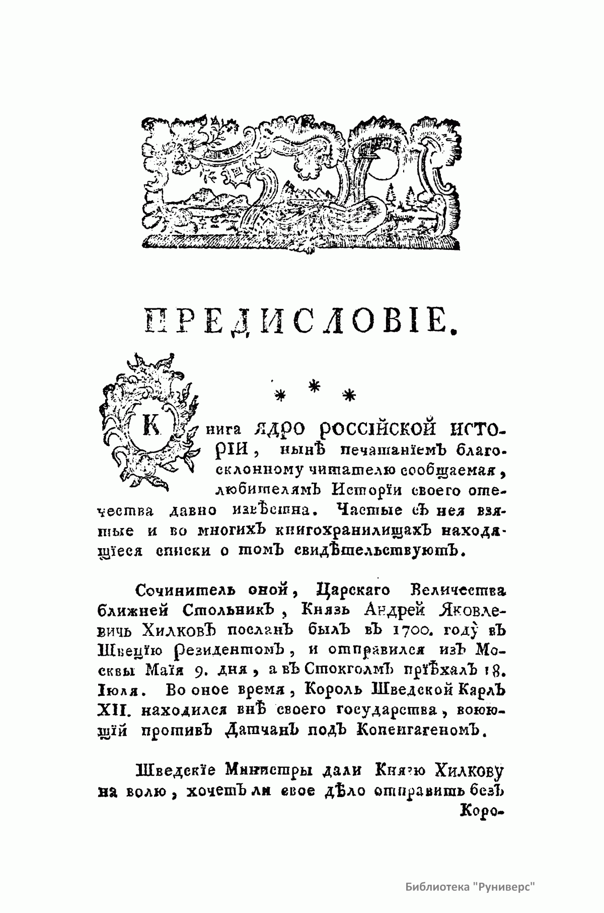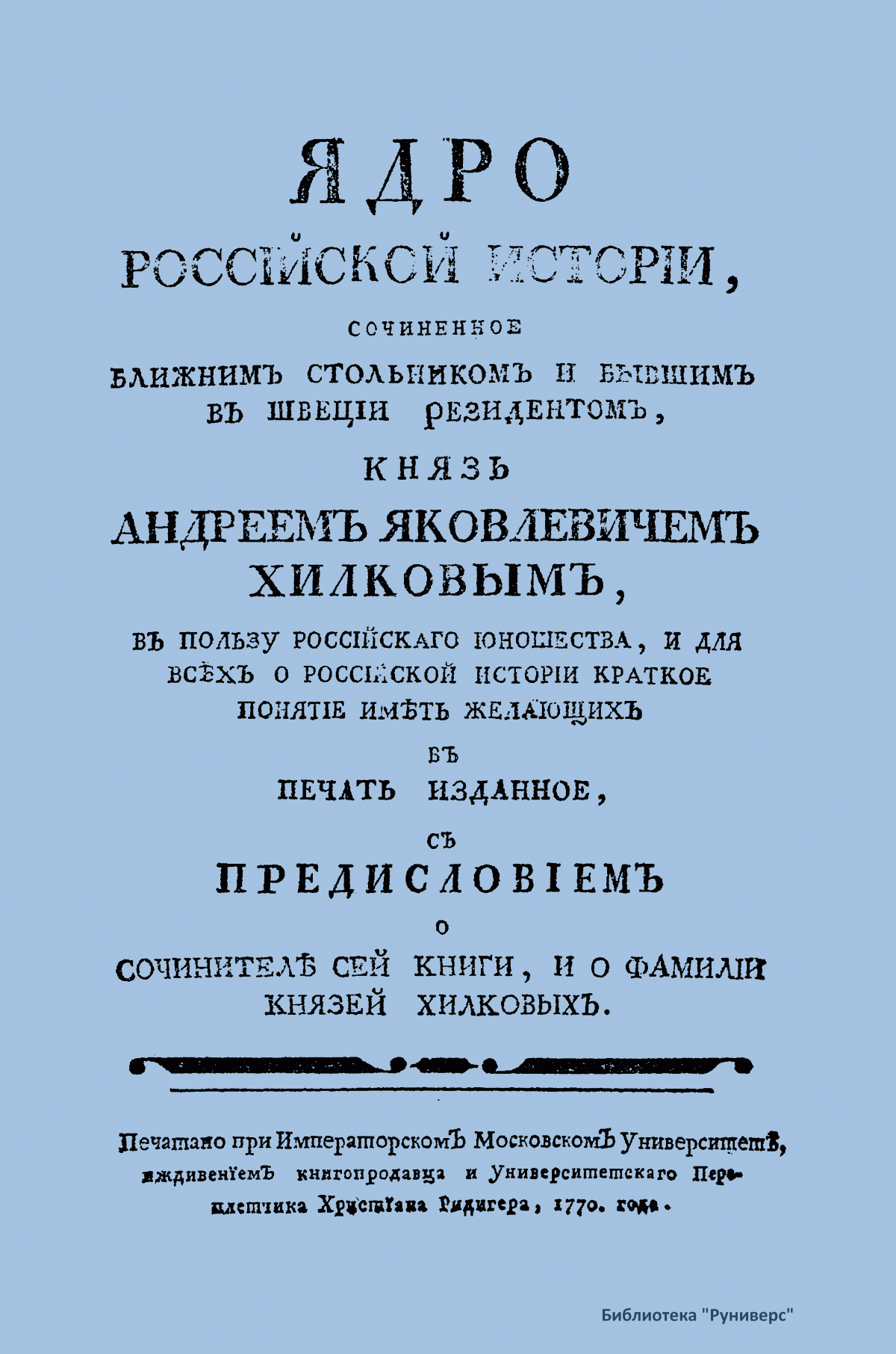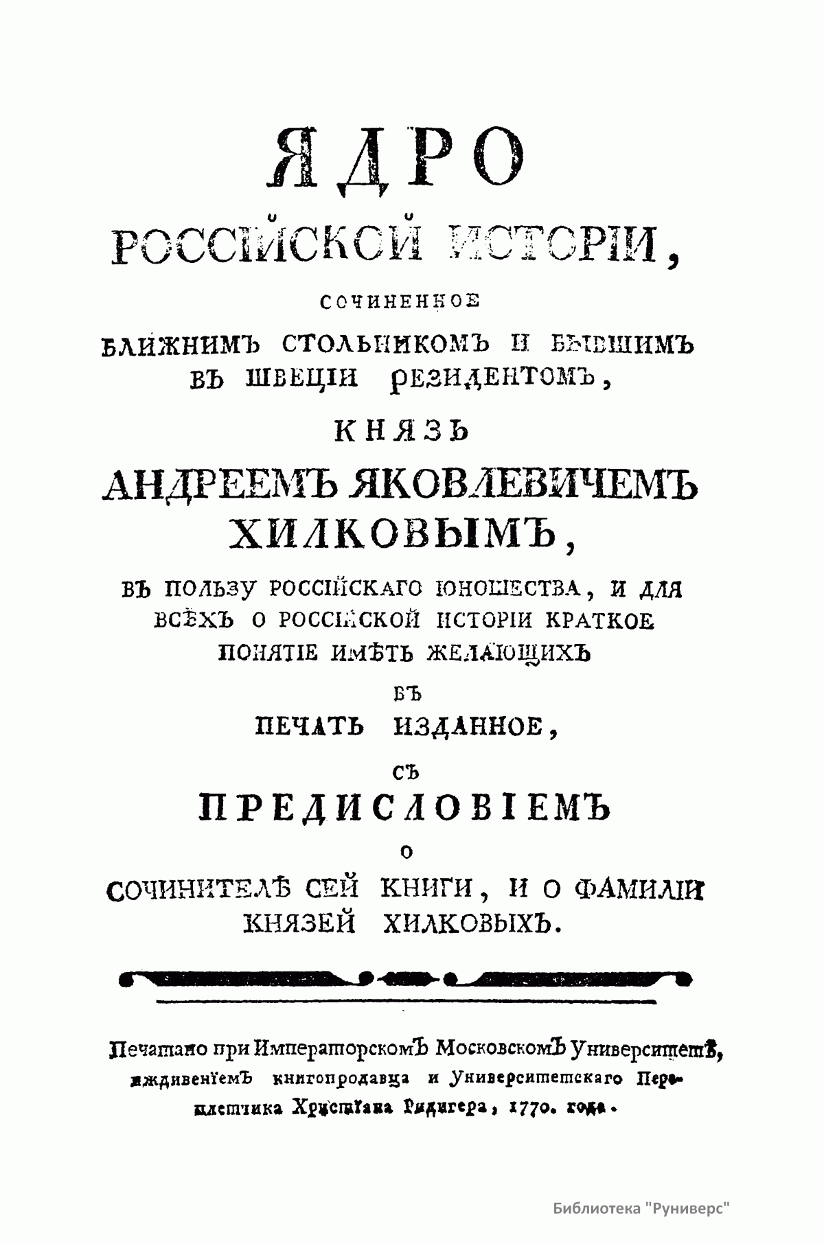 Краткая российская история от Рюрика до Петра Великого. Предисловие академика и историографа Миллера содержит сведения об авторе книги и родословную князей Хилковых.
