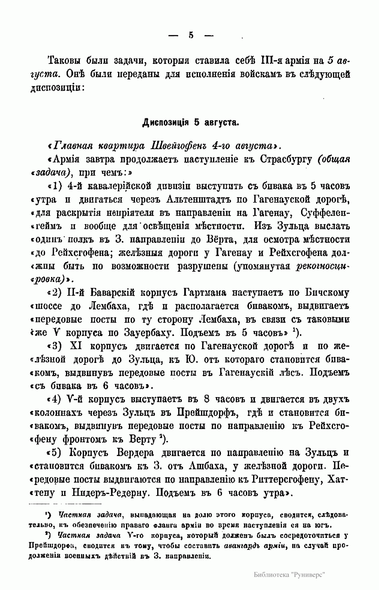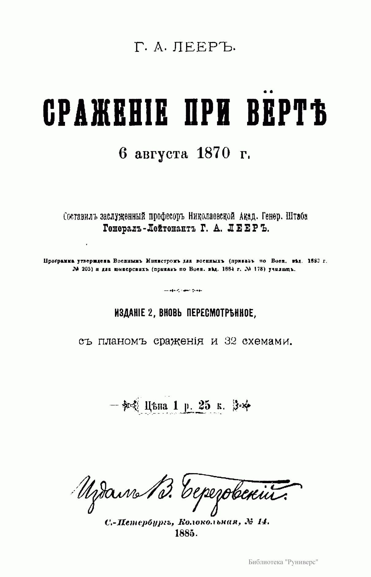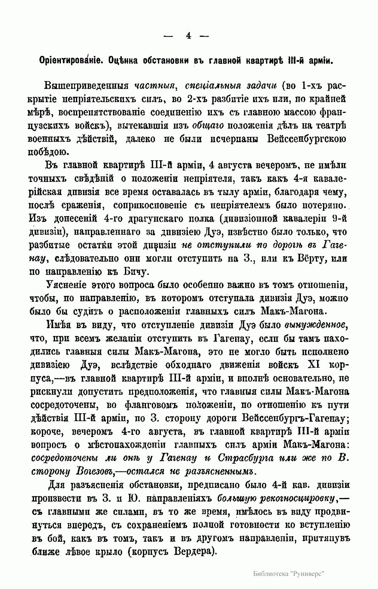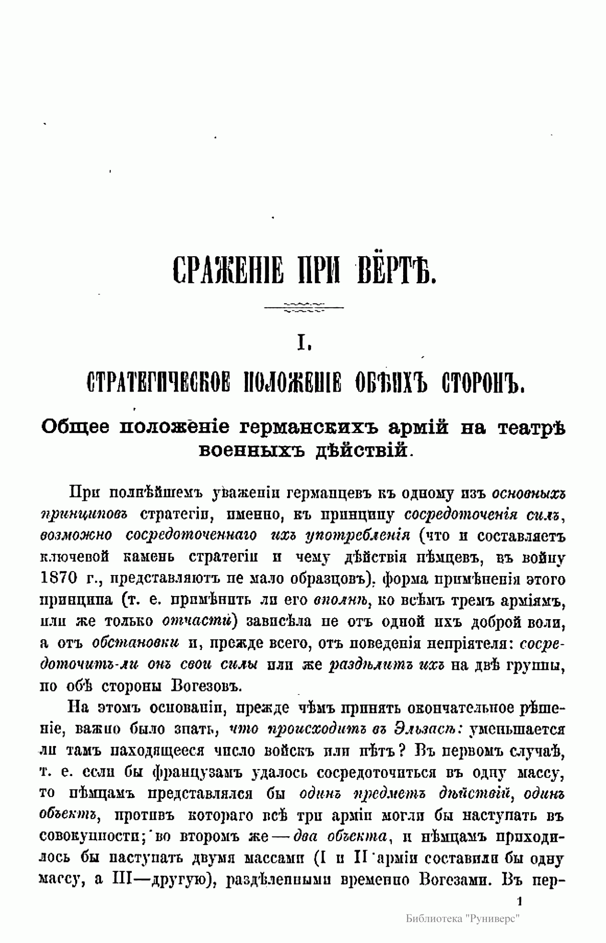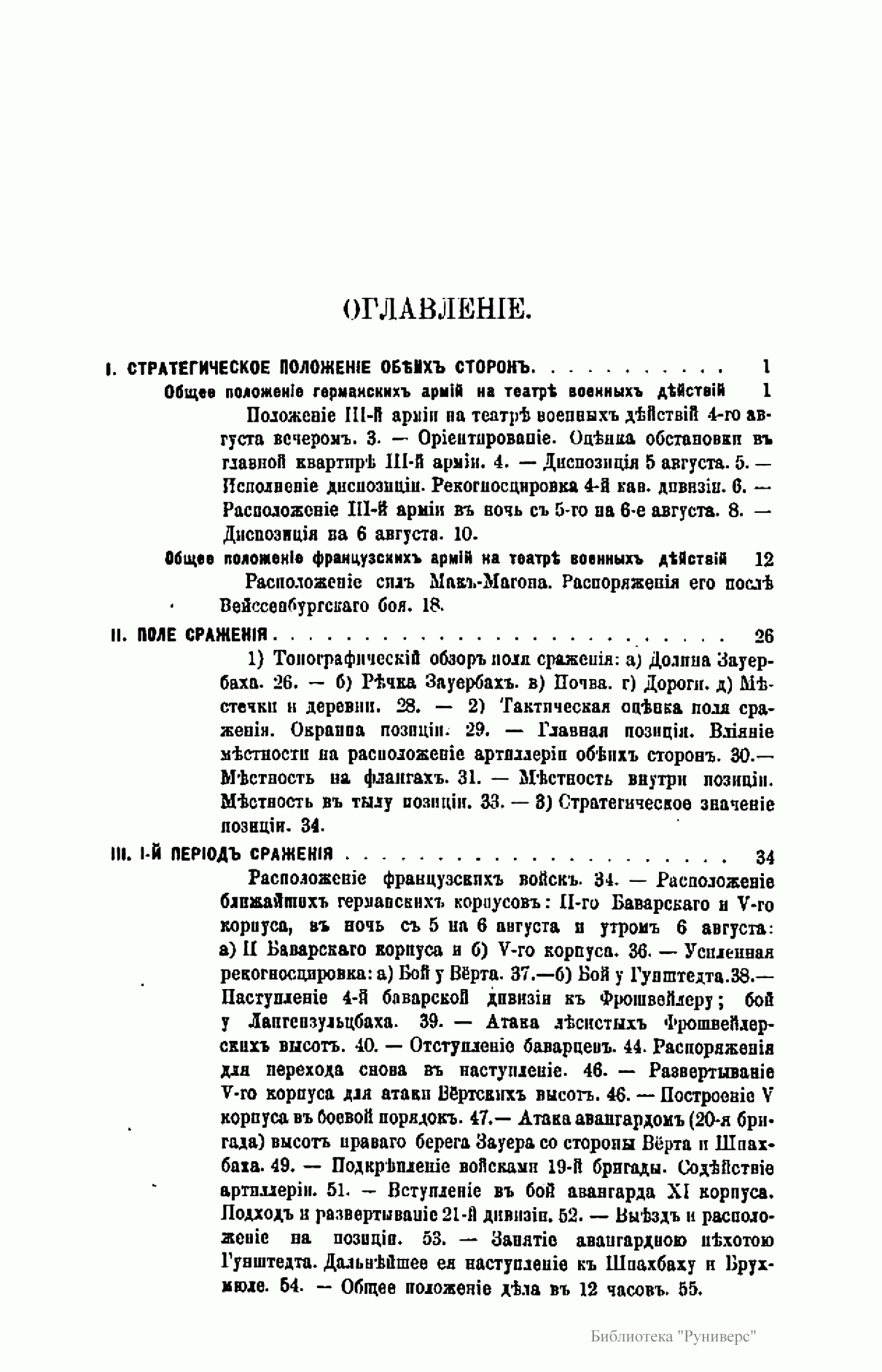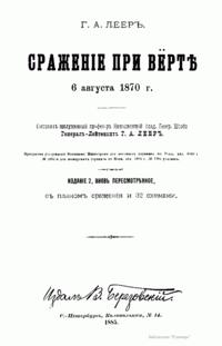 Издание посвящено сражению при Вёрте, происходившему во время франко-прусской войны 1870 – 1871 гг. Франко-прусская война 1870 – 1871 гг. – война между Францией, стремившейся сохранить свою гегемонию в Европе и препятствовавшей объединению Германии, и Пруссией, выступившей совместно с рядом других германских государств. В ходе войны прусские войска оккупировали значительную часть территории Франции, участвовали в подавлении Парижской Коммуны 1871 г. Война завершилась Франкфуртским мирным договором 1871 г., по которому Франция передавала Германии Эльзас и северо-восточную часть Лотарингии, а также обязалась выплатить 5 млрд. франков контрибуции. В итоге франко-прусской войны было завершено объединение Германии под гегемонией Пруссии, во Франции рухнул режим Второй империи и возникла Третья республика. Сражение при Вёрте (городок на реке Зауер) – сражение между французскими войсками под командованием Мак-Магона и прусскими войсками под командованием фон Блюменталя, в котором Мак-Магон потерпел полное поражение. Автор описывает стратегическое положение обеих сторон; поле сражения; два периода сражения и преследование побежденного противника.