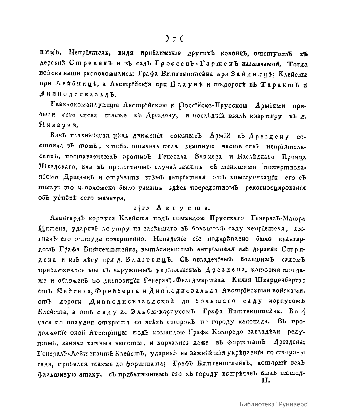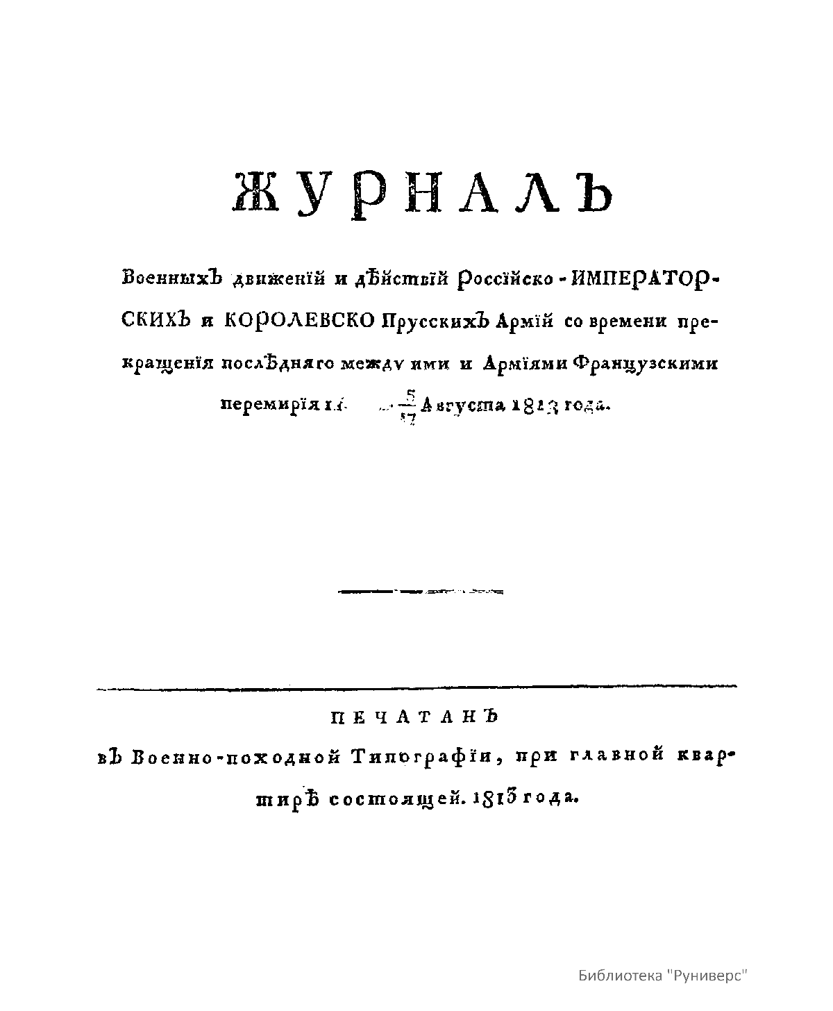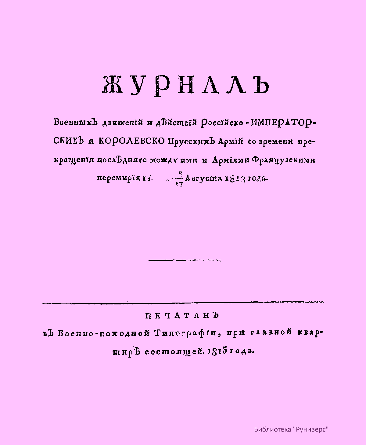 Журналъ Военныхъ движенiй и дѣйствiй Россiйско-императорскихъ и королевско Прусскихъ армiй со времени прекращенiя послѣдняго между ими и Армiями Французскими перемирiя т.е. с 5/17 Августа 1813 года
