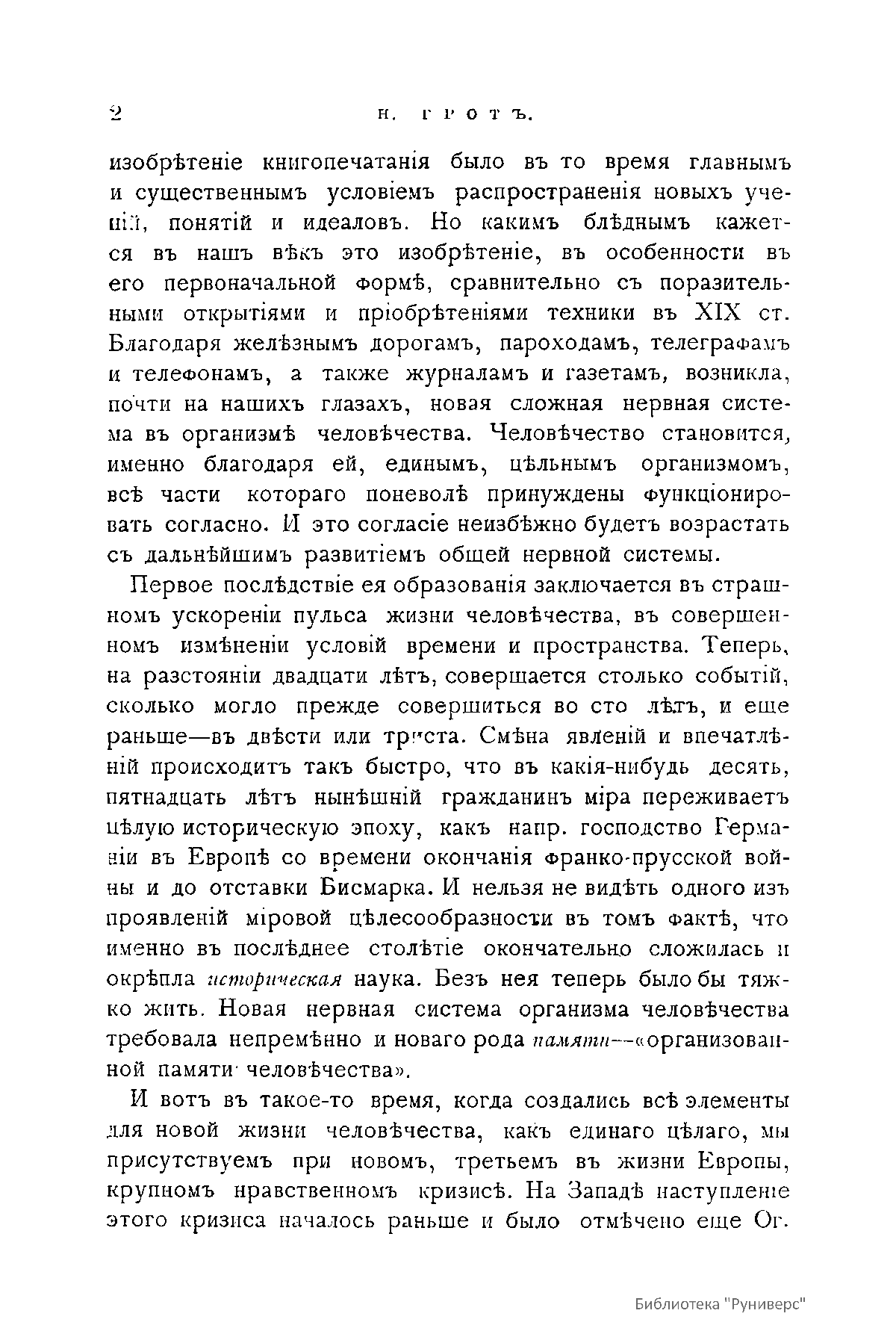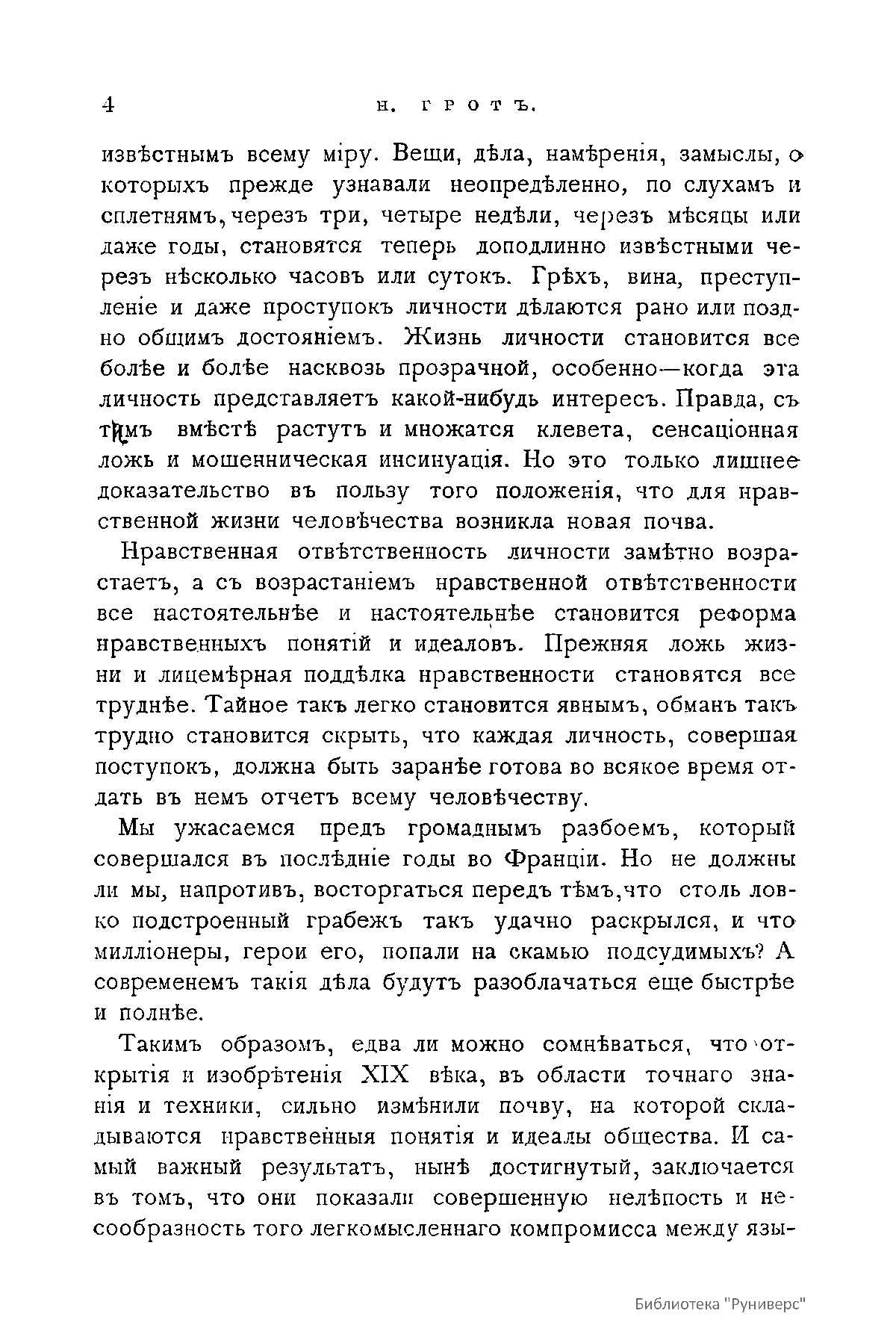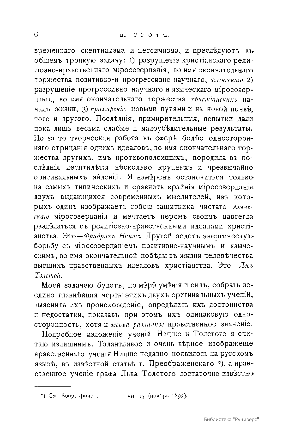 познакомился с Гротом в 1885 г. Знакомство переросло в дружбу и деятельное сотрудничество. В апреле 1885 г. Толстой пишет Черткову: "Познакомился я здесь с Гротом - философом, он мне очень понравился - надеюсь, не только потому, что он разделяет мои взгляды". Еще ранее Грот прислал Толстому свою книжку о Джордано Бруно, на которую Толстой реагировал самым положительным образом. В