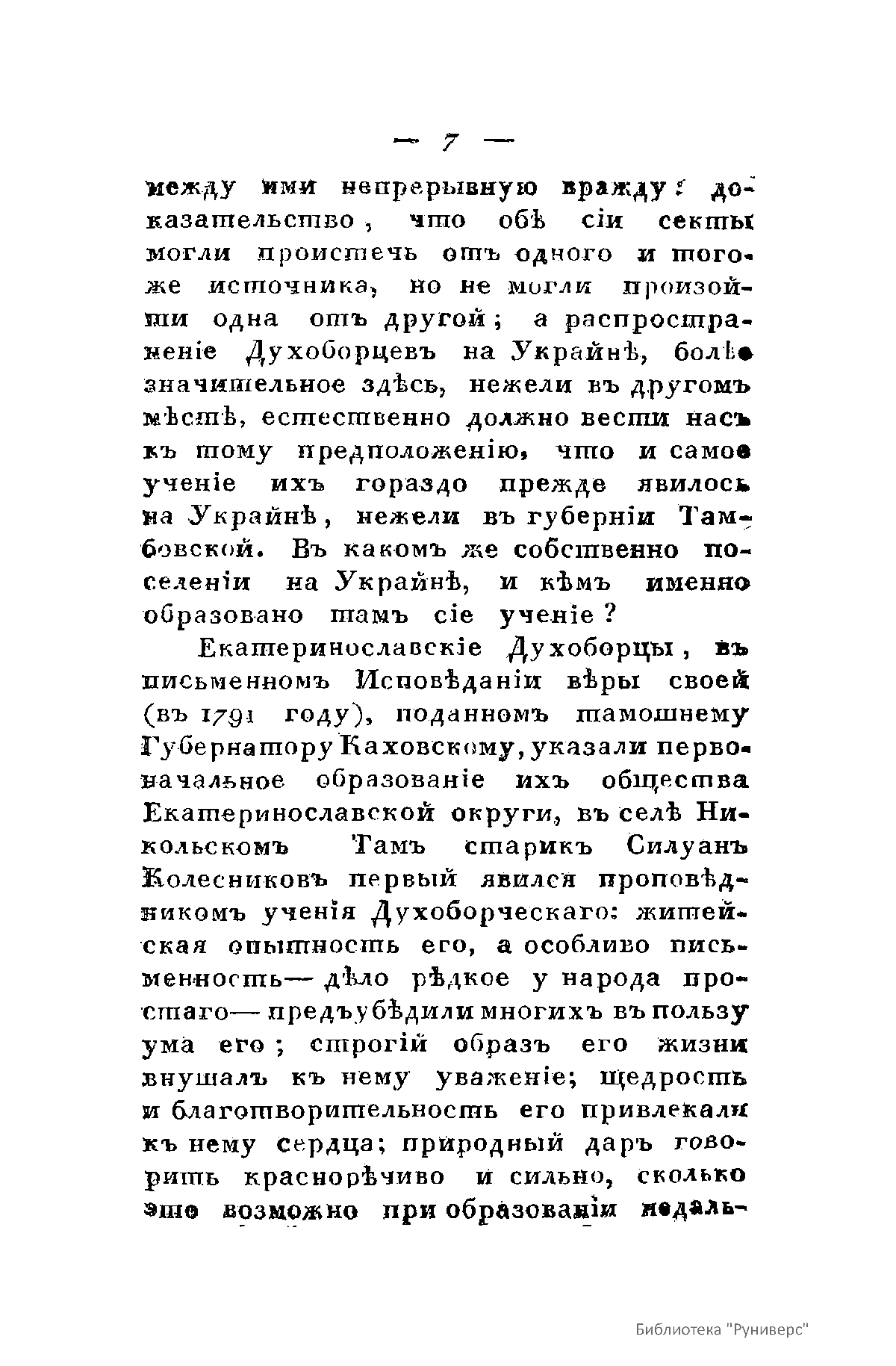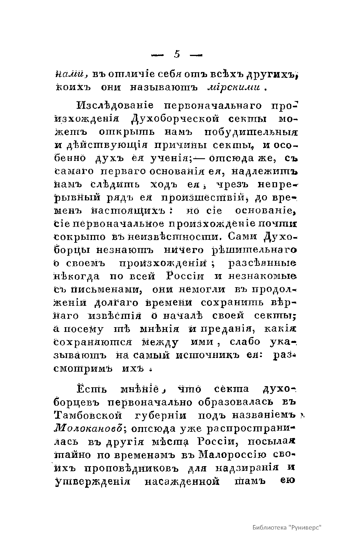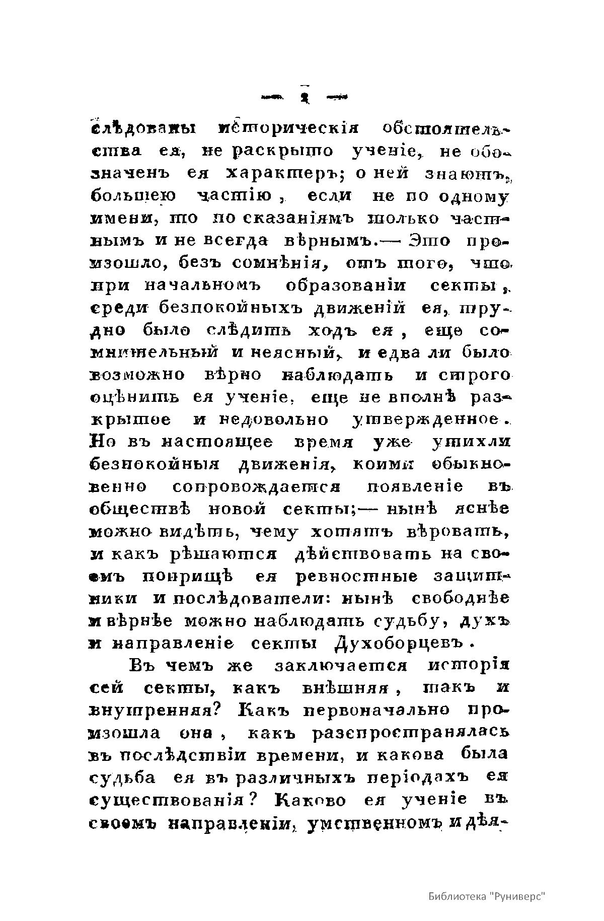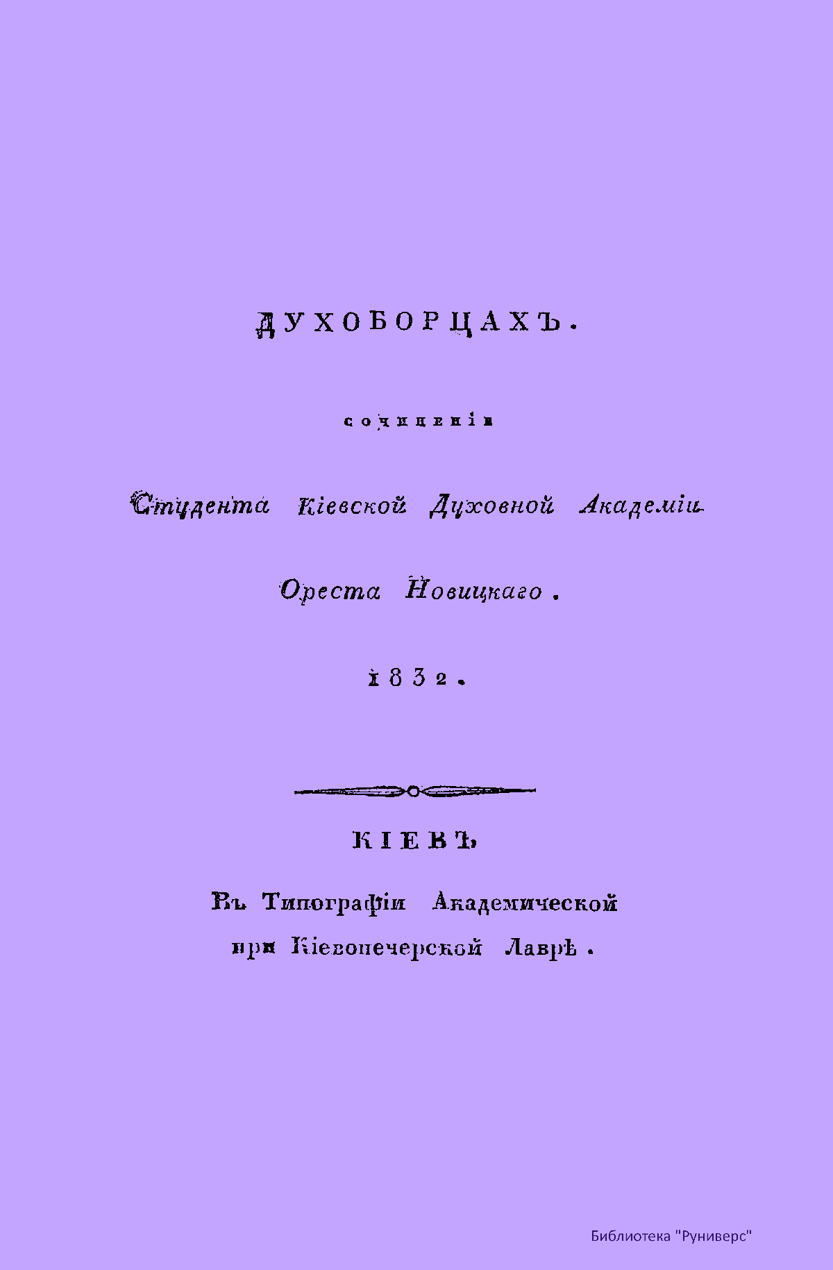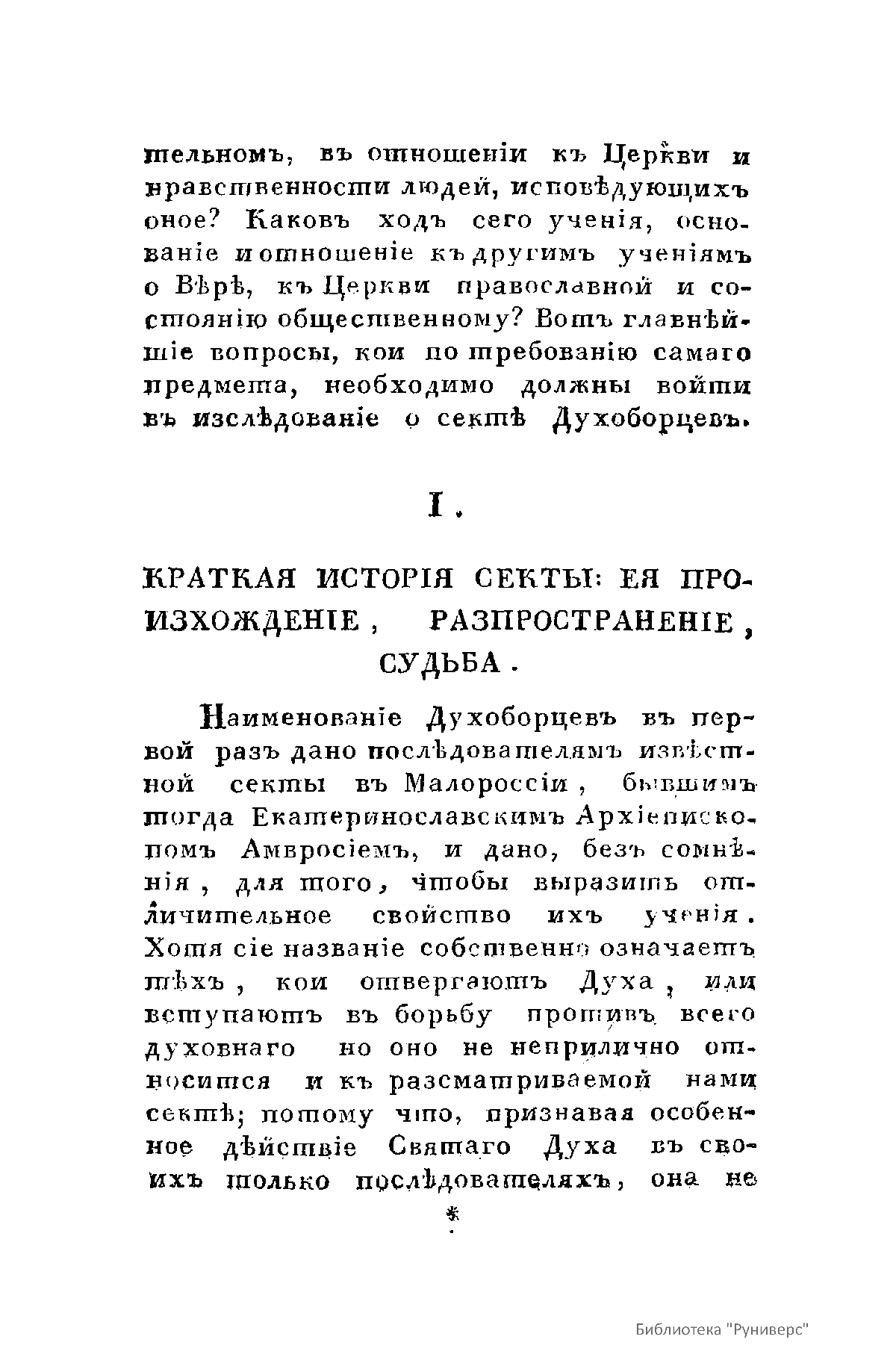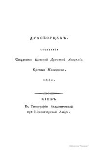 По самому составу своему из двух слов ("дух и борец", соответствуя образованию слова иконо-борец), это направление религиозной мысли означает тех, которые отвергают духа, вступают в борьбу против всего духовного: и духоборцы, отвергая все таинства церкви, по этому уже самому восстают против действующего в ней духа. Но отрицая всю религиозную внешность, они считают себя борцами за духа. Первоначально они называли себя сынами божиими в том предположении, что в них Божество выражается с большею полнотою, чем во всех других людях. Простой народ иногда называл их фармазонами (т. е. франк-масонами), слово, которым он отличает, людей, своевольно нарушающих постановления церкви. Итак, возникнув в лоне православной церкви, она уклонилась от нее дальше всех. При этом долгое время никто вполне не исследовал исторических ее обстоятельств, не раскрыл ее учения, не обозначил ее характера: так что о ней знали или по одному имени, или по частным рассказам. Чтобы пополнить этот пробел в истории религиозных разномыслий, автор постарался изложить как внешнюю, так и внутреннюю историю духоборчества, на сколько это возможно было для него при тех источниках и документах, какие он имел под рукой. В