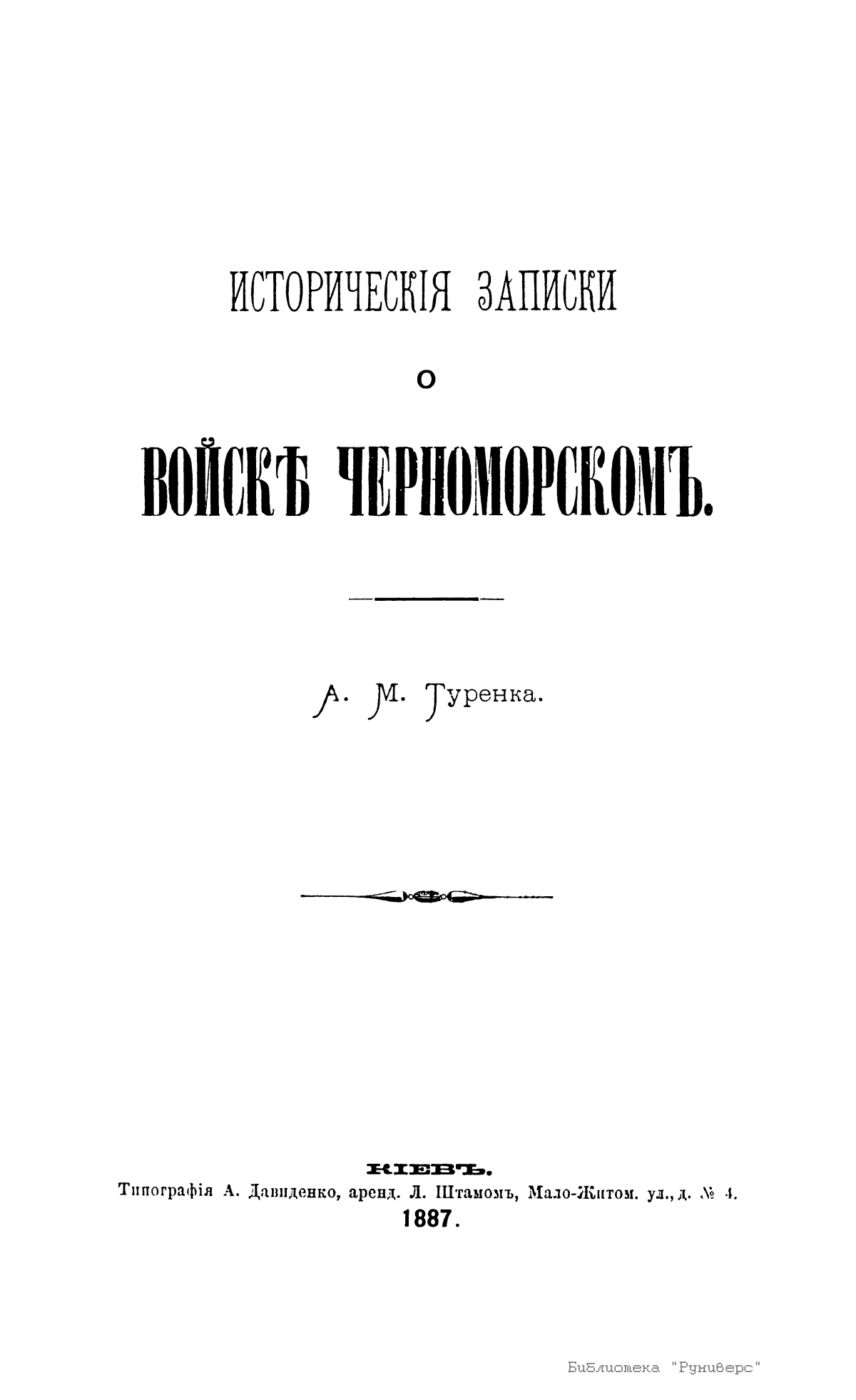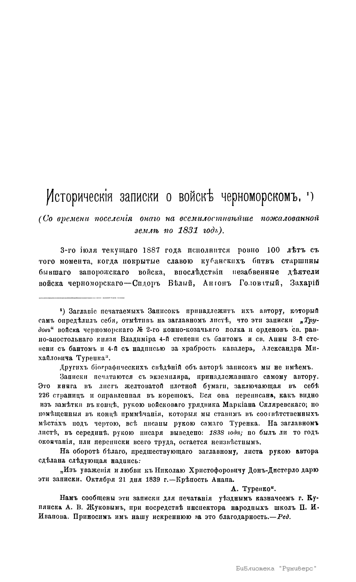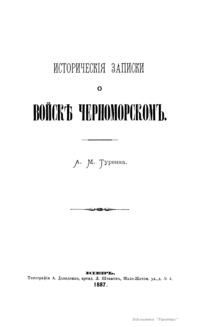 Кавалер Александр Михайлович Туренка описывает историю войска черноморского 2-го конно-казачьего полка с 1787-го по 1831 г. Войско образовано 3 июля 1787 г. В этот день старшины бывшего запорожского войска Сидор Белый, Антон Головатый, Захарий Чепига и др. в Кременчуге получили от проезжавшей по Малороссии императрицы Екатерины в ответ на поднесенное ей прошение именной указ на новое возрождение запорожского войска и временного поселения между рр. Днестром и Бугом. В 1814 г. возрожденное войско заняло Кубанскую область, собственно Черноморию, по правому берегу р. Кубани.