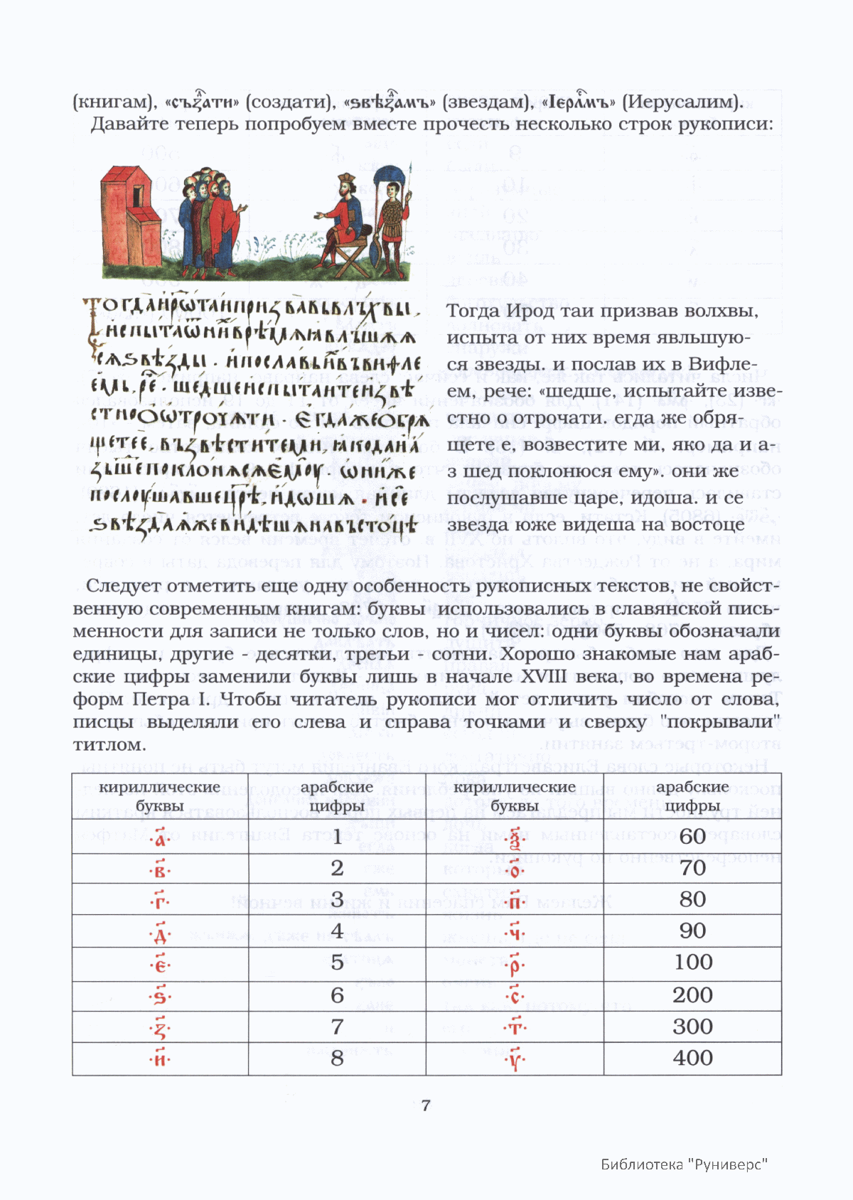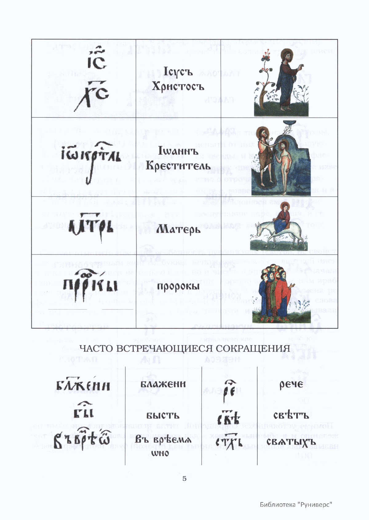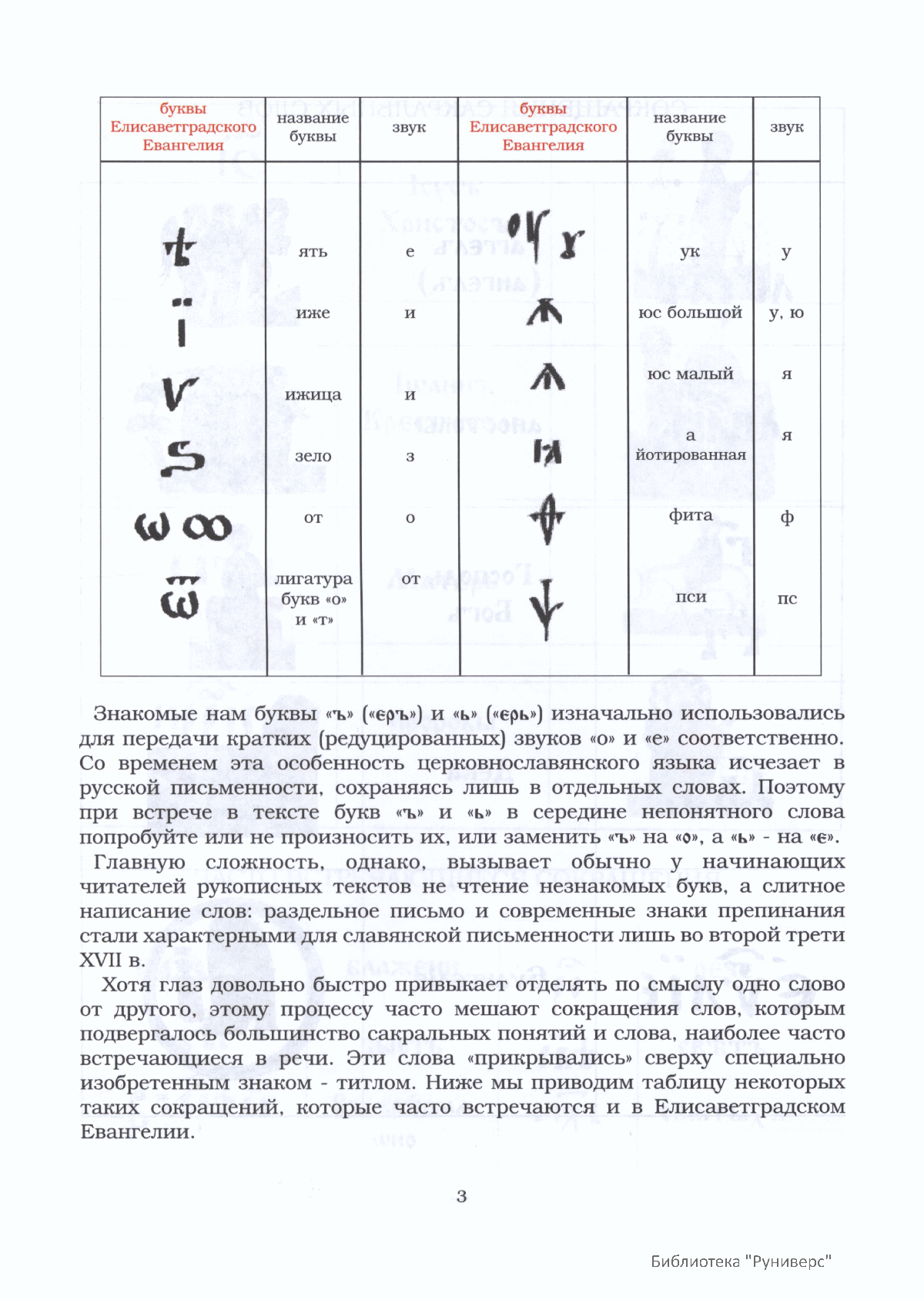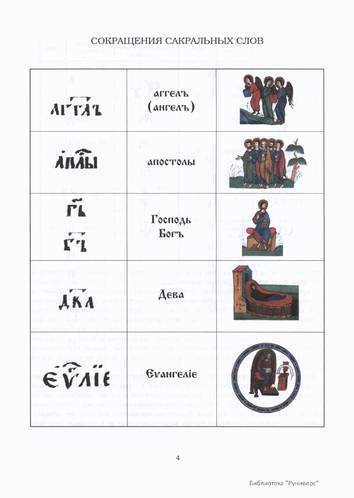 В брошюре говорится о трудностях, которые могут возникнуть у желающих читать славянские рукописи. Приводятся буквы церковнославянского алфавита, сведения о том, как записывались числа, сокращались слова. В издании есть небольшой словарь малопонятных слов.