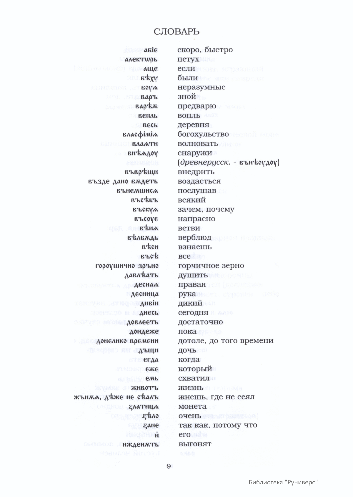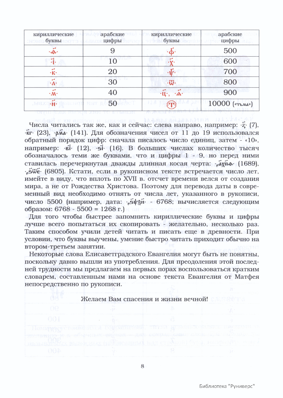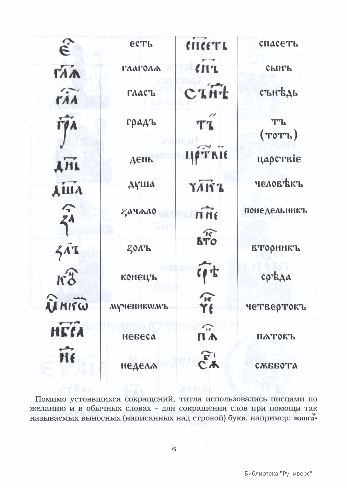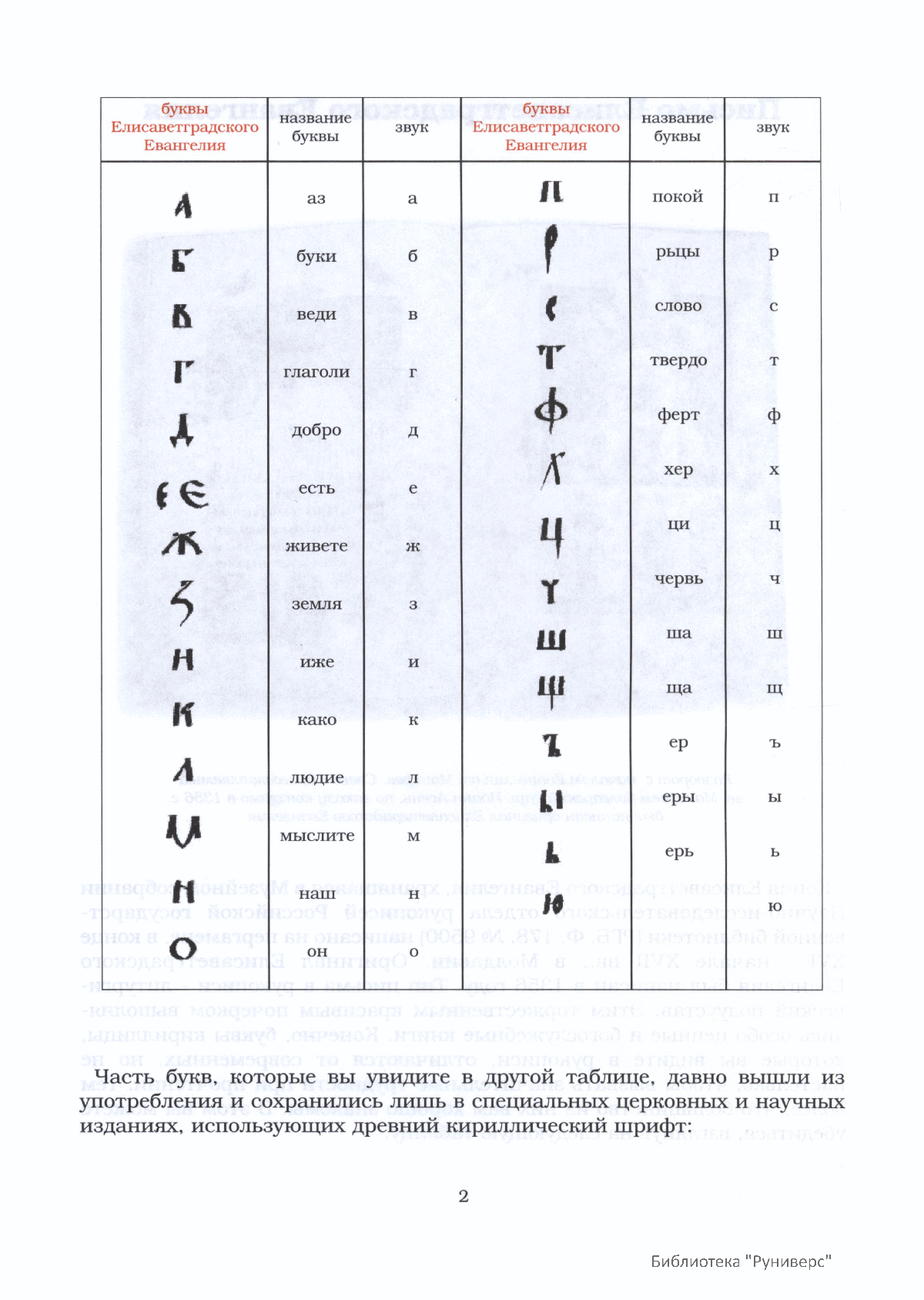 В брошюре говорится о трудностях, которые могут возникнуть у желающих читать славянские рукописи. Приводятся буквы церковнославянского алфавита, сведения о том, как записывались числа, сокращались слова. В издании есть небольшой словарь малопонятных слов.