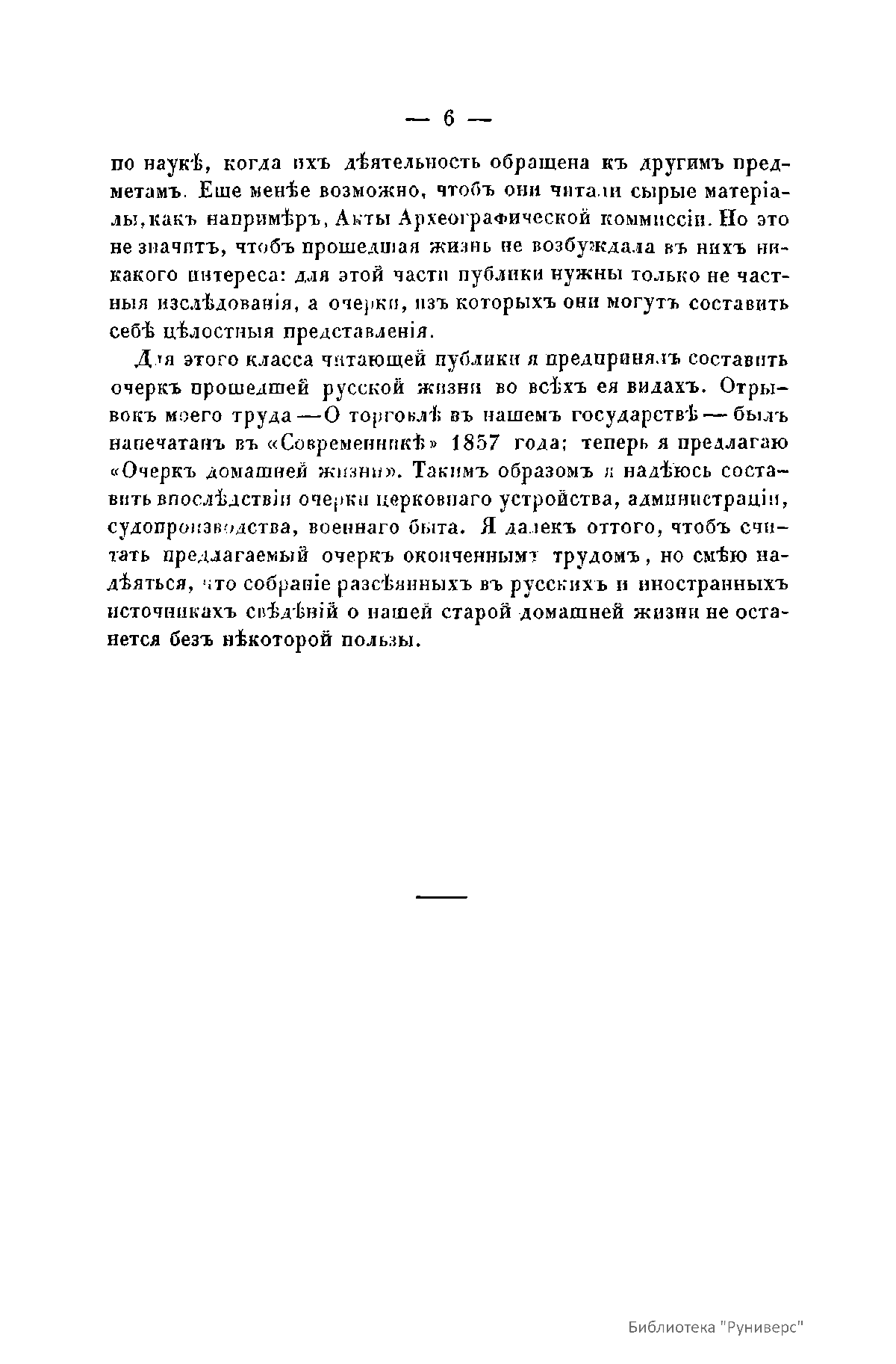 Настоящий труд предназначен для тех читателей, которые «лишены времени и средств, чтобы обращаться к чтению ученых исследований, решающих тот или иной вопрос прошедшей русской жизни» – такой публике нужны не частные исследования, а очерки, из которых можно составить себе целостное представление. Автор надеется, что собрание рассеянных в русских и иностранных источниках сведений о старой русской домашней жизни «не останется без некоторой пользы».
