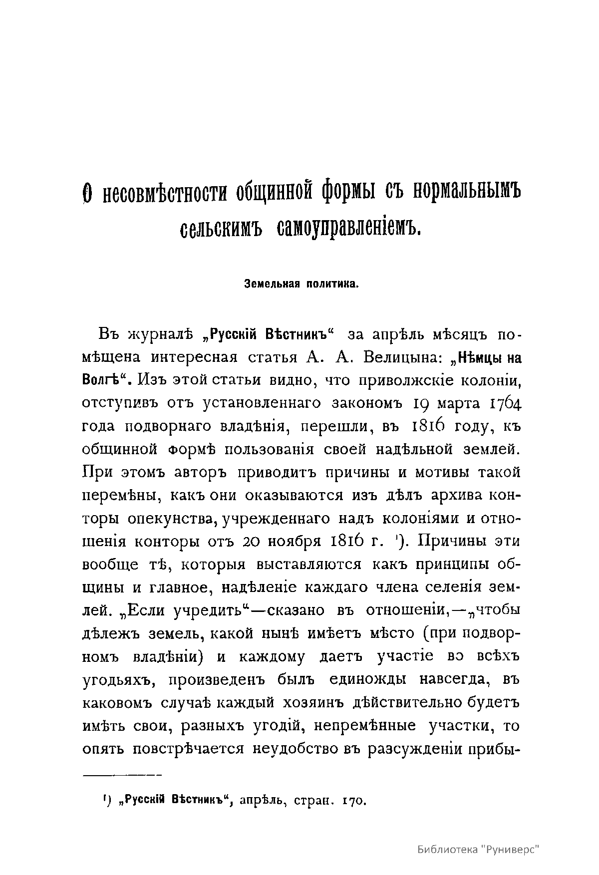 О несовмѣстности общинной формы съ нормальнымъ сельскимъ самоуправленiемъ