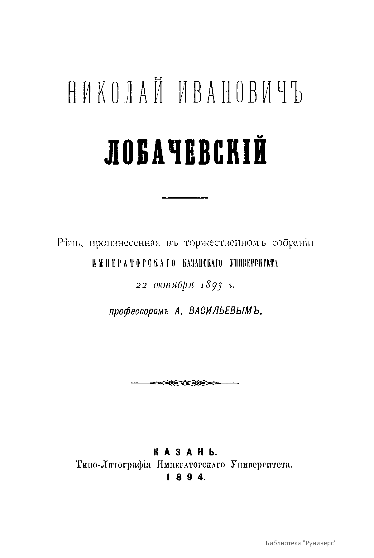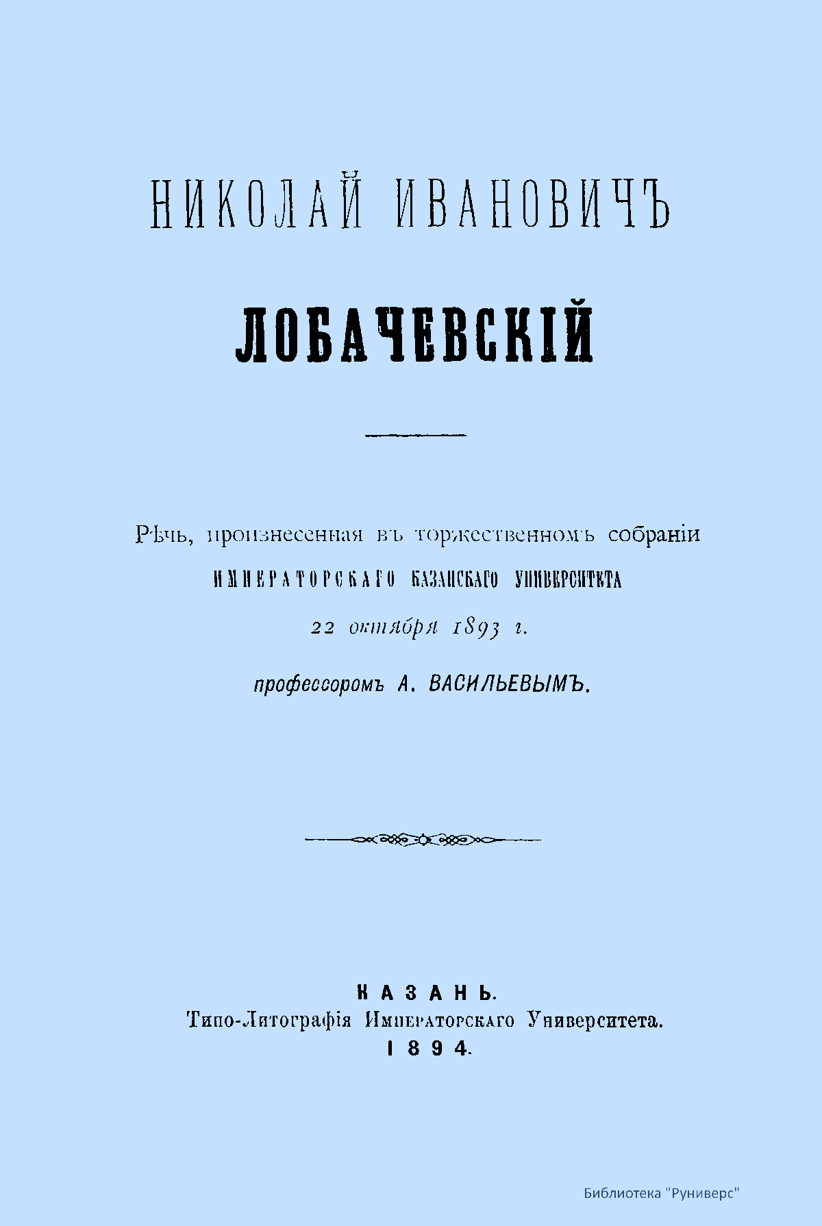 Первым, кто внес выдающийся вклад в пропаганду открытия Лобачевского и восстановление памяти о нем, был математик Александр Васильевич Васильев. Он был инициатором и главным организатором празднования в Казани в 1893 г. столетия со дня рождения ученого. Васильев предложил создать «Библиотеку Лобачевского» («Bibliotheka Lobachevskiana»), издать полное собрание его трудов, учредить премию. О начальном этапе биографии ученого не были осведомлены даже современники. Наибольшая заслуга в деле освещения жизни и личности Лобачевского, а также увековечения его памяти принадлежит покойному профессору Казанского университета А. В. Васильеву. 22 октября 1893 г.