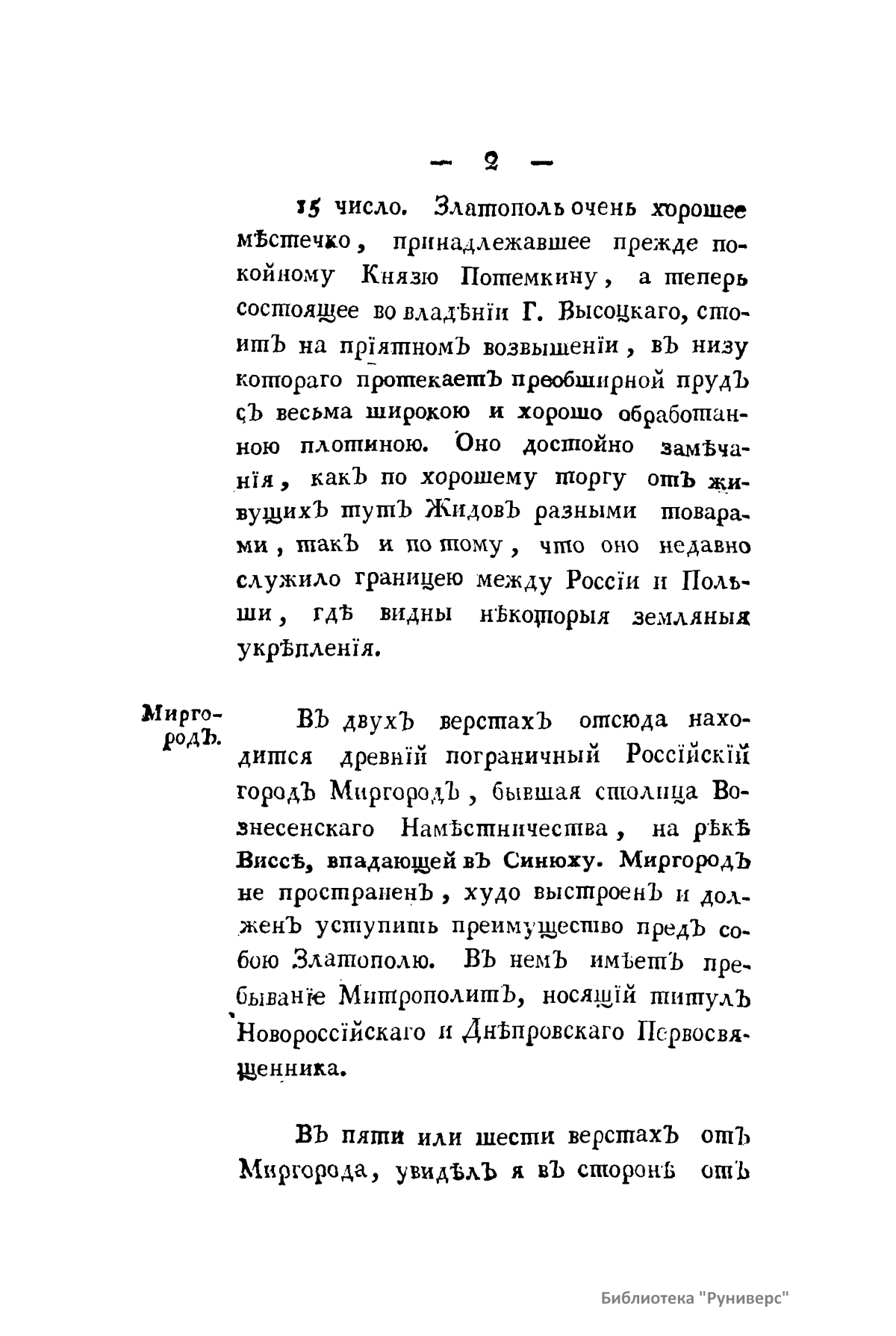 «Вот изображение сего обетованного края, который, составляя лучшую часть России, есть истинное для нее сокровище». Автор описывает впечатления своего путешествия, предпринятого 15 мая 1799 г. из Киевской губернии. Большая часть путешествия прошла в Крыму. Дневник разделен на главы по числам и подглавы: Миргород (10), Елисаветград (12), Херсон (28), Кизекермень, или Бериславль (33), Перекоп (44), Ахмечеть, или Симферополь (52), Карасубазар (58), Кафа, или Феодосия (64), Керчь, или Пантикапеум (77), Еникуль (80), Кутлак (94), Юшкют (97), Тувак (97), Кудчук-Юзень (98), Куру-Юзень (101), Алушта (102), Кудчюк-Ламбат (104), Партенит (105), Урзуф (106), Ялта (106). Кюреис, Мисхор (110), Алупка (110), Озунджи (115), Ахтиар (120), Херсонис (124), Георгиевский монастырь (130), Инкерман (131), Ханский дворец (140), греческая церковь (145), Дчу-фут-Кале (148), Ахмечеть (155), начало Салгира (156), гора Чатырдаг (157), вечный ледник (158), Кезлов, или Евпатория (163), целительная грязь (166), положение Крыма (174), степная полоса (175), каменистая полоса (176), счастливая полоса (176), Керчинский полуостров (178), климат (171), речки (182), леса (183), птицы, звери (184), рыбы и морские животные (185), пресмыкающиеся и насекомые (186), народное свойство, строения (188), необращение в торговле и леность (189), скотоводство (190), сады (191), виноградники, пчелы (193), шелковичные деревья и черви (194), порты, флот и торговля (194), заключение (195). Очаков (200), крепость (203), форштат (204), Гассан-Пашинский замок (205), карантин (206), Кинбурн (212), Одесса (220), порт (226), крепость (227), карантин, таможня, иностранный магистрат (228), Тиросполь (236), Бендеры (236), Дубоссары (242), Балта (244).