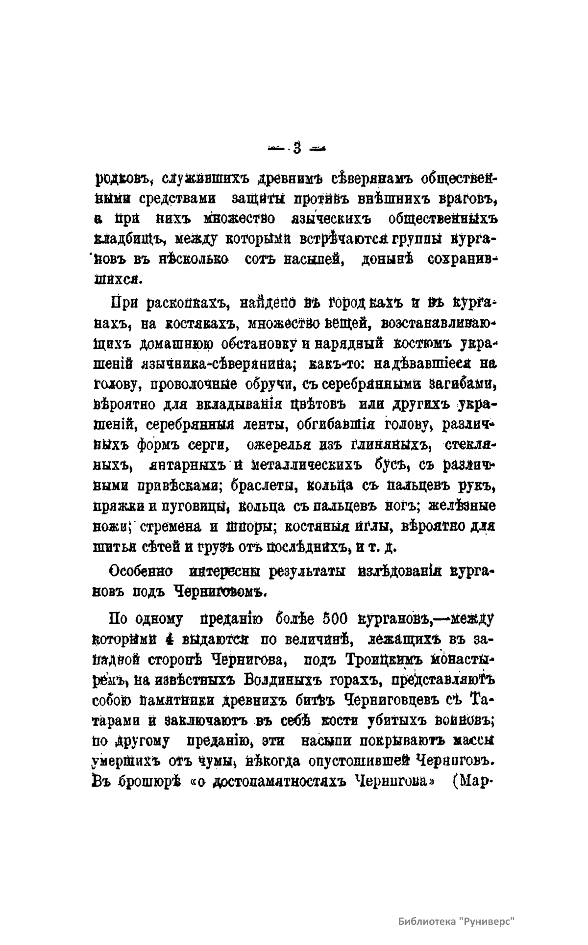 Городища и курганы – памятники жизни северян языческого периода. Автор брошюры полемизирует с Гебгарди, Шлецером, Карамзиным и другими историками, считавшими древних северян полудиким народом. Руководствуясь данными археологических раскопок, он доказывает, что северяне языческого периода – народ значительно цивилизованный, с политическими союзами, политической властью, общими обычаями, народ культурный.