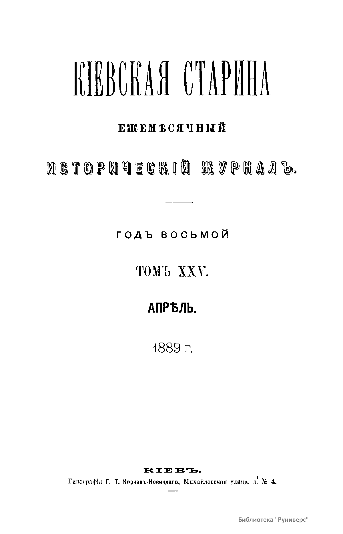 Кiевская старина. Годъ восьмой. Томъ XXV. Апрѣль-Iюнь 1889 г.