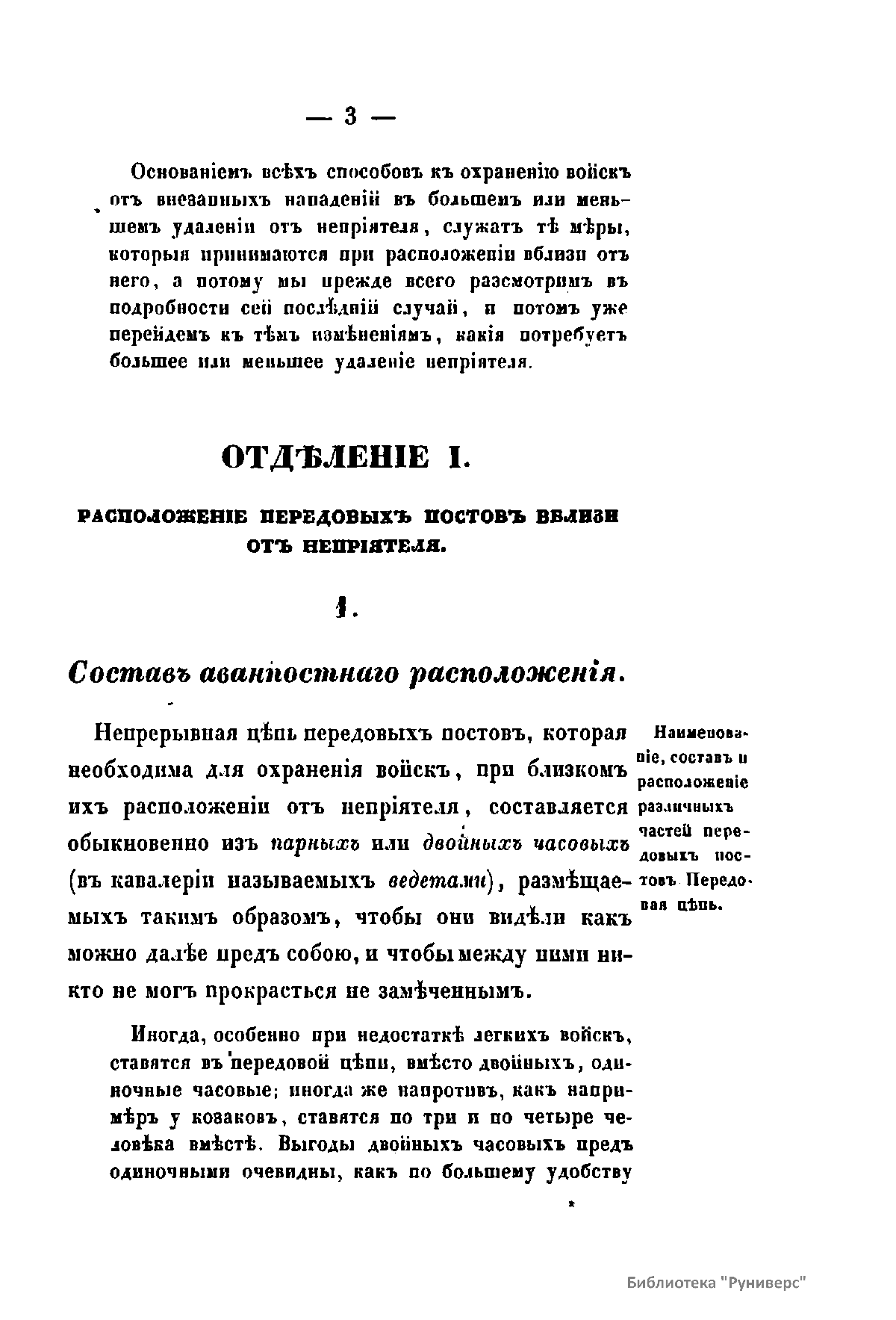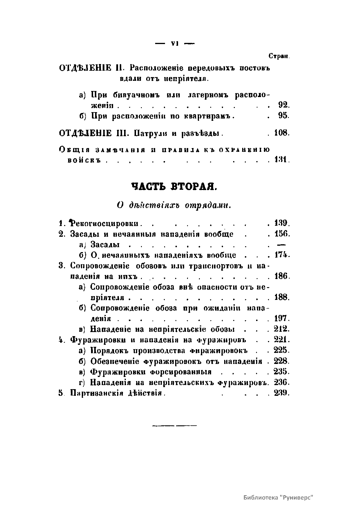 Малой войной называются действия войск небольшими частями в разных местах и большей частью одна от другой отдельно. В книге излагаются наставления к малой войне: меры, необходимые для охраны войск от внезапных нападений, для заблаговременного разведывания о неприятеле, для охраны своих сообщений и продовольствия, для нападения на неприятеля небольшими отрядами и т.д. Все эти меры не ведут непосредственно к достижению главной тактической цели – поражению неприятеля в открытом и общем бою, но в немалой степени способствую ей.