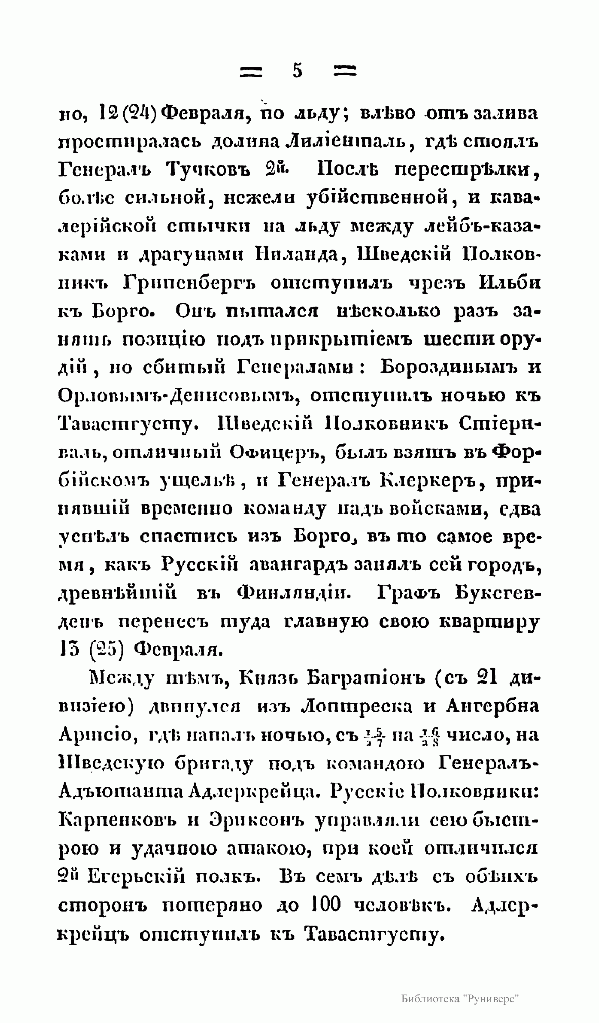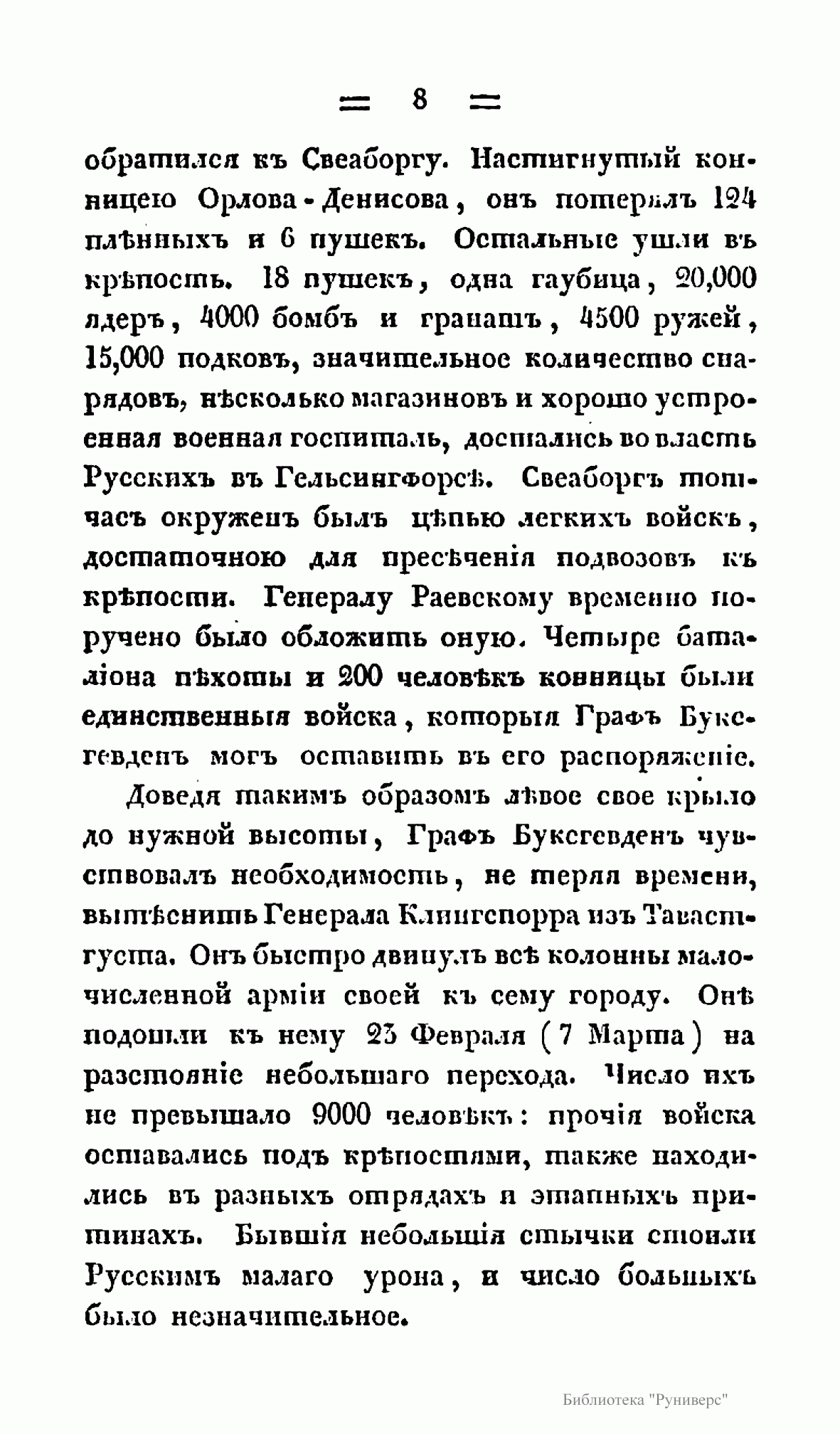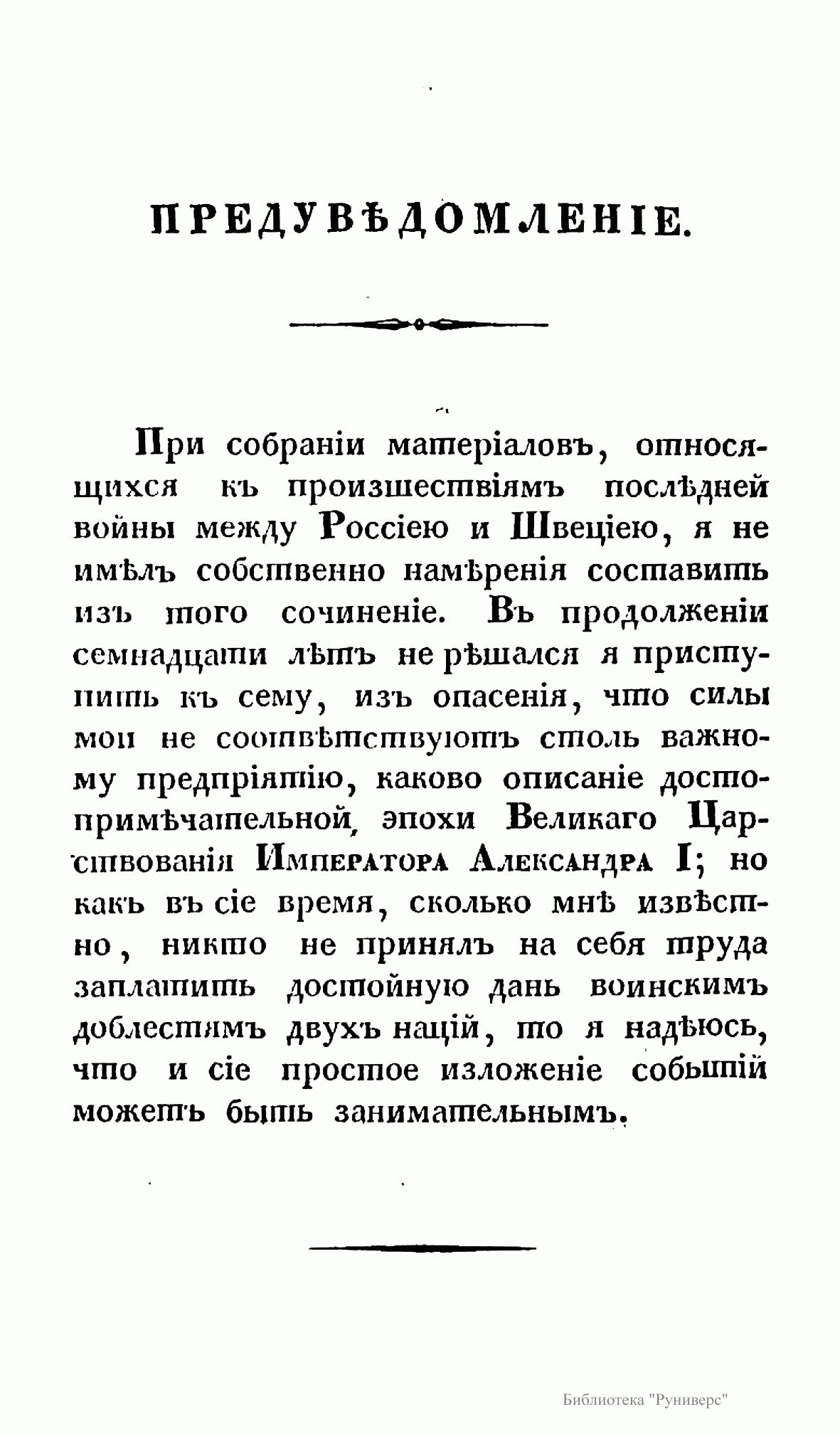 Русско-шведская война 1808-1809 гг. вызвана стремлением России в условиях начавшейся в 1807 г. войны с Великобританией установить полный контроль над финским и Ботническим заливом в целях обеспечения безопасности Петербурга. Тильзитский мир 1807 г. поставил Швецию перед дилеммой: присоединиться, как и Россия, к континетальной блокаде и тем самым поставить под удар британского флота свою морскую торговлю и отказаться от английского рынка, либо сохранить традиционный союз с Великобританией и пойти на конфлиут с Россией. Король Густав IV Адольф взял курс на разрыв с Россией, хотя Швеция не была готова к войне. В результате этой войны по Фридрихгамскому мирному договору к России отошла Финляндия. Автор книги «принимает на себя труд заплатить достойную дань воинским доблестям двух наций» и надеется, что «изложение военных событий будет занимательным».