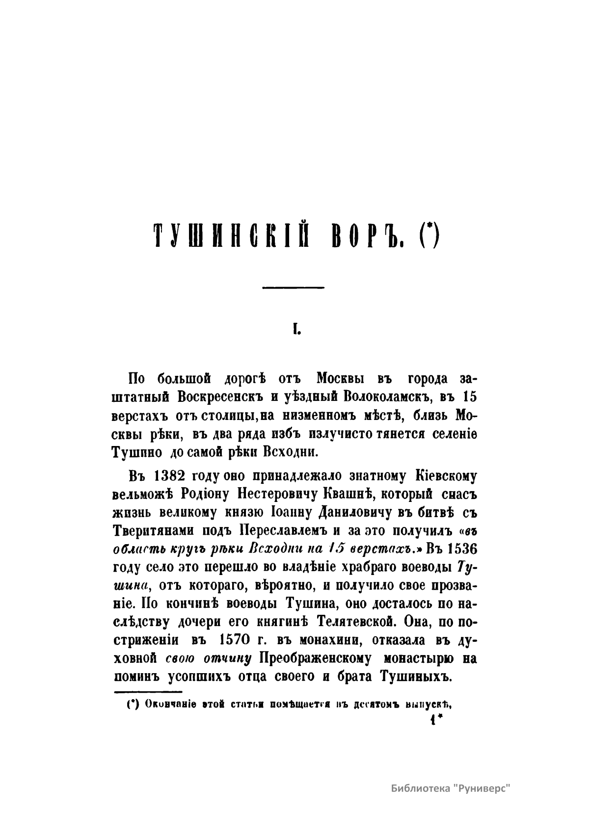 В брошюре дано подробное описание села Тушино начиная с конца XIV века и изложена история самозванца Лжедмитрия II - Тушинского вора. Самозванец неизвестного происхождения выдавал себя с 1607 года за якобы спасшегося царя Лжедмитрия I. В 1608 – 1609 гг. он создал Тушинский лагерь под Москвой, откуда безуспешно пытался захватить столицу. С начала открытой польской интервенции бежал в Калугу, где был убит.
