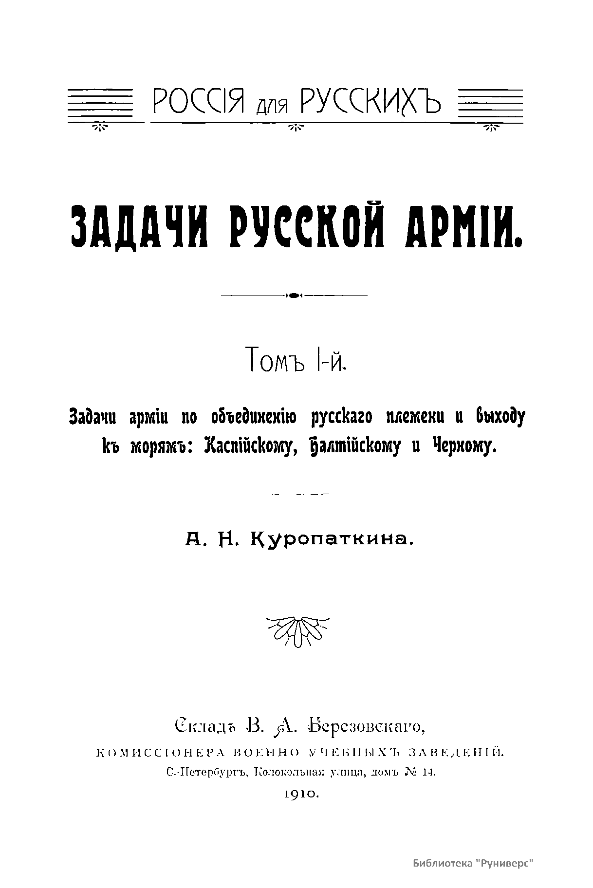 Том I-й. Задачи армии по объединению русского племени и выходу к морям: Каспийскому, Балтийскому и Черному
