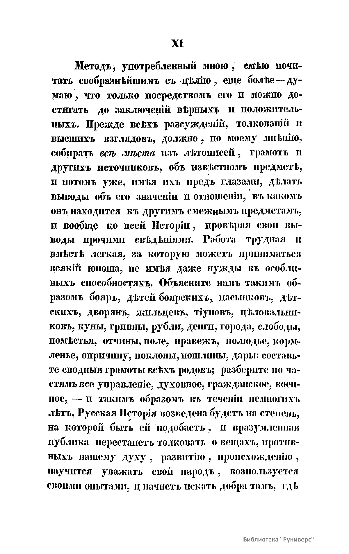 «На пользу науке, на славу Отечества, к чести своего времени» Первый том посвящен источникам древнейшей русской истории и преимущественно Несторовой летописи. В его состав вошло уже напечатанное прежде исследование, к которому присоединены замечания о прочих источниках: Русской правде, церковных уставах, северных сагах и пр. Приведен разбор всех мнений о Несторовой летописи. Предмет второго тома – происхождение Варягов-Руси. Здесь помещено первое рассуждение автора об этом предмете, исправленное и дополненное новыми исследованиями и открытиями. Автор разбирает также новые мнения о происхождении Варягов-Руси. В этом томе опубликованы лекции о славянах, в которых заключается краткое извлечение о Славянских Древностях Шафарика. Третий том содержит исследования и замечания о событиях первого периода, который автор называет Варяжским, или Норманским (862 – 1054), с объяснением всех мест Несторовой летописи, и сравнение русского начала с началом прочих западных государств, где показан источник различия между их последующими историями. Четвертый том посвящен приготовительным и общим исследованиям: об источниках для удельного периода, т.е. о летописях и их хронологии, о родах князей, о пределах и городах Ярославовых княжеств, о праве великокняжеского наследства, об отношении великого князя к прочим князьям, об отношении их между собой. В пятом томе исследуются междуусобные войны князей и их сношения, внешние войны и внешние сношения. В шестом томе автор приводит азбучный список русских князей до монгольского ига; список русских князей до монгольского ига по степеням и старшинству; список князей по княжествам и уделам. В седьмом томе автор рассуждает о князе, его дружине, боярах и отроках; о городах и их обитателях; о волостях и их отношении к городам; о военном деле; о праве; торговле; церкви, грамотности и образовании.