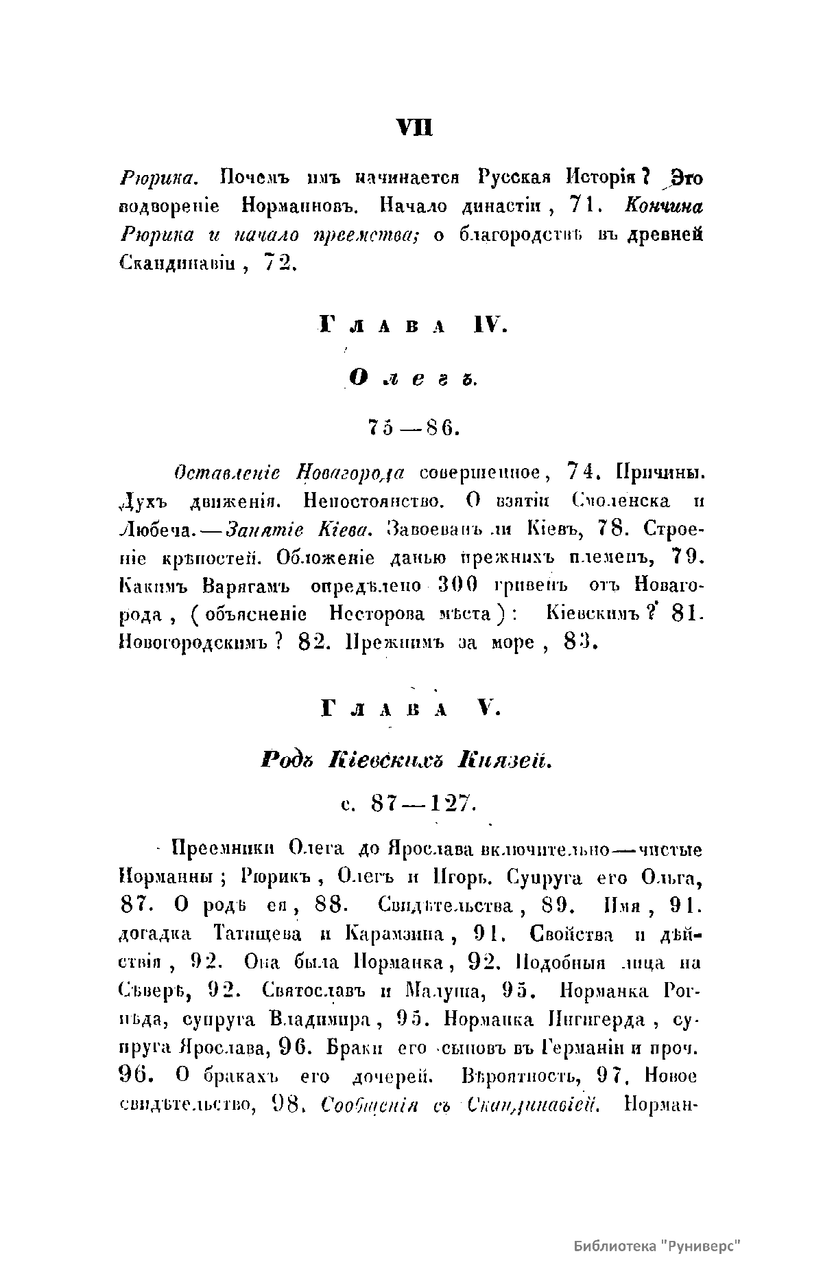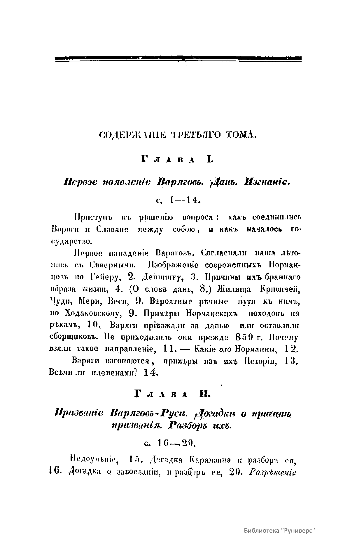 «На пользу науке, на славу Отечества, к чести своего времени» Первый том посвящен источникам древнейшей русской истории и преимущественно Несторовой летописи. В его состав вошло уже напечатанное прежде исследование, к которому присоединены замечания о прочих источниках: Русской правде, церковных уставах, северных сагах и пр. Приведен разбор всех мнений о Несторовой летописи. Предмет второго тома – происхождение Варягов-Руси. Здесь помещено первое рассуждение автора об этом предмете, исправленное и дополненное новыми исследованиями и открытиями. Автор разбирает также новые мнения о происхождении Варягов-Руси. В этом томе опубликованы лекции о славянах, в которых заключается краткое извлечение о Славянских Древностях Шафарика. Третий том содержит исследования и замечания о событиях первого периода, который автор называет Варяжским, или Норманским (862 – 1054), с объяснением всех мест Несторовой летописи, и сравнение русского начала с началом прочих западных государств, где показан источник различия между их последующими историями. Четвертый том посвящен приготовительным и общим исследованиям: об источниках для удельного периода, т.е. о летописях и их хронологии, о родах князей, о пределах и городах Ярославовых княжеств, о праве великокняжеского наследства, об отношении великого князя к прочим князьям, об отношении их между собой. В пятом томе исследуются междуусобные войны князей и их сношения, внешние войны и внешние сношения. В шестом томе автор приводит азбучный список русских князей до монгольского ига; список русских князей до монгольского ига по степеням и старшинству; список князей по княжествам и уделам. В седьмом томе автор рассуждает о князе, его дружине, боярах и отроках; о городах и их обитателях; о волостях и их отношении к городам; о военном деле; о праве; торговле; церкви, грамотности и образовании.