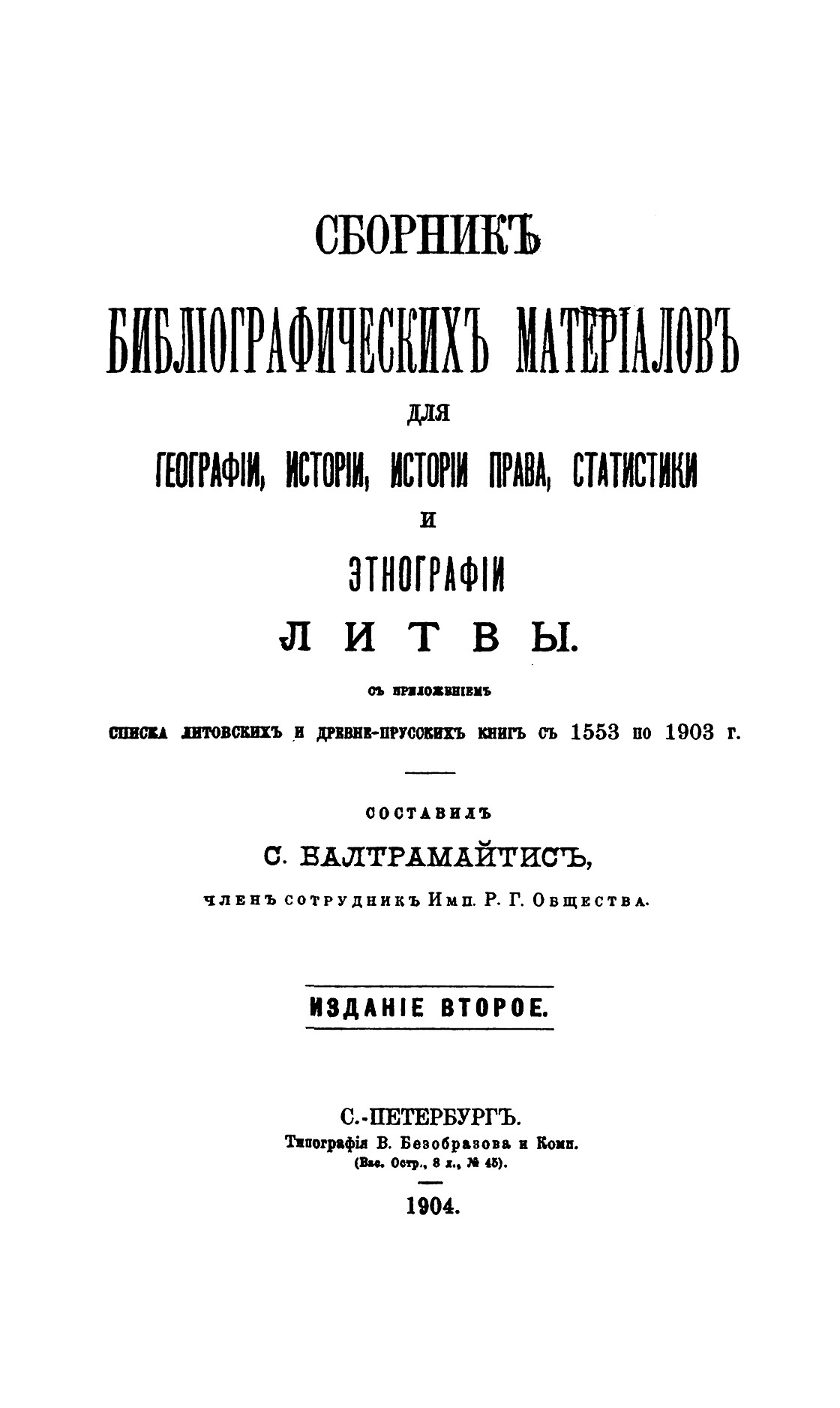 Сборникъ библiографическихъ матерiаловъ для географiи, исторiи, исторiи права, статистики и этнографiи Литвы с приложенiемъ списка литовскихъ и древнепрусскихъ книгъ съ 1553 по 1903 г