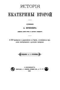 «История Екатерины II» - наиболее крупная из многочисленных работ Брикнера, относящихся к екатерининской эпохе, была также издана сначала в 1883 г. по-немецки в журнале-альманахе В. Онкена «Allgemeine Geschichte» (Всеобщая история), а в 1885 г. – вышла уже в русской переделке, включающей более 300 превосходных гравированных иллюстраций.