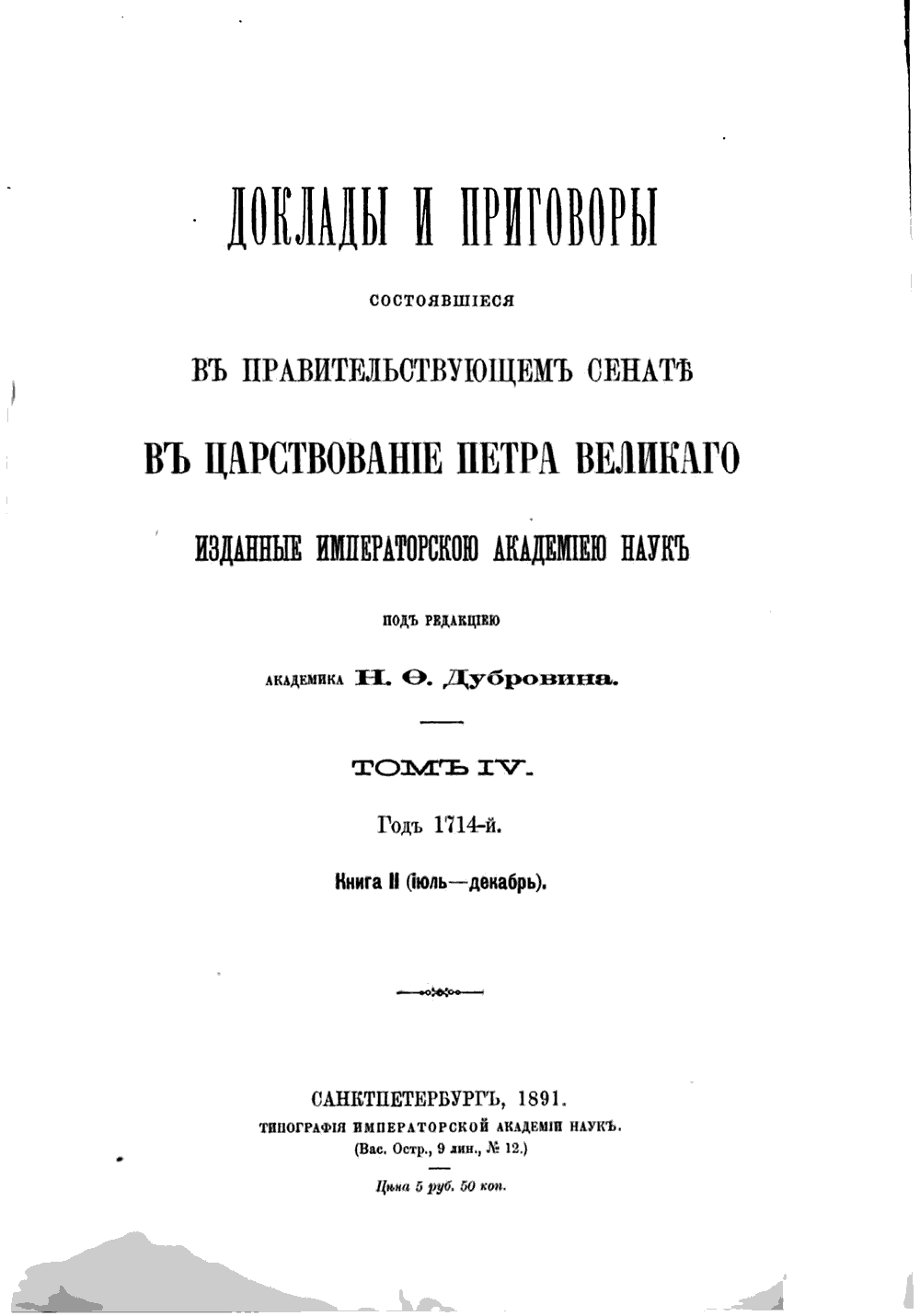 Доклады и приговоры состоявшиеся в Правительствующем Сенате в царствование Петра Великого. Том IV. Книга II (июль-декабрь)