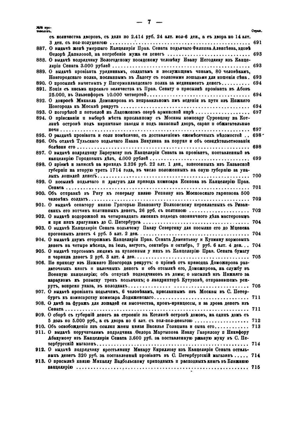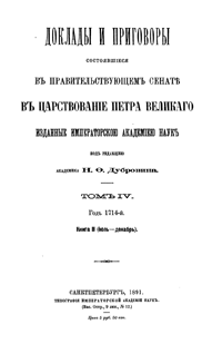 Доклады и приговоры состоявшiеся въ Правительствующемъ Сенатѣ въ царствованiе Петра Великаго