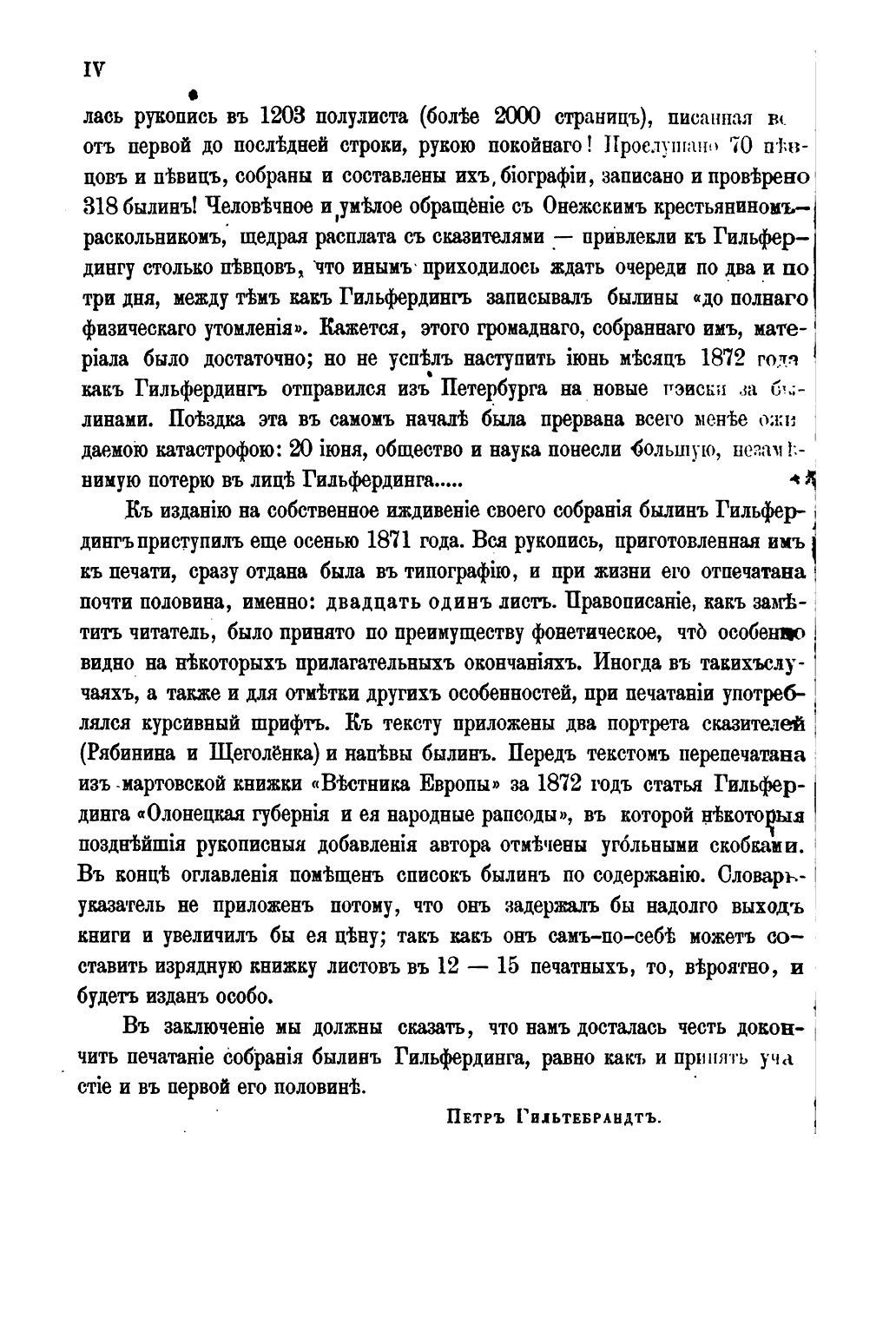 «Я, располагающий только двумя месяцами, вовсе не рассчитывал вначале на возможность его сколько-нибудь существенно дополнить [сборник Рыбникова], а хотел только удовлетворить личному любопытству, знакомством с некоторыми сказителями. Между тем счастливый случай скоро заставил меня из туриста превратиться в собирателя». За два месяца он прослушал 70 певцов и записал 318 былин (рукопись составила более 2000 страниц). Готовя материалы к публикации, Гильфердинг впервые применил метод воспроизведения былин в соответствии с репертуарами сказителей, предпосылая этим собраниям подробные биографические справки