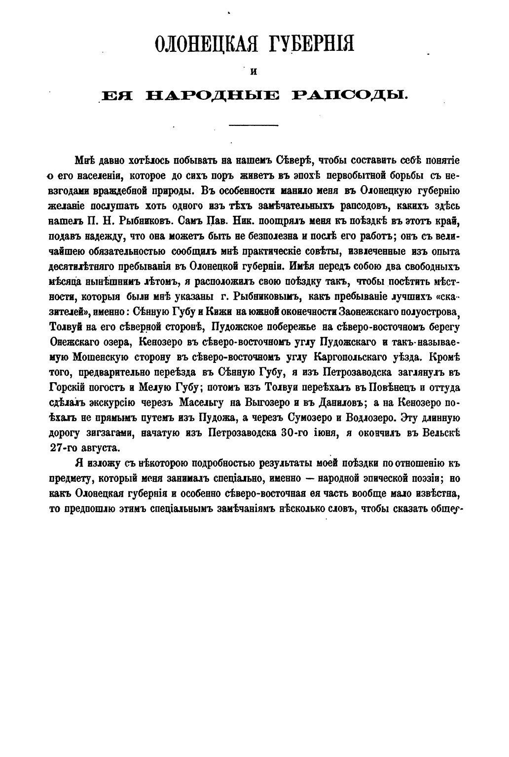 В середине XIX века в истории собирания русского фольклора произошло знаменательное событие: высланный в 1859 году за политическую деятельность в Петрозаводск П.Н. Рыбников обнаружил в Олонецком крае живую былинную традицию.