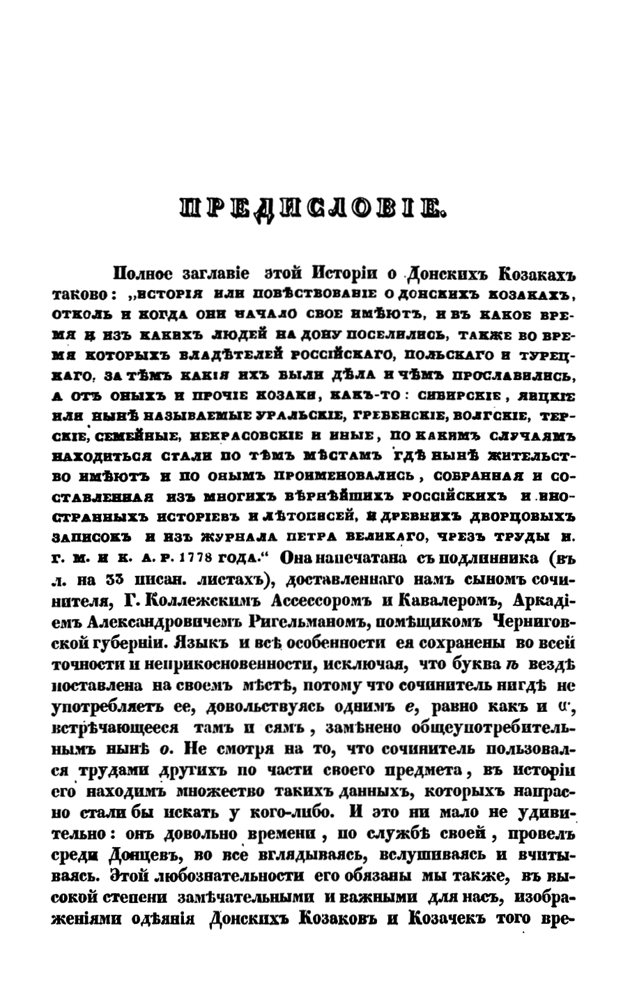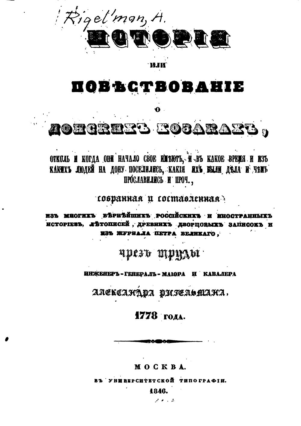 Уйдя в отставку после славных военных и государственных дел, генерал-майор А.И. Ригельман с энтузиазмом занялся историческими исследованиями. Прожив много лет бок о бок с казаками, он посвятил несколько работ казацкой старине. Написанная за 30 лет до Карамзина "«История о донских казаках», в которой исторические факты причудливо сочетаются с легендами и преданиями, остается примечательным памятником русской историографии XVIII века.