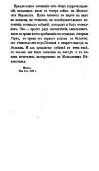 Сборник очерков, которые князь Лев Шаховской направлял в редакцию Московских Ведомостей, в бытность военным корреспондентом на Балканах. Автор не пытался отредактировать или дополнить свои заметки. «Пусть читатель не ищет в них ни полноты, ни последовательного изложения военных событий, которых я был очевидцем. Это просто ряд впечатлений, записанных мною во время моего пребывания в отрядах генерала Гурко, во время его первого похода за Балканы, его деятельности под Плевной и второго похода за Балканы. Я предлагаю их публике в том виде, в каком они были записаны на походе и в каком печатались своевременно в Московских Ведомостях»