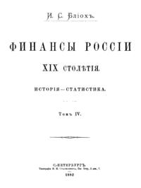 И.С. Блиох – выходец из семьи польских евреев, крупнейший российский банкир, совладелец железных дорог, один из основателей движения борьбы за мир в Европе, поддерживал развитие сионизма. Считается автором значительного числа крупных обобщающих научных исследований, освещающих глобальные стороны государственного управления. Например, фундаментальный труд «Будущая война и ее экономические последствия». В 7-ти томах; вышедший на основных европейских языках. Существуют весомые сомнения в том, что И.С. Блиох самостоятельно подготовил ряд огромных многотомных научных работ. Так, в мемуарах первого премьер-министра России С.Ю. Витте не без основания отмечается, что Блиох только составлял план книги, а писала её группа специалистов по его заказу. В биографической статье о Блиохе, говорится, что в написании его книги о войне участвовали офицеры всех крупных европейских армий, в том числе русские офицеры Генерального Штаба.