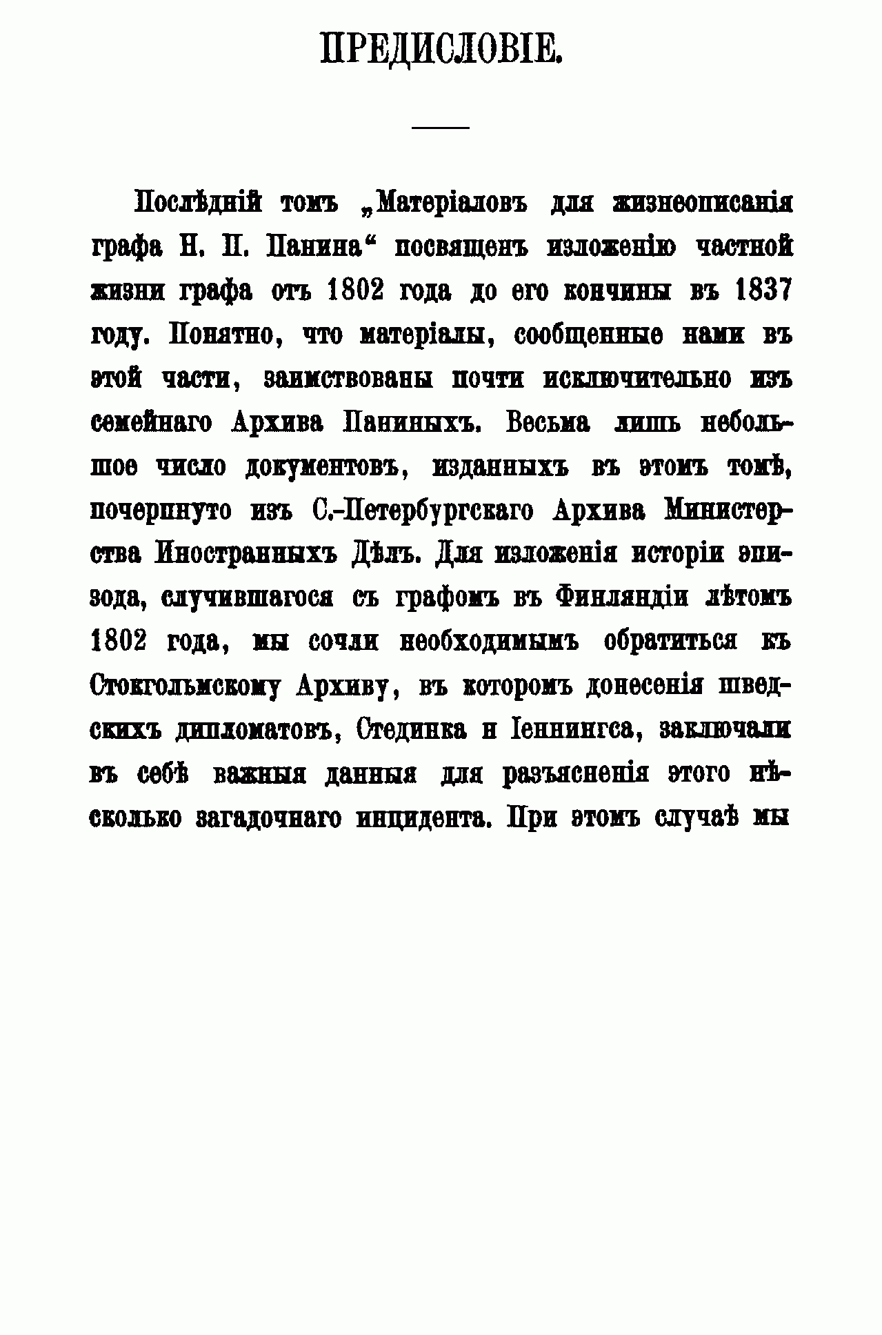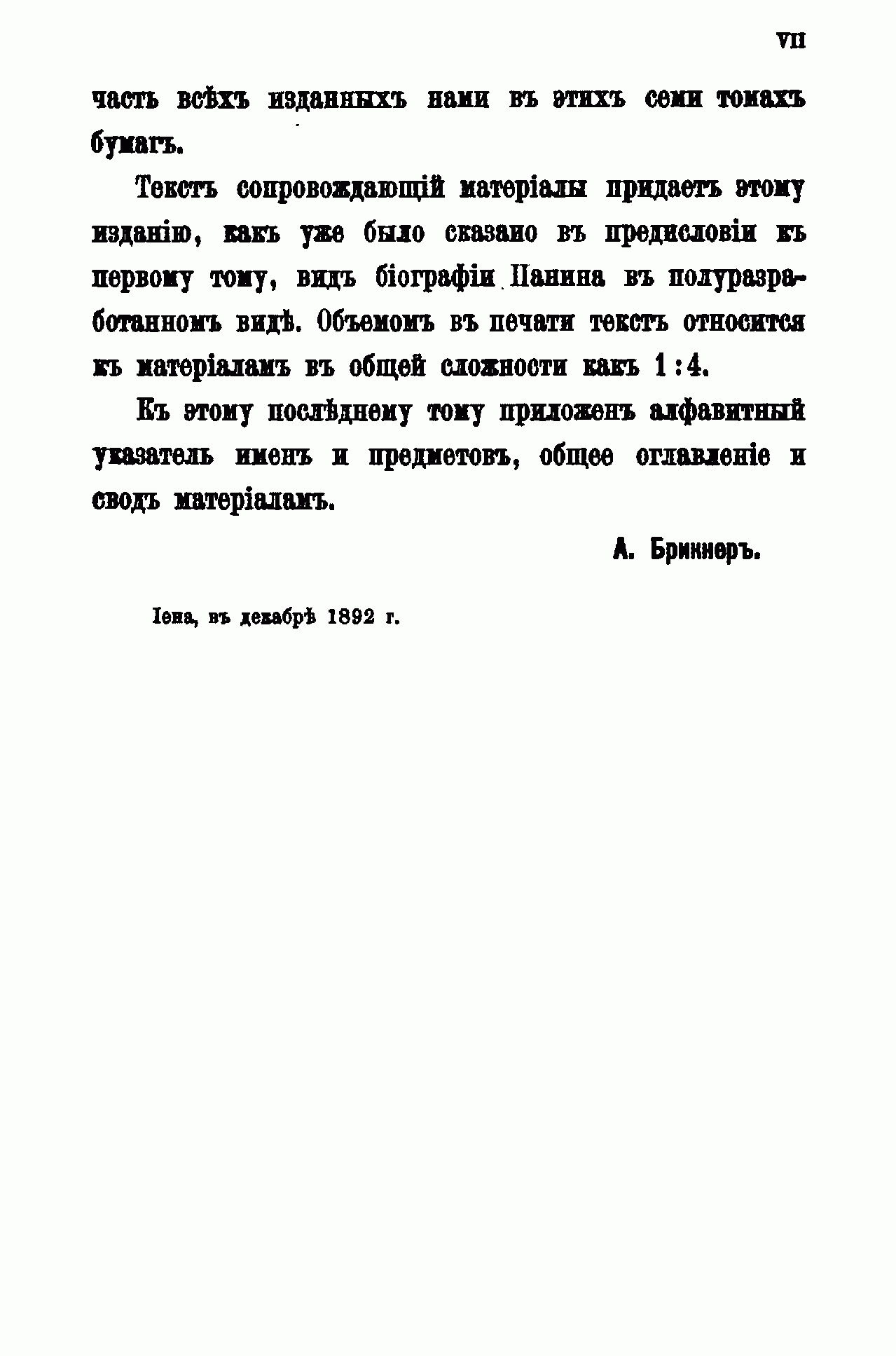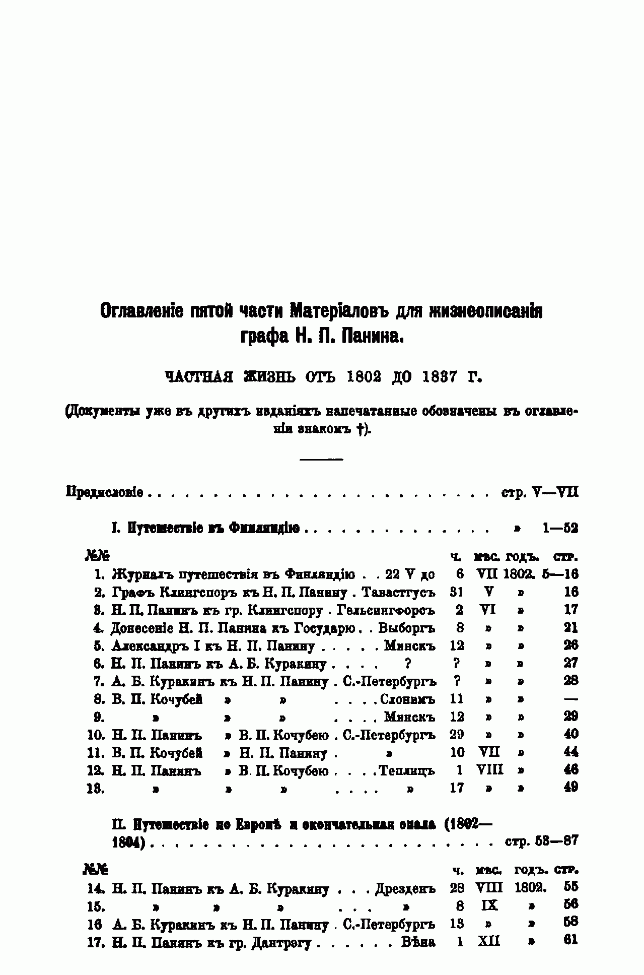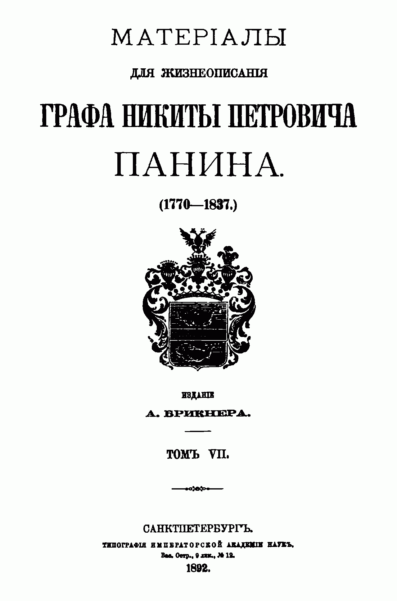 По поручению внучки Н. П. Панина, княгини М. А. Мещерской, А. Г. Брикнер с 1886 г. начал собирать и публиковать материалы для биографии графа. Последний, седьмой, том материалов посвящён частной жизни Панина с 1802 г. до его кончины в 1837 г. Здесь собраны сведения о путешествии графа в Финляндию в 1802 г.; о путешествии по Европе и окончательной опале (1802 – 1804); об участии в устройстве ополчения в Смоленской губернии (1806 – 1807); о деле с Ростопчиным (1813 – 1814); о жизни в Дугине (1816 – 1837), а также различные письма и записки. Большая часть документов написана по-французски.