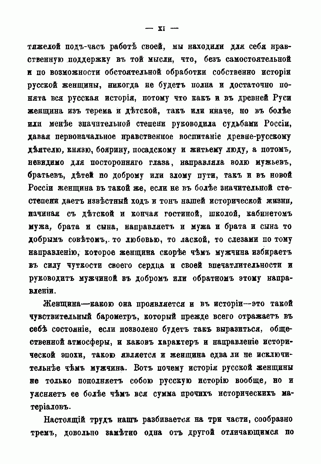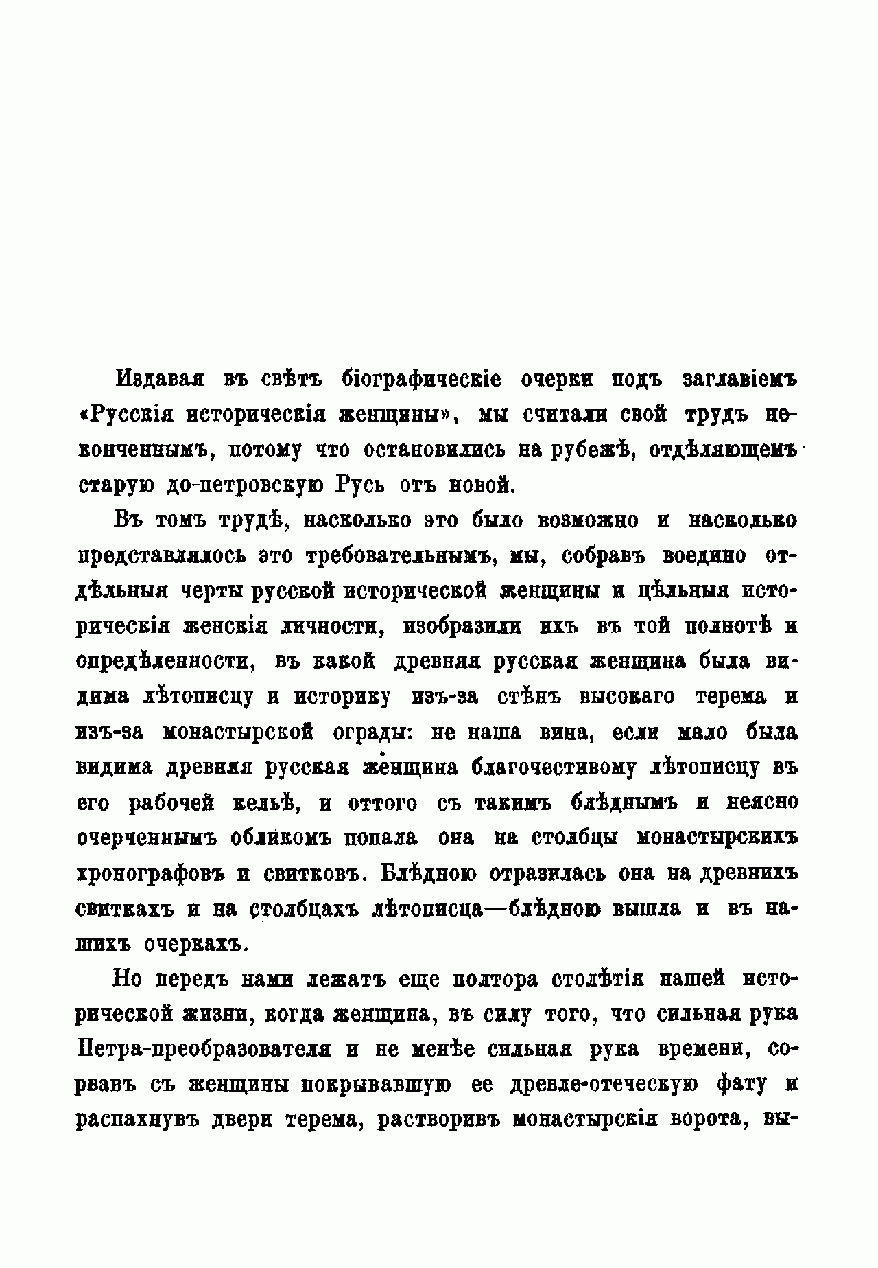 По мнению автора книги, история русской женщины не только пополняет русскую историю вообще, но и уясняет её больше, чем вся сумма прочих исторических материалов. Каков характер и направление исторической эпохи, такой является и женщина едва ли не исключительнее, чем мужчина. Труд Д. Мордовцева состоит из трёх частей – сообразно трём заметно друг от друга отличающимся историческим эпохам. Это первые пятьдесят лет от начала петровских реформ и окончательного введения России в общий строй европейских держав до возрождения начал сознания русского национального чувства; вторые пятьдесят лет – эпоха развития этого чувства – до конца восемнадцатого столетия; девятнадцатое столетие. Настоящая книга посвящена женщине первой половины восемнадцатого века. Читатель увидит, как русская женщина, «рванувшись из терема в широко раскрытую Петром дверь и надев немецкое платье вместо сарафана и телогреи, чтобы блистать в ассамблее и при дворе, наделала немало ошибок и сама немало пострадала, пока не поняла несколько отчётливее своего женского призвания». – Книга включает девятнадцать биографий.