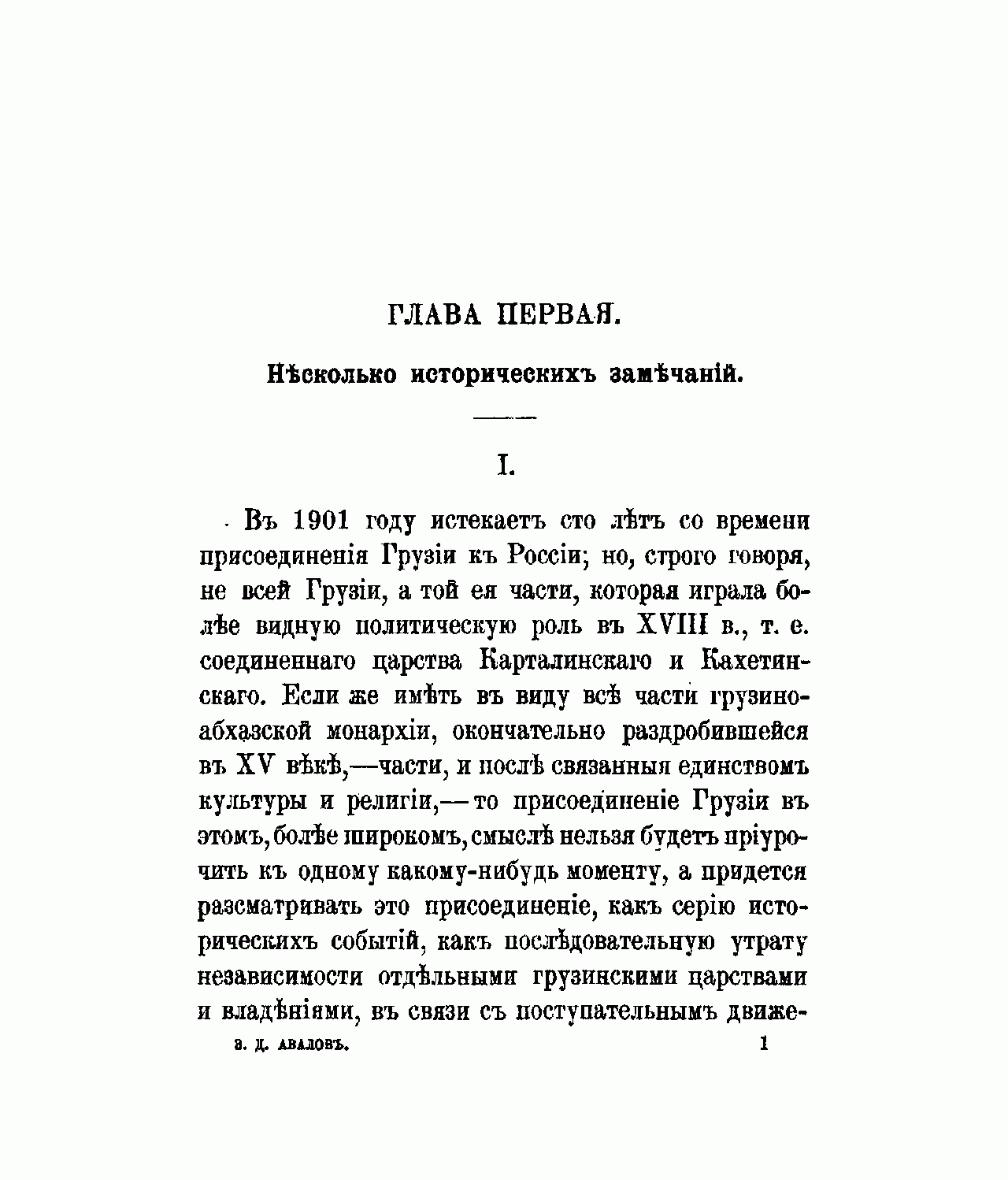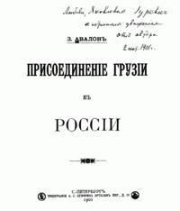 Книга выдающегося грузинского историка, дипломата и политического деятеля князя Зураба Давидовича Авалова (Авалишвили) впервые опубликована в 1901 в Петербурге и переиздана в 1906. Выход этой работы был приурочен к столетней годовщине объединения православных государств (в ознаменование Манифеста от 18 января 1801 императора Павла I о присоединении Картли-Кахетинского царства), чьи судьбы были теснейшим образом связаны, которые обогащали друг друга культурно и были едины в тяжелых испытаниях. В книге исследуется общий путь к объединению со всеми его драматическими особенностями. В настоящее время книга переиздана в издательстве журнала «Звезда» с комментариями и приложениями – З. Д. Авалов. Присоединение Грузии к России. Комментарии Г. А. Анакидзе и Б. П. Миловидова. – СПб.: Журнал «Звезда», 2009; а также в издательстве «Вече» – М.: Вече, Российская военно-историческая библиотека, 2017.