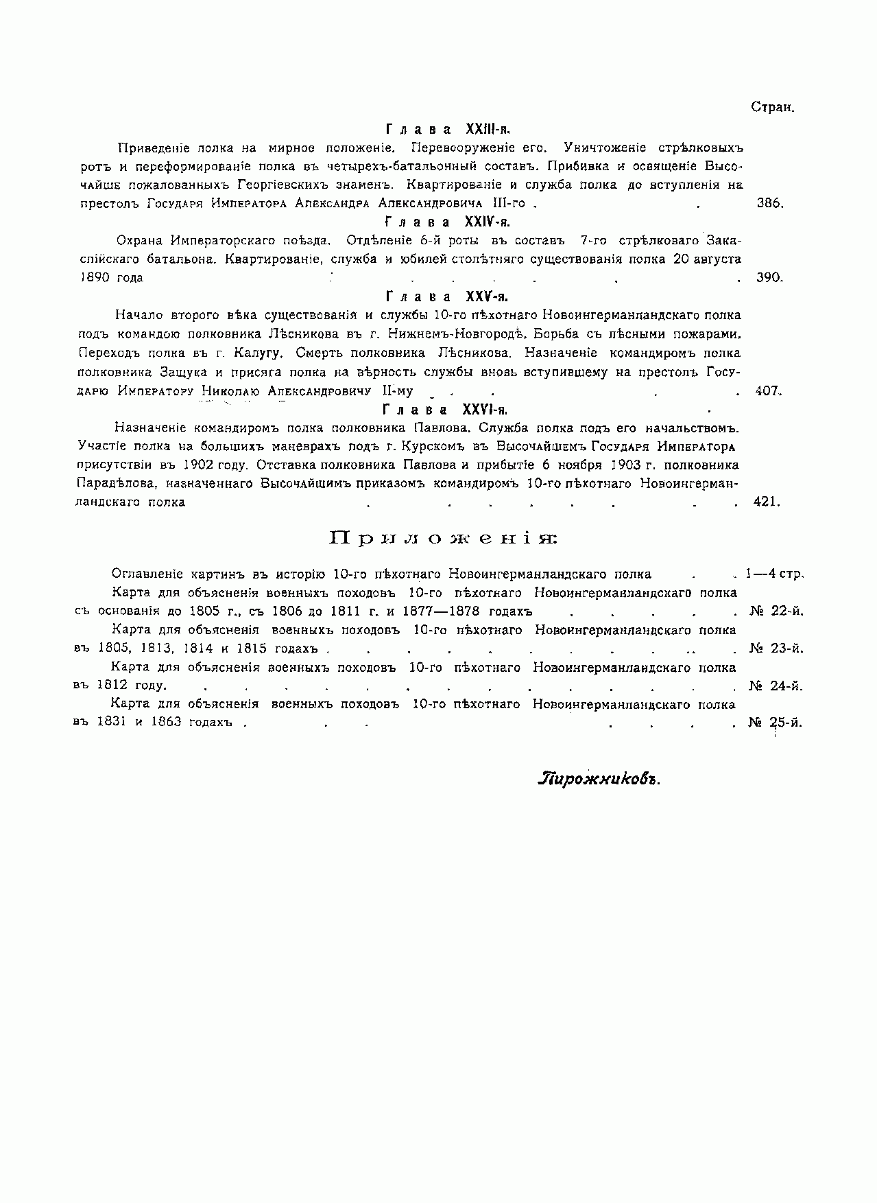Книга ветерана полка и его историографа полковника А.И. Пирожникова посвящена детальному исследованию боевого пути одного из старейших полков Российской императорской армии. Полк был сформирован как мушкетерский пехотный полк в г. Херсоне, а первое название утверждено в январе 1785 г. – «Херсонский пехотный полк». Старшинство присвоено с 1790 г. С 1796 г. он получил название «Новоингерманландский мушкетерский полк». В течение своего существования полк неоднократно переименовывался и менял места дислокации. Полк принимал участие в русско-турецкой войне 1787-1791 гг., а затем в войне с Польшей в 1792 г., в эпоху наполеоновских войн участвовал в битве при Аустерлице в 1805 г., а позже в русско-турецкой войне 1806-1812 гг. Полк прошел славный боевой путь в Отечественной войне 1812 г. и заграничных походах русской армии в 1813-1814 гг., участвовал в Бородинском сражении и «битве народов» под Лейпцигом. После возвращения вместе с экспедиционным корпусом из Франции в 1818 г. полк был расквартирован в Белоруссии. В царствование Николая I полк принимал активное участие в подавлении польского восстания в 1831 г., особо отличился при взятии Варшавы, затем в подавлении национального восстания в Венгрии в 1848-1849 гг. Впоследствии полк вновь принимал участие в подавлении национально-освободительного восстания на территории Польши и Белоруссии в 1863-1864 гг. В 1866 г. полк был переведен из Белостока в Ярославль и Кострому. Наиболее яркой страницей боевого пути полка стало его участие в русско-турецкой войне 1877-1878 гг. и освобождении Болгарии от османского владычества, за что он был удостоен двух почетных знамен. 20 августа 1890 г. в честь своего столетнего юбилея полк был снова награжден почетным Георгиевским знаменем. В царствование Николая II полк дислоцировался в Туле и Калуге, а затем его личный состав принимал участие в русско-японской войне 1904-1905 гг.