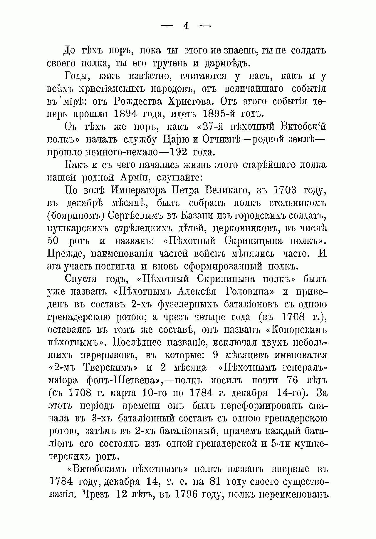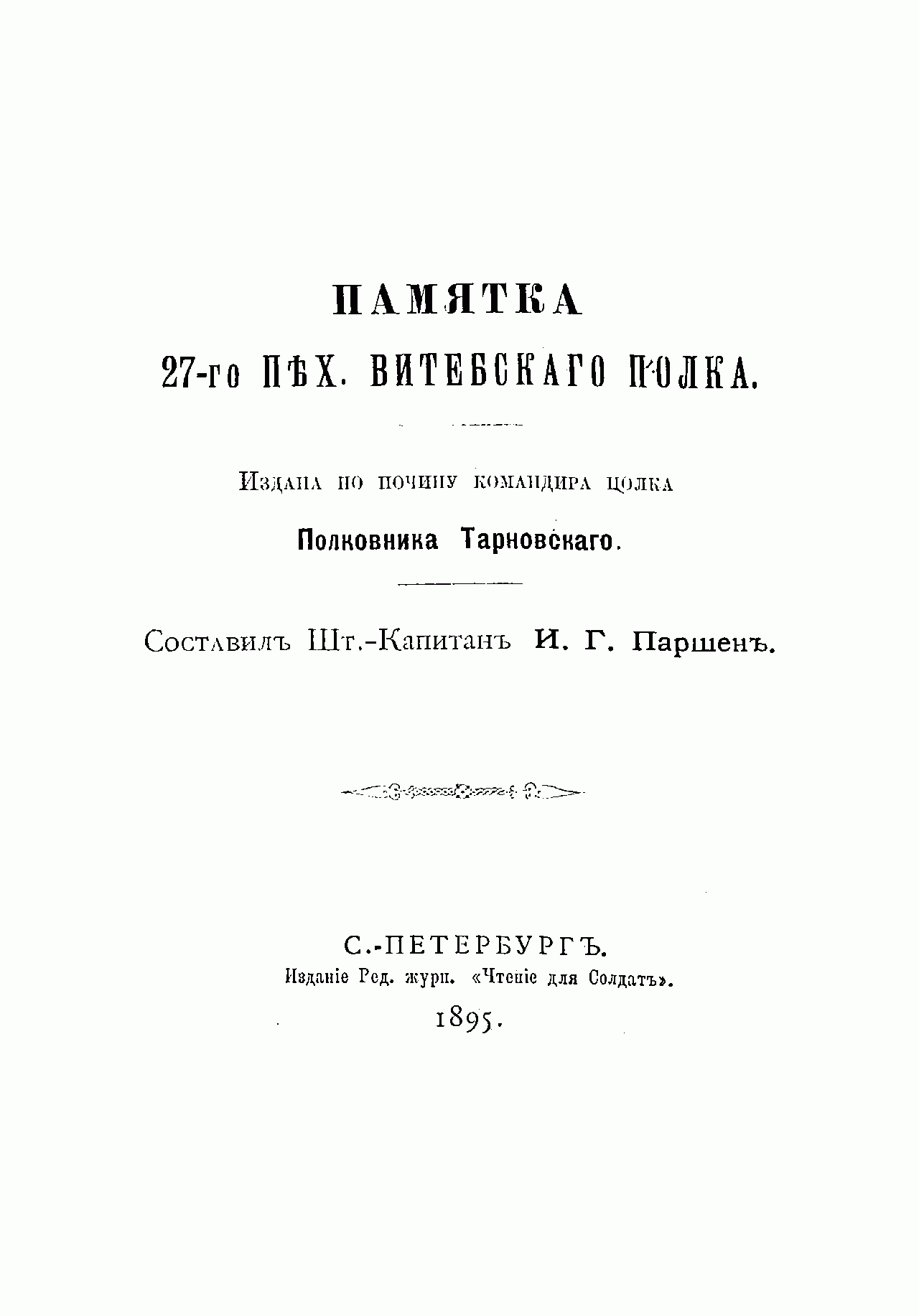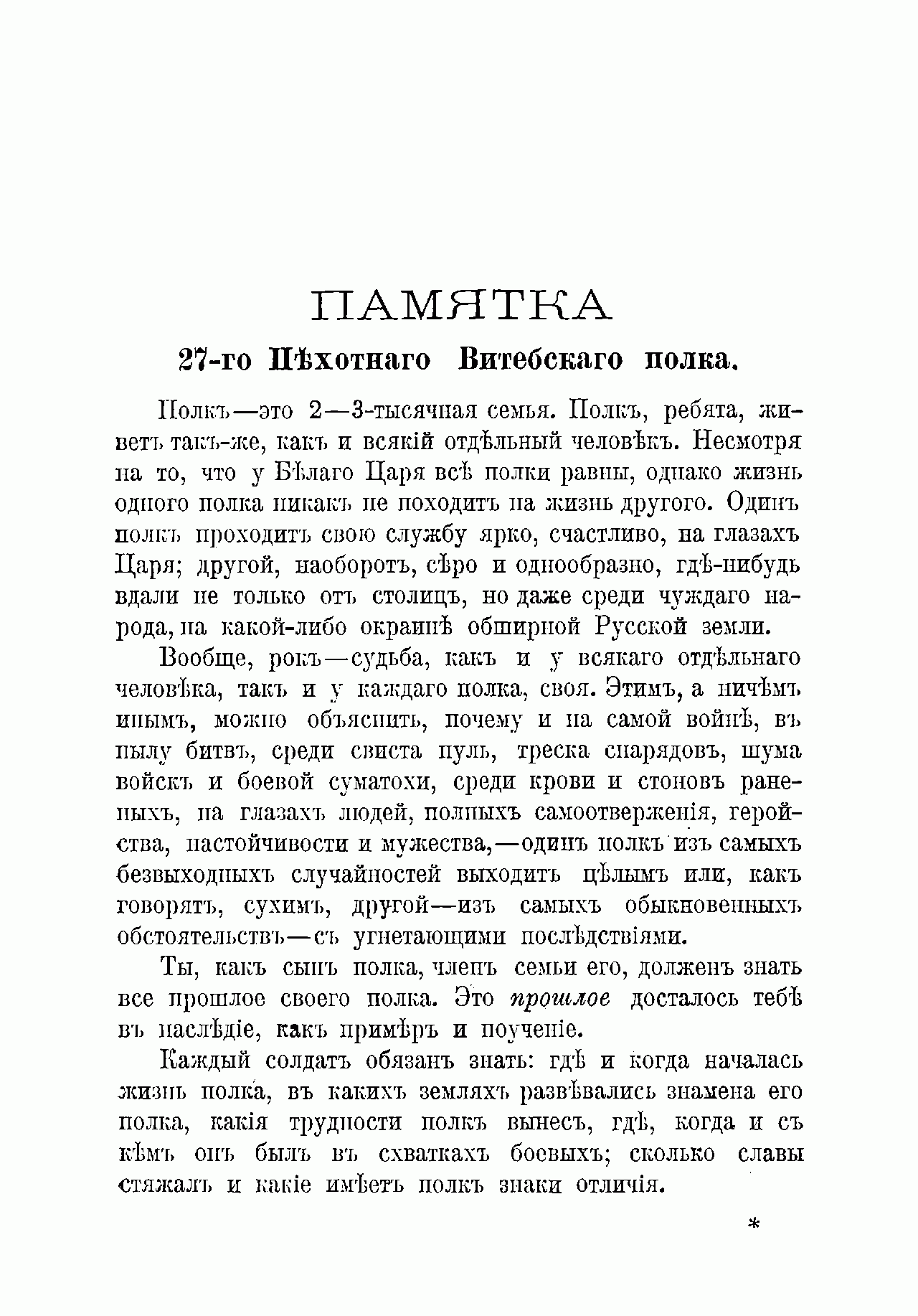 Памятка подготовлена в рамках «умственного и нравственного развития солдат» во имя их служения «Престолу и Отечеству», формирования основ «полкового братства» среди нижних чинов. В кратком предисловии указывается: «Каждый солдат обязан знать, где и когда началась жизнь полка, в каких землях развивались знамёна его полка, какие трудности полк вынес, где, когда и с кем он был в схватках боевых…».