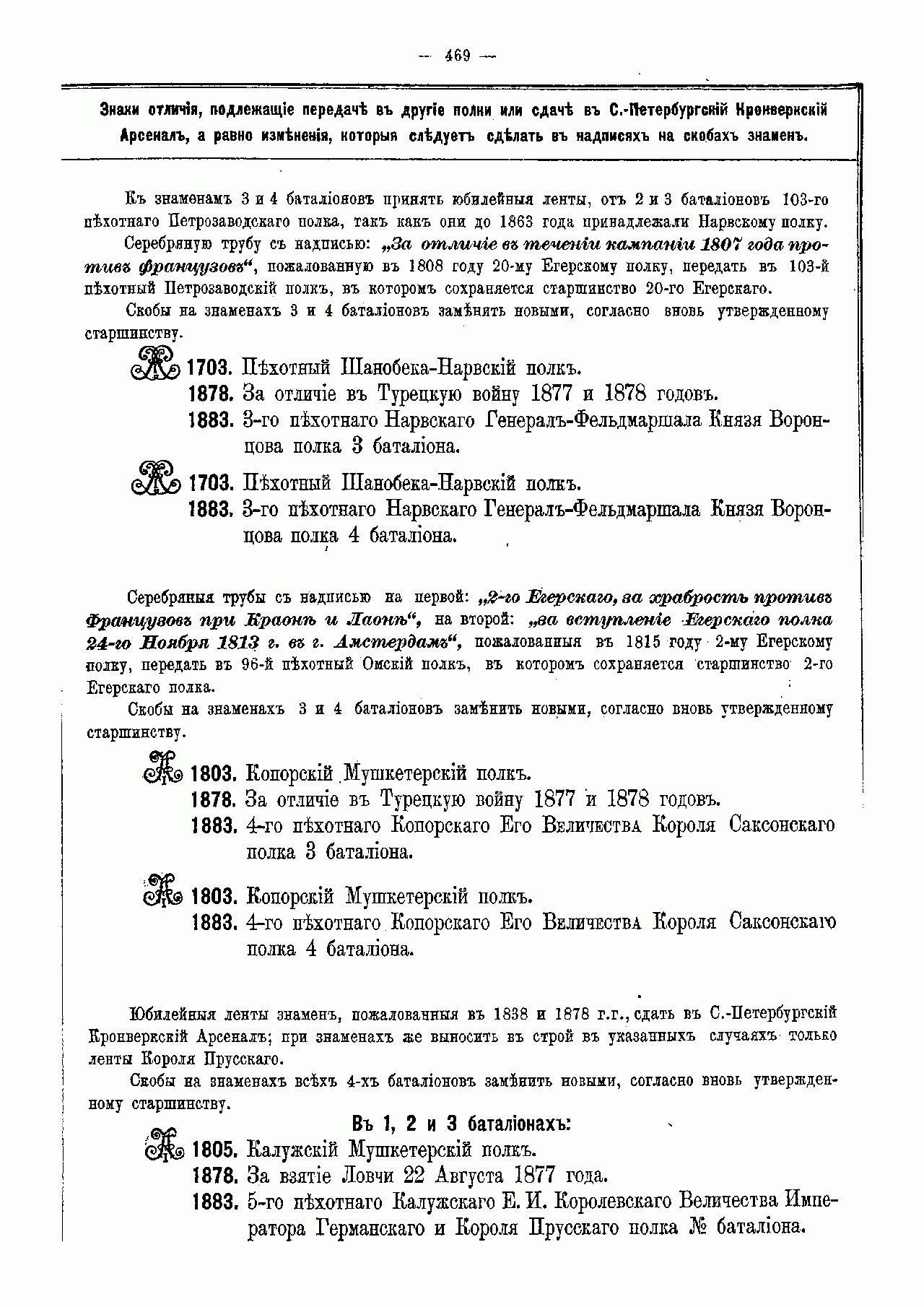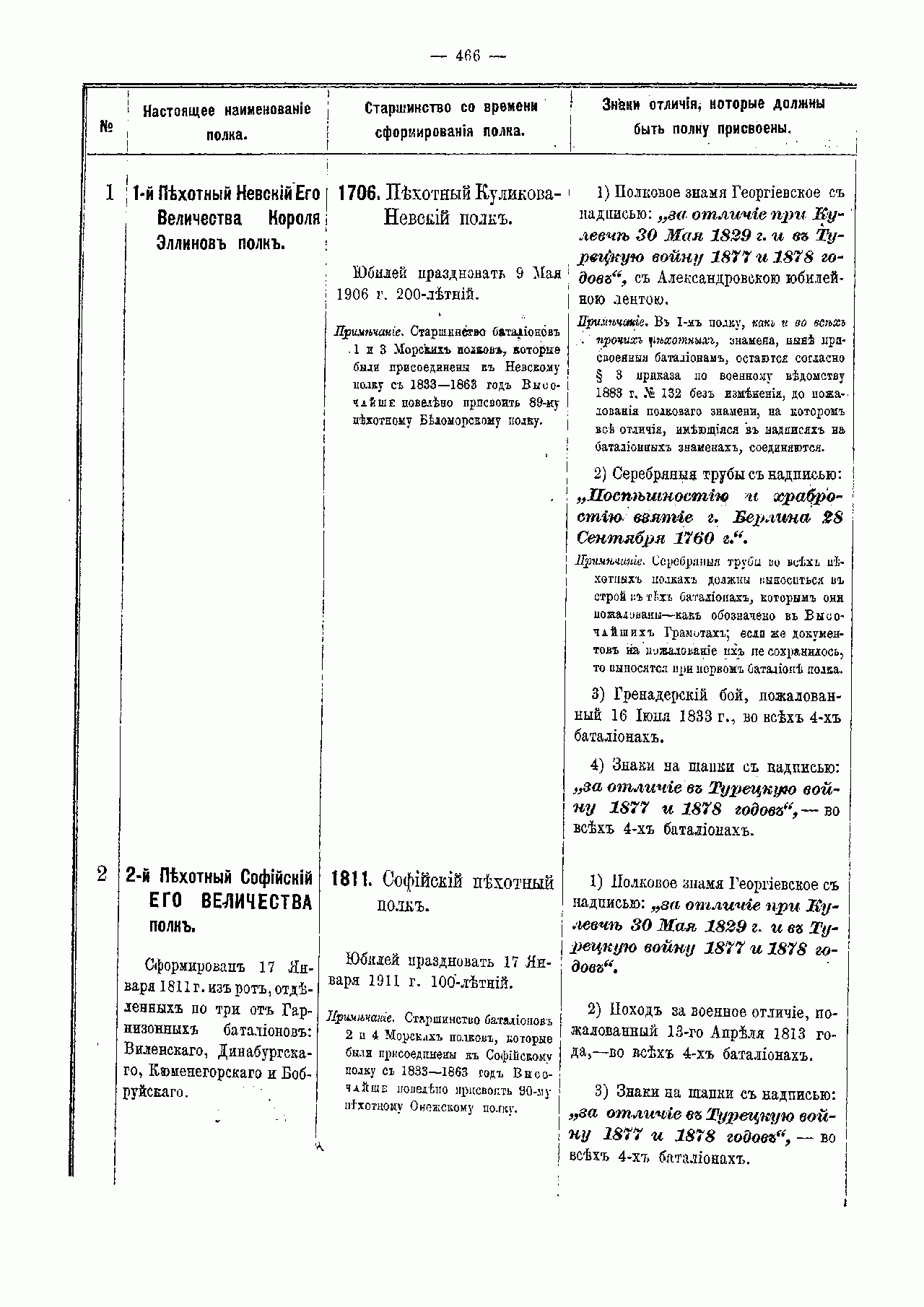 Данное издание представляет собой отдельно опубликованный Приказ по военному ведомству № 96 от 18 марта 1884 г., в соответствии с которым определялось старшинство и знаки различия всех 164-х пехотных полков Российской императорской армии, сформированных к этому времени. Этот акт был обусловлен необходимостью упорядочения исторической преемственности полковых формирований, что было уже проведено по отношению к полкам Гвардейского и Гренадерского корпусов, где всем батальонам было определено одинаковое старшинство. Приказ детально регламентирует все полковые награды и регалии, которыми награждался каждый отдельный пехотный полк за военные заслуги.