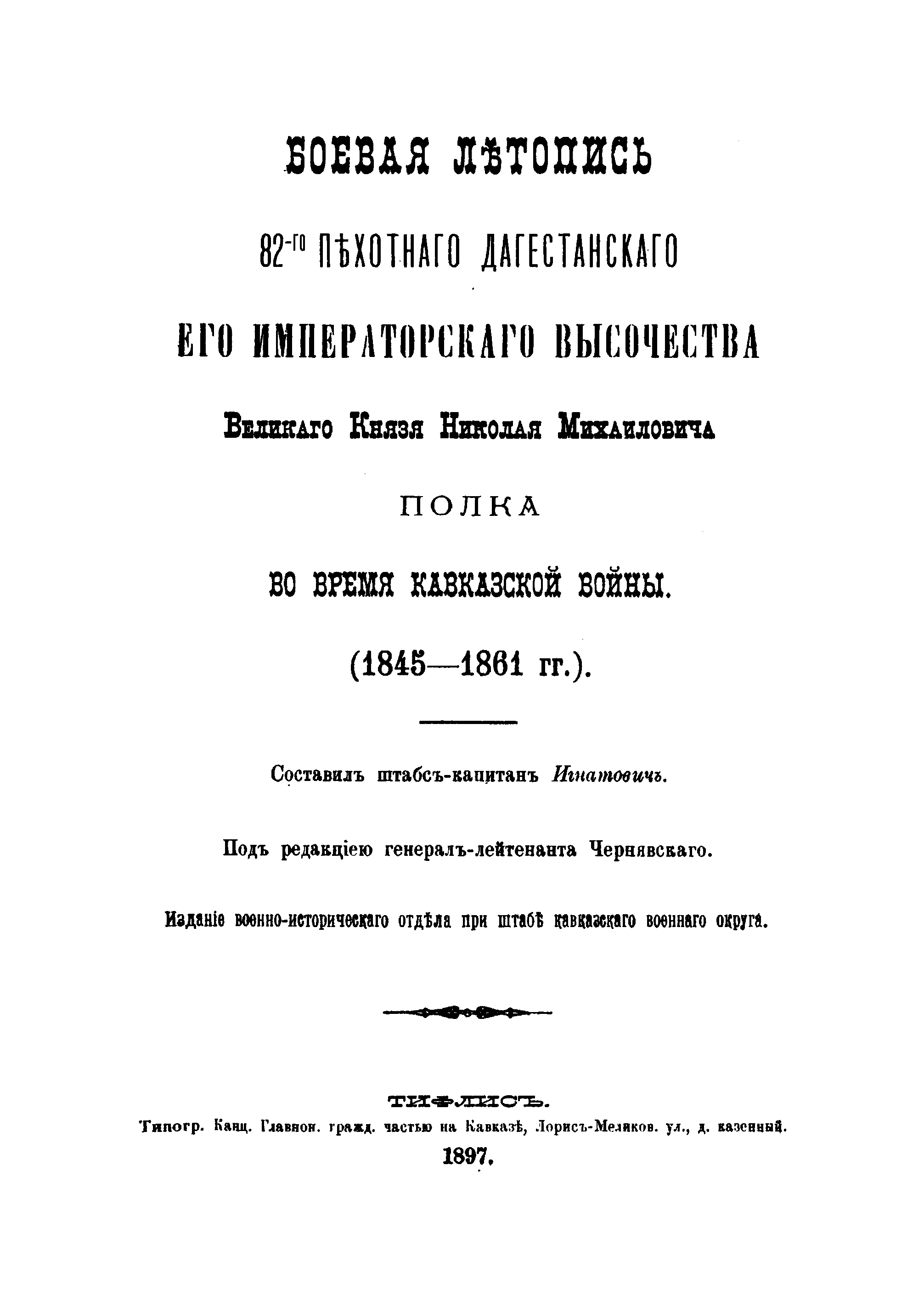 Боевая лѣтопись 82-го пѣхотнаго Дагестанскаго Его Императорскаго Величества Великаго князя Николая Михайловича полка во время Кавказской войны (1845-1861 гг.)