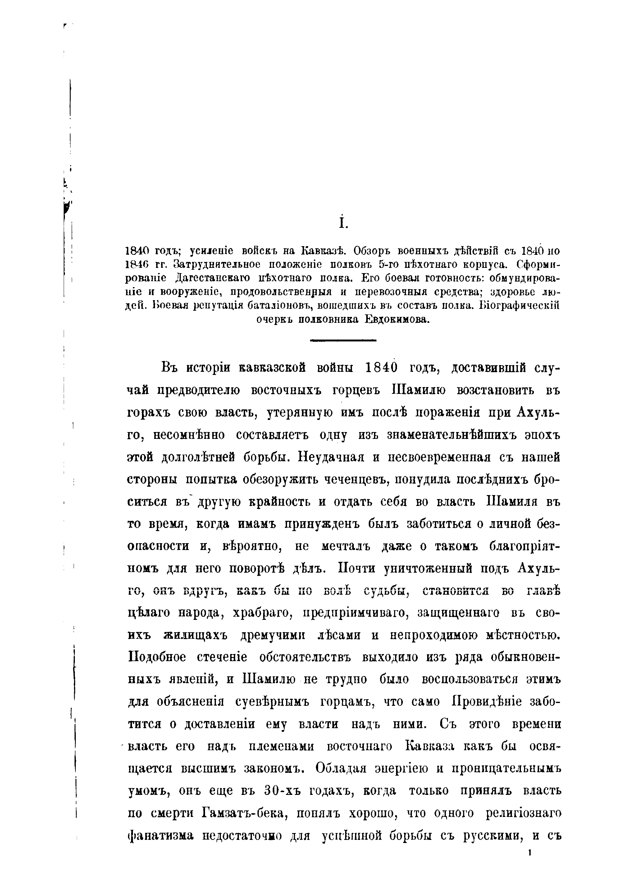 Книга содержит подробное освещение деятельности и боевых действий 82-го пехотного Дагестанского пехотного полка в ходе кампаний и походов Кавказской войны (1817-1864) в период с 1845 по 1861 гг. Дагестанский пехотный полк был создан в декабре 1845 г. из сильно поредевших частей Волынского, Минского и Модлинского пехотных полков, а также личного состава 11-голинейного Кавказского батальона. До 1847 г. возле селения Темир-Хан Шур («озеро Тамерлана») был построен укрепленный лагерь для полка. Части полка с 1846 по 1859 гг. регулярно участвовали в стычках и боях с горскими формированиями, его батальоны несли боевое дежурство на Кавказской линии. В августе 1859 г. 2-й батальон и стрелковые роты полка отличились при взятии аула Гуниб. Данное издание подготовлено в рамках деятельности по сбору, обработке материалов и обобщению опыта боевых действий на Кавказском ТВД, которая была поручена в 1886 г. военно-историческому отделу штаба Кавказского военного округа. Его возглавлял генерал-лейтенант И. С. Чернявский. После его кончины работу над частями издания, вышедшими из печати в Тифлисе, возглавлял начальник военно-исторического отдела округа полковник В. И. Томкеев.
