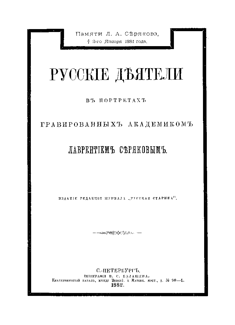 В 1882 г . коллектив исторического журнала «Русская старина», издававшегося в Санкт-Петербурге Михаилом Семевским, впервые соединил в отдельный сборник некоторые из портретов выдающихся русских деятелей, выгравированных знаменитыми русскими граверами. Издание имело большой успех у читателей и было переиздано в 1886 г. Портреты сопровождаются биографическими очерками, составленными, по большей части, по материалам «Русской Старины». Все биографии составлены полно и обстоятельно. Сборник повествует о высокопоставленных особах, историках, священнослужителях, писателях, генералах, композиторах, певцах – блестящих представителях своей эпохи от святого князя Владимира до Муравьева-Апостола и Бестужева. Биографические заметки и очерки, сопровождающие портреты третьего издания, были составлены постоянной (с 1874 г.) сотрудницей «Русской старины» В. В. Тимощук.