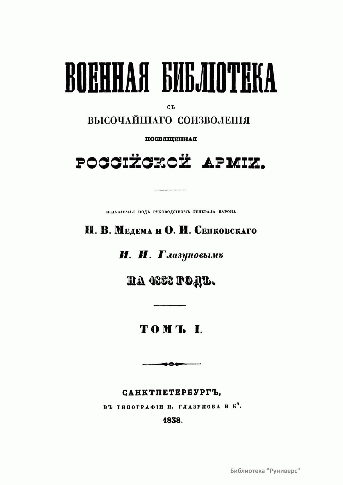 Военная библiотека, съ высочайшаго соизволенiя посвященная россiйской армiи