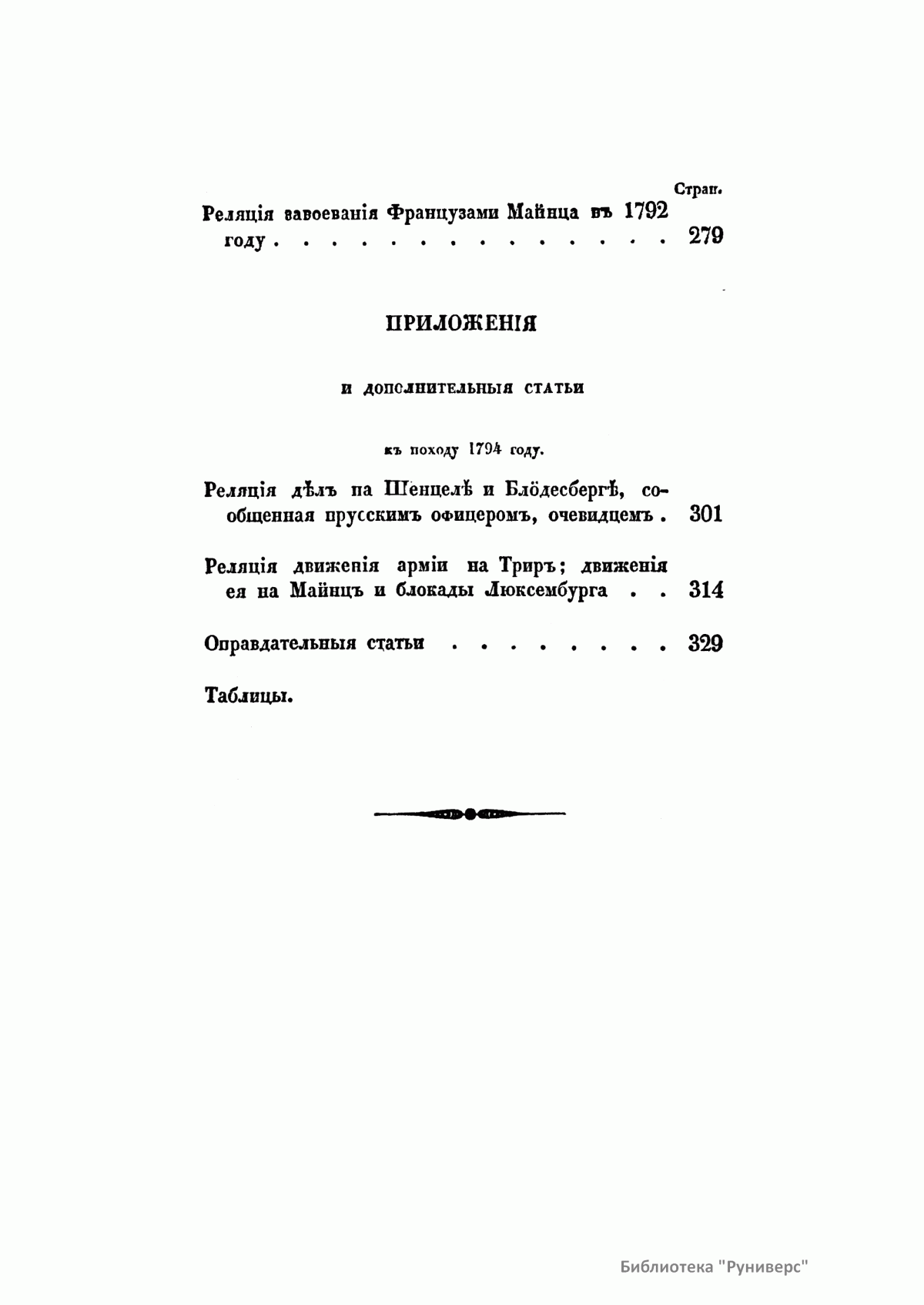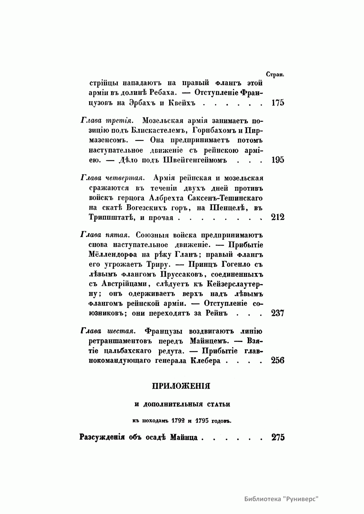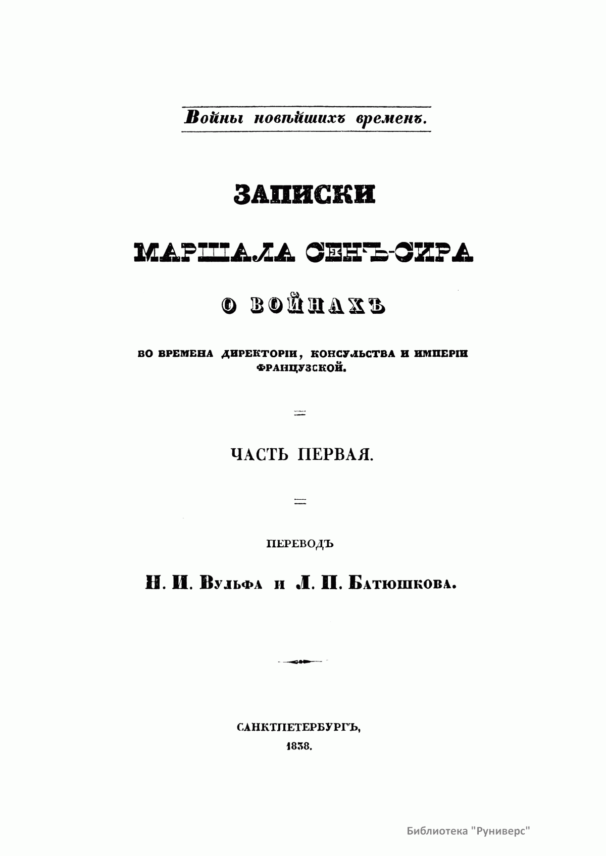 Первый том – Записки маршала Сен-Сира о войнах во времена директории, консульства и империи французской. Часть первая. Второй том – Сочинение Брандта. Обозрение истории военного искусства в средних веках. Третий том – История войн в Европе с 1792 г. вследствие перемены правления во Франции. Четвертый том – Сочинение Маккиавелли. Военное искусство. Пятый том – Записки маршала Сен-Сира о войнах во времена директории, консульства и империи французской. Части вторая и третья. Шестой том - Записки маршала Сен-Сира о войнах во времена директории, консульства и империи французской. Части третья (продолжение) и четвертая.