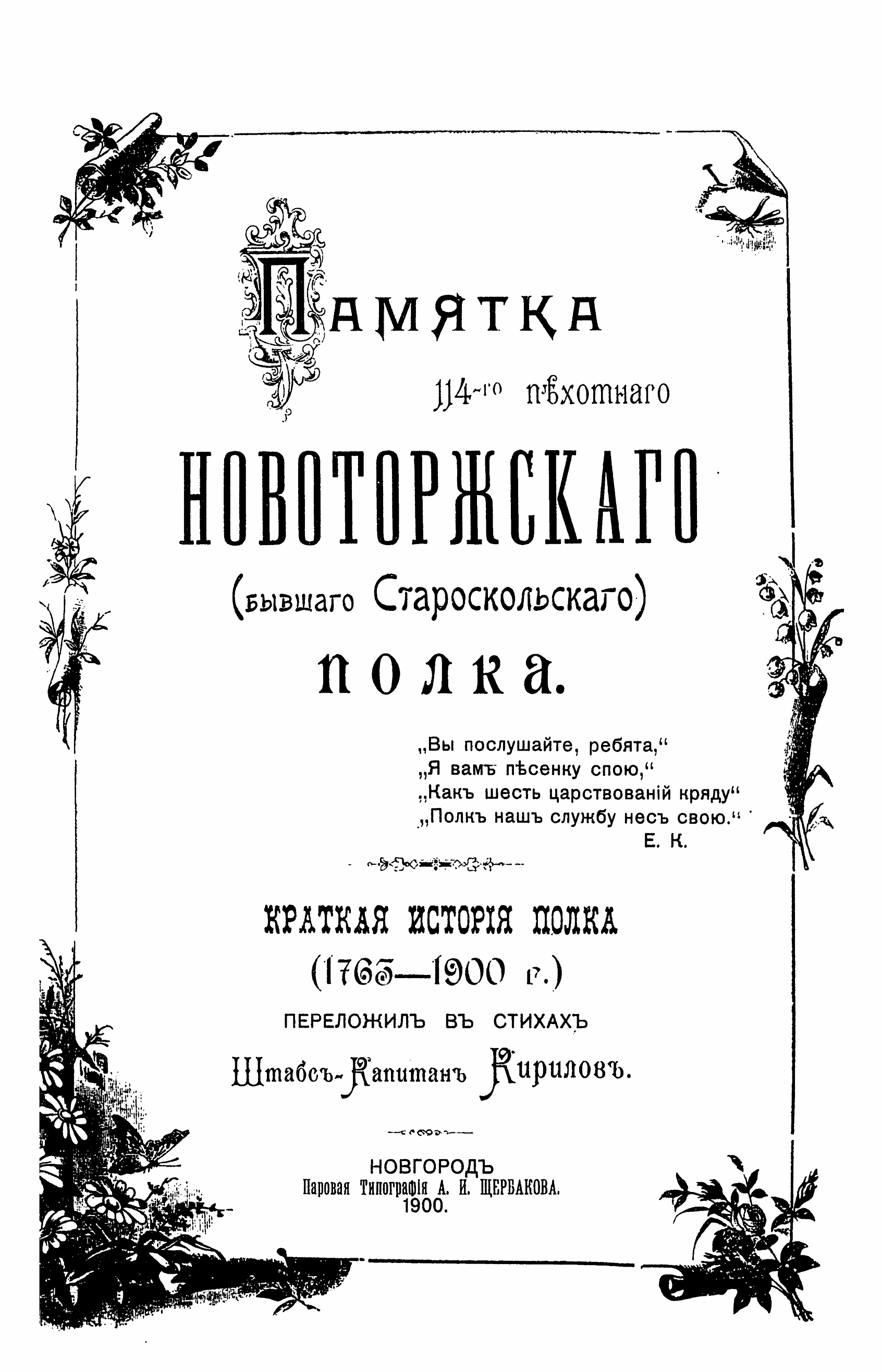 Памятка 114-го пѣхотнаго Новоторжскаго (бывшаго Староскольскаго) полка
