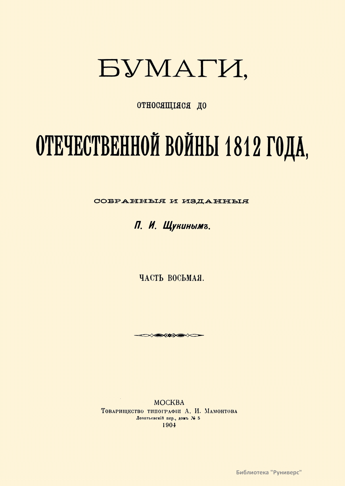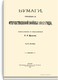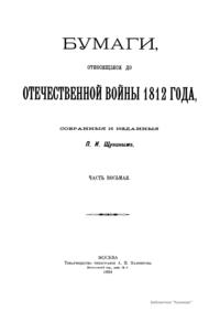 Многочисленные документы, собранные и изданные П.И. Щукиным, относятся к Отечественной войне 1812 года. В издании опубликованы донесения, отчеты, указы, описи, письма разных лиц, протоколы, постановления, предписания, прошения и т.д. В этих бумагах содержатся подробности, которые невозможно встретить ни в одном учебнике истории и которые, будучи собранными вместе, и составляют подлинную картину российской истории начала XIX века.