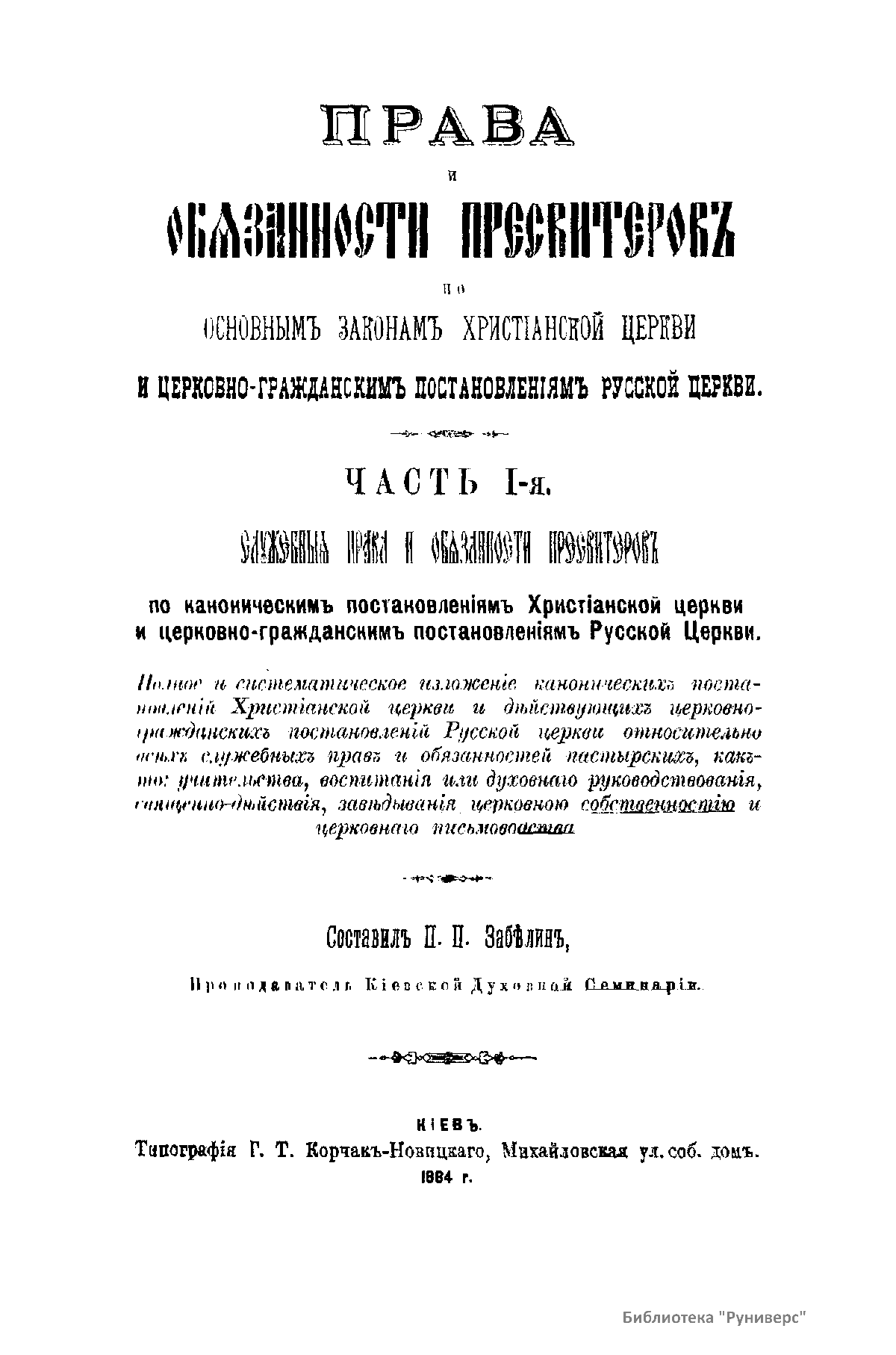 Права и обязанности пресвитеровъ по основнымъ законамъ Христiанской Церкви и церковно-гражданскимъ постановлениямъ Русской Церкви