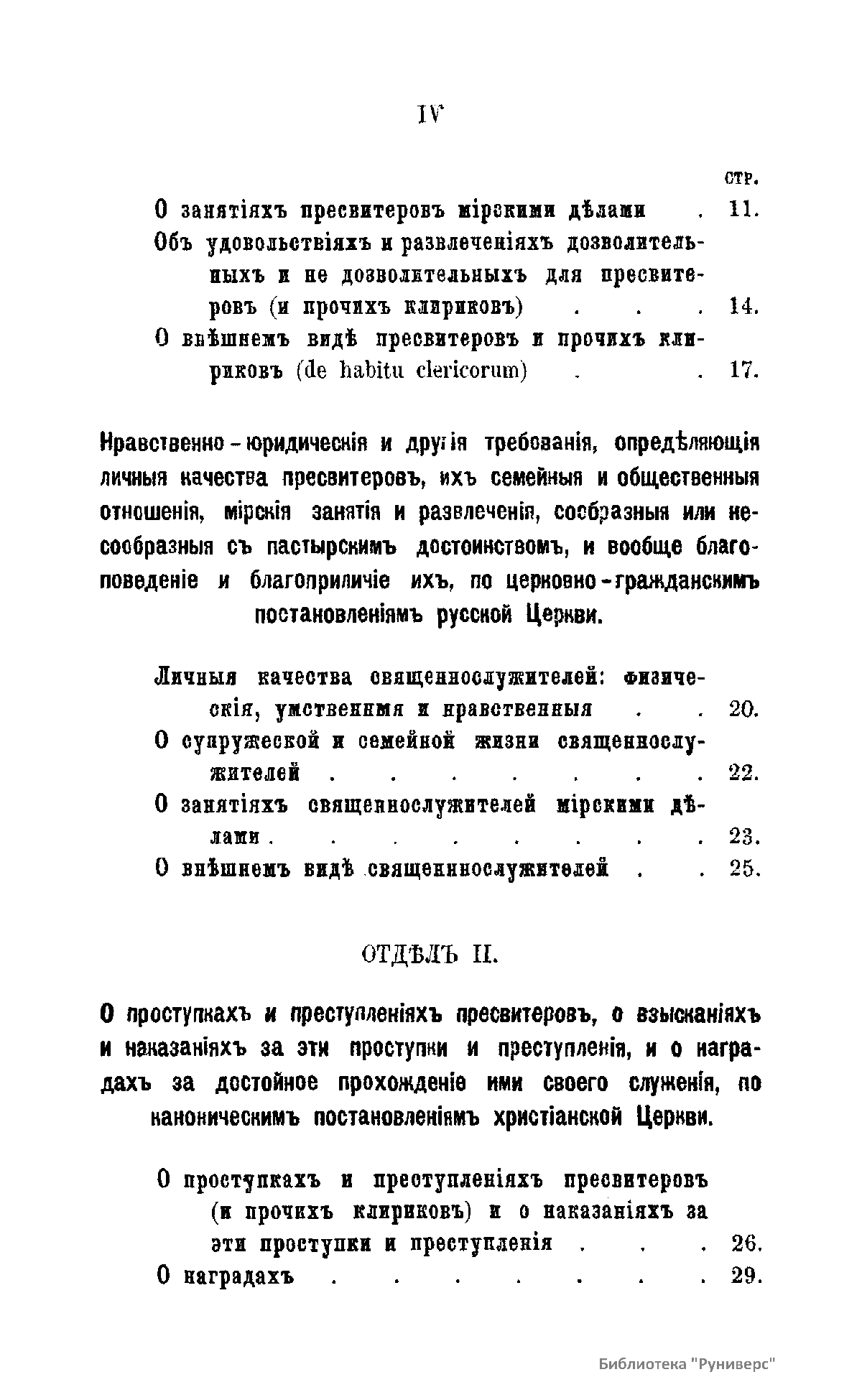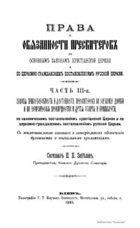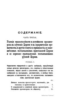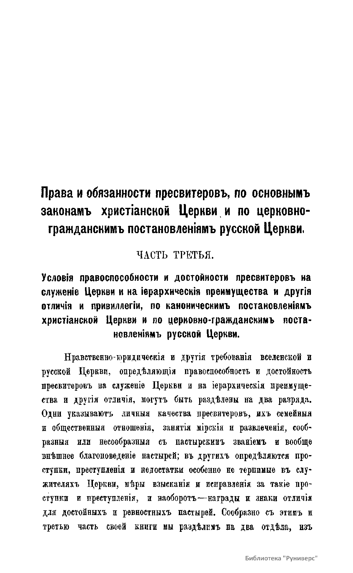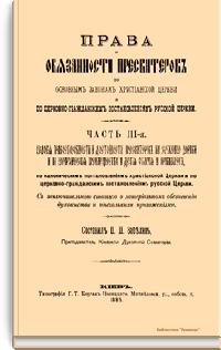 Права и обязанности пресвитеровъ по основнымъ законамъ Христiанской Церкви и церковно-гражданскимъ постановлениямъ Русской Церкви. Часть III-я. Условiя правоспособности и достойности пресвитеровъ на служенiе Церкви и на iерархическiя преимущества и другiя отличiя и привилегiи