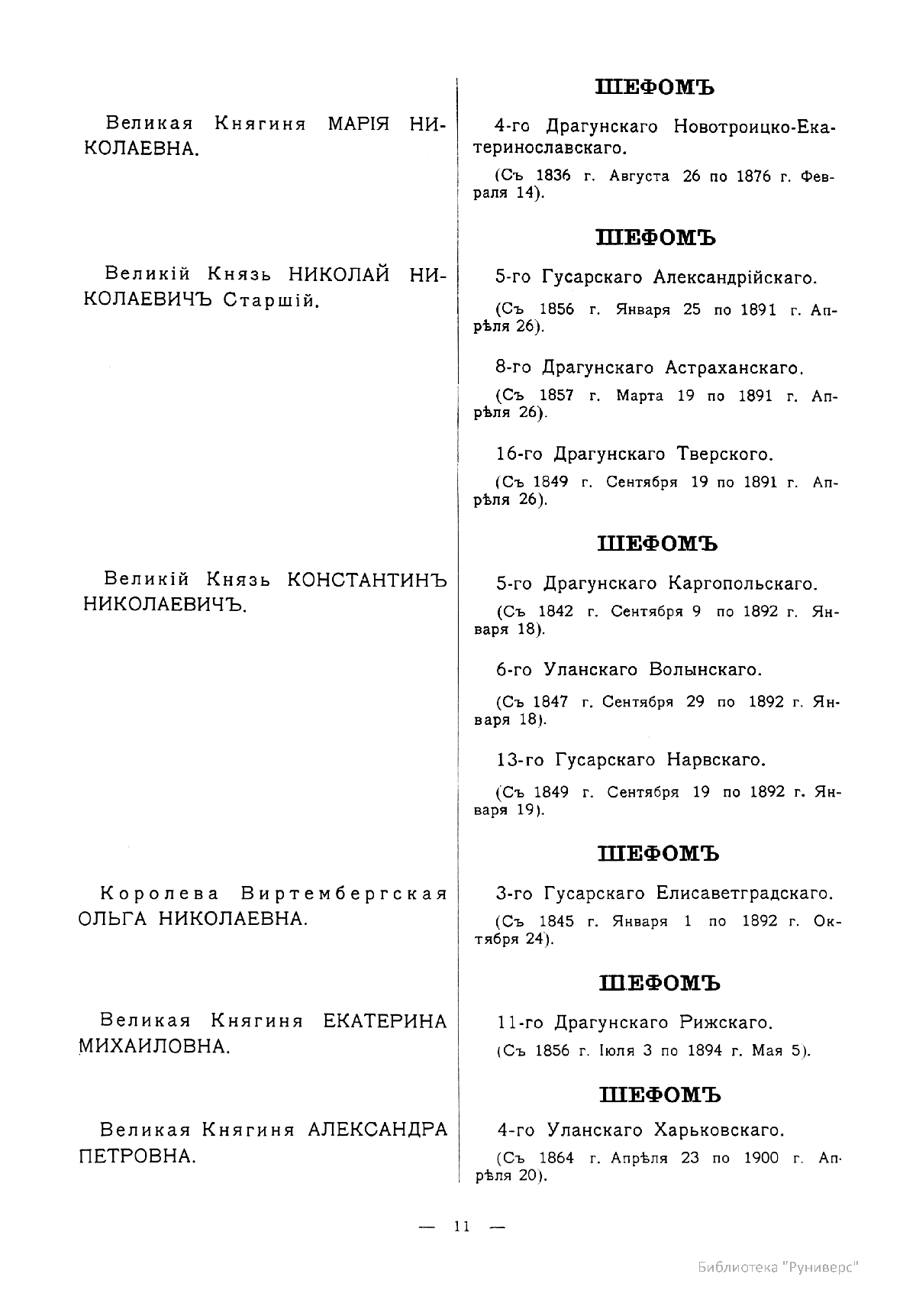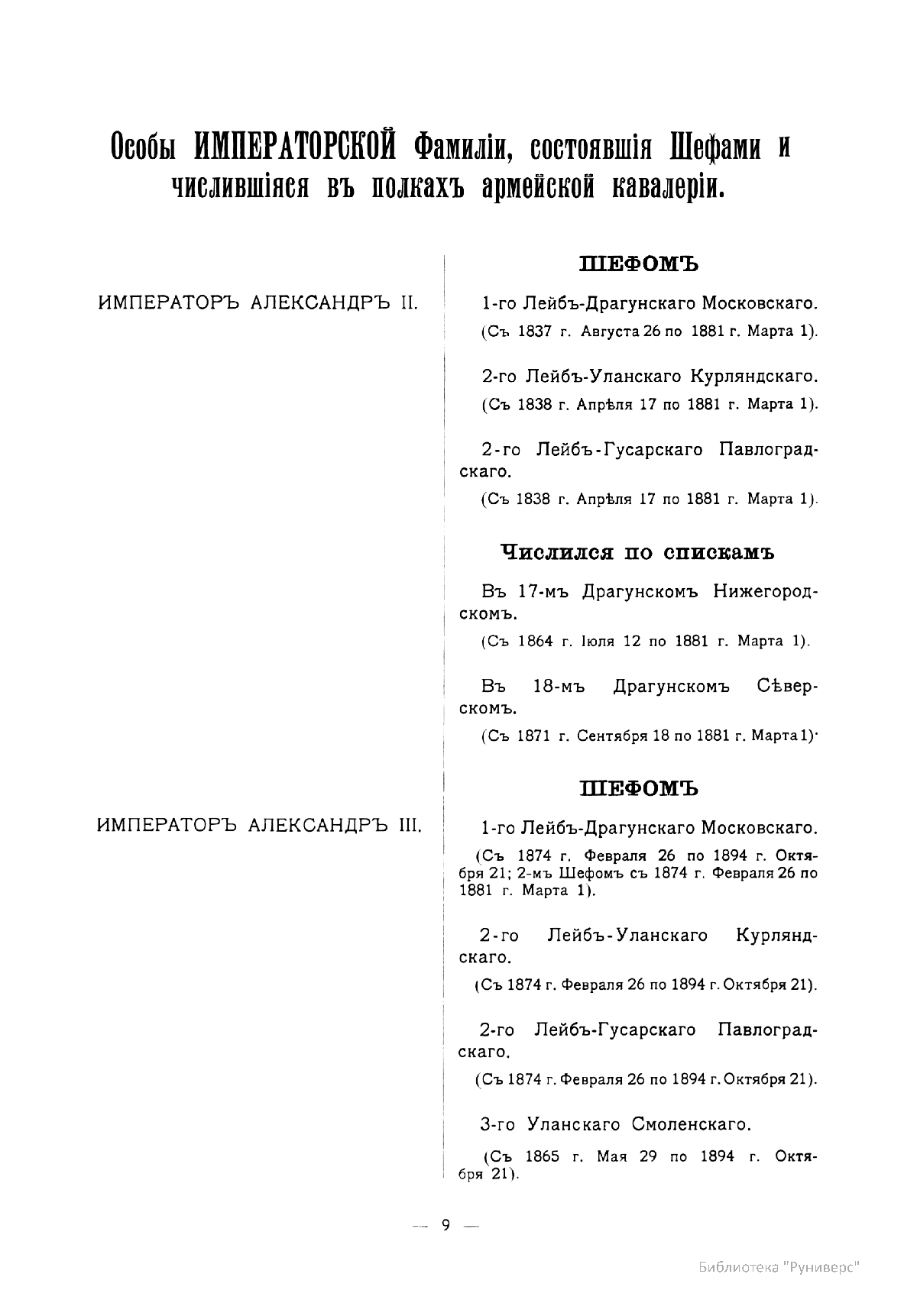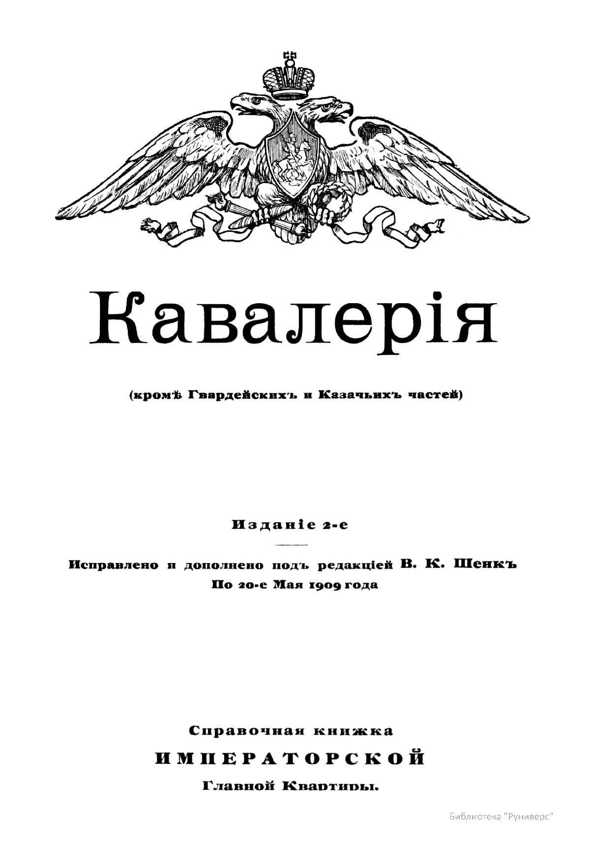 Краткие истории кавалерии русской армии, наименования и переименования, командиры, шефы, боевой путь, награды кавалерийских частей. Широко известные цветные таблицы униформы, составленные В. К. Шенком.
