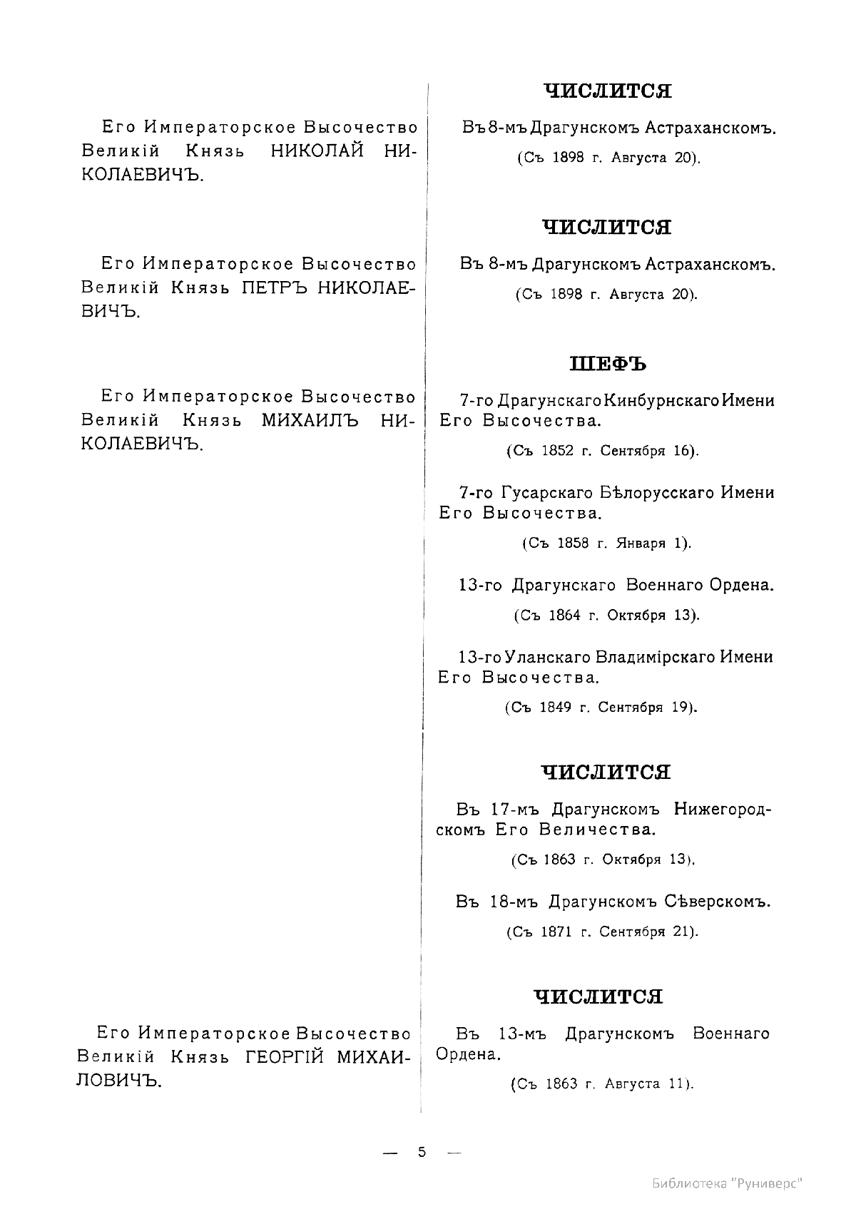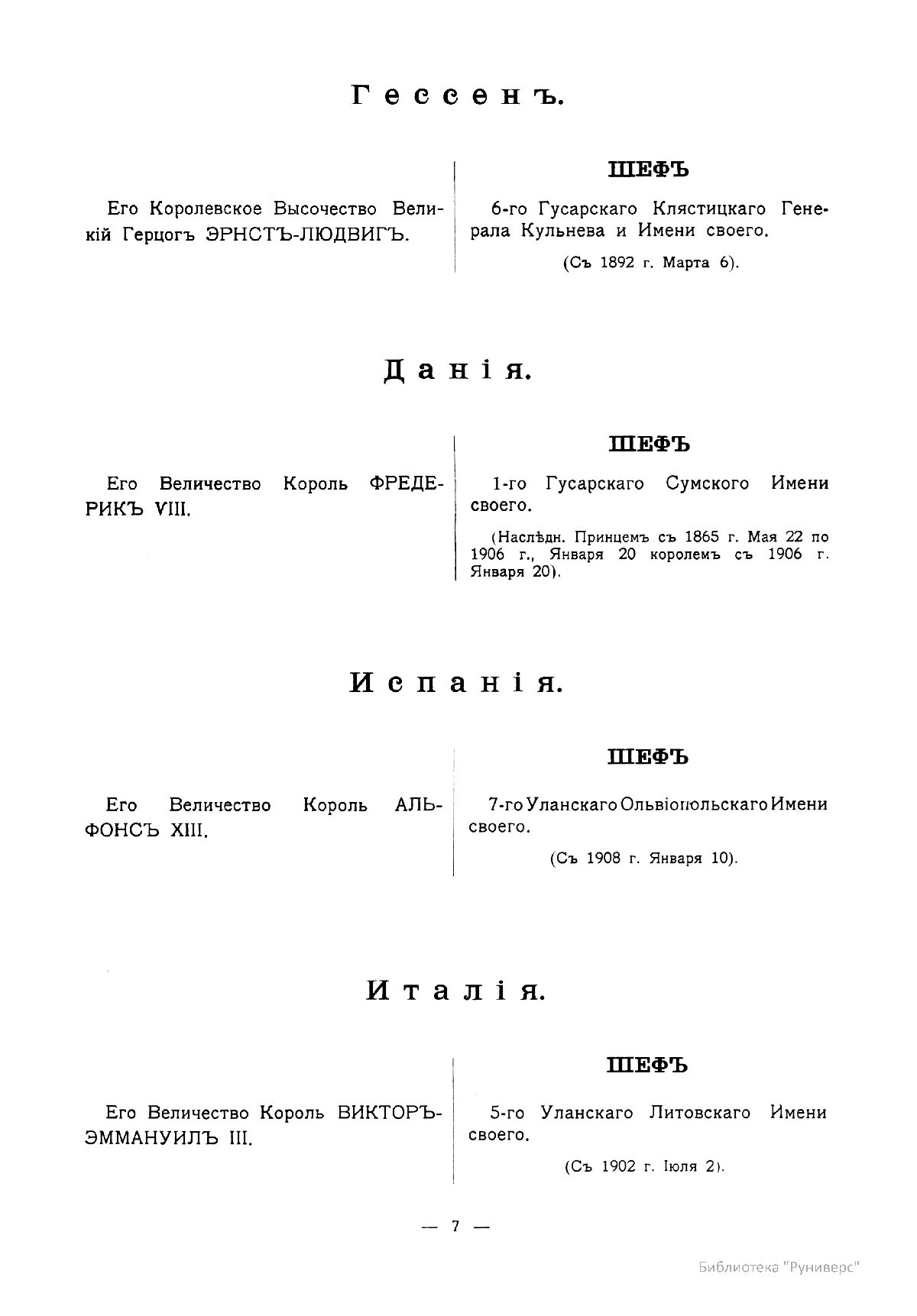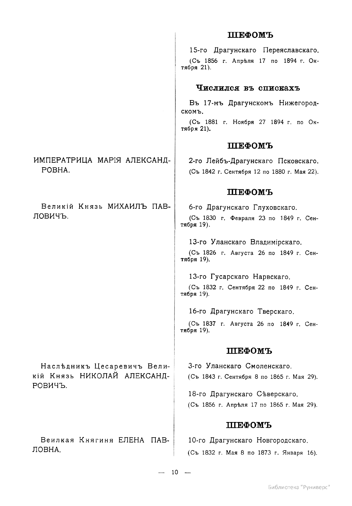 Краткие истории кавалерии русской армии, наименования и переименования, командиры, шефы, боевой путь, награды кавалерийских частей. Широко известные цветные таблицы униформы, составленные В. К. Шенком.