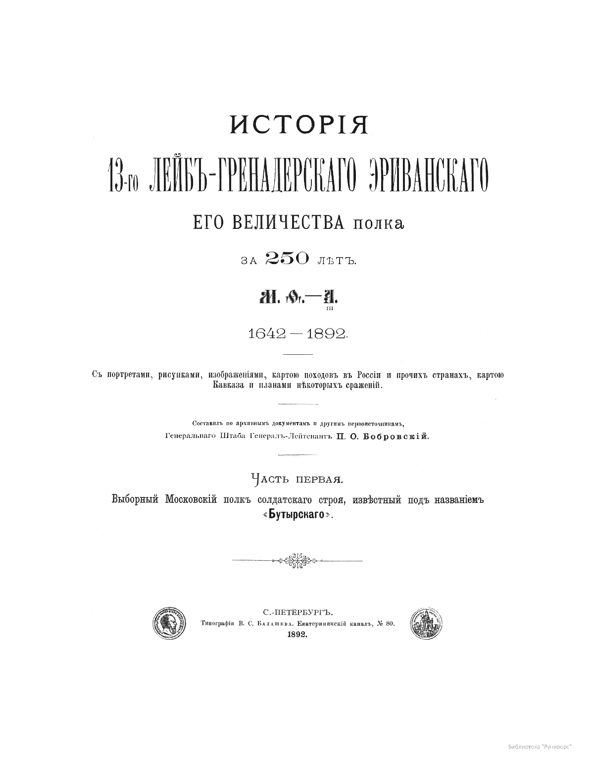 В 1892 году в Санкт-Петербурге вышло в свет пятитомное издание Генерального Штаба генерал-лейтенанта Павла Осиповича Бобровского, посвященное 250-летию 13-го лейб-гренадерского Эриванского eго величества полка – старейшего из регулярных полков российской армии.