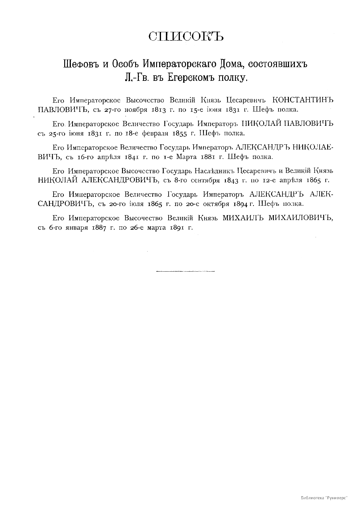 В 1896 г. вышло в свет двухтомное юбилейное издание «История лейб-гвардии Егерского полка за сто лет: 1796–1896», составленное офицерами полка на основании архивных документов, статей из периодических изданий и мемуаров.